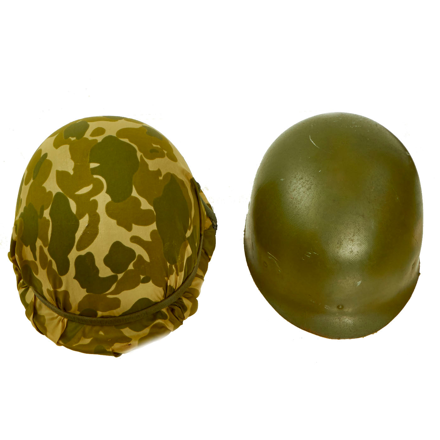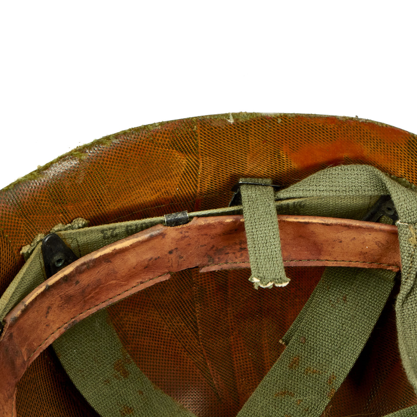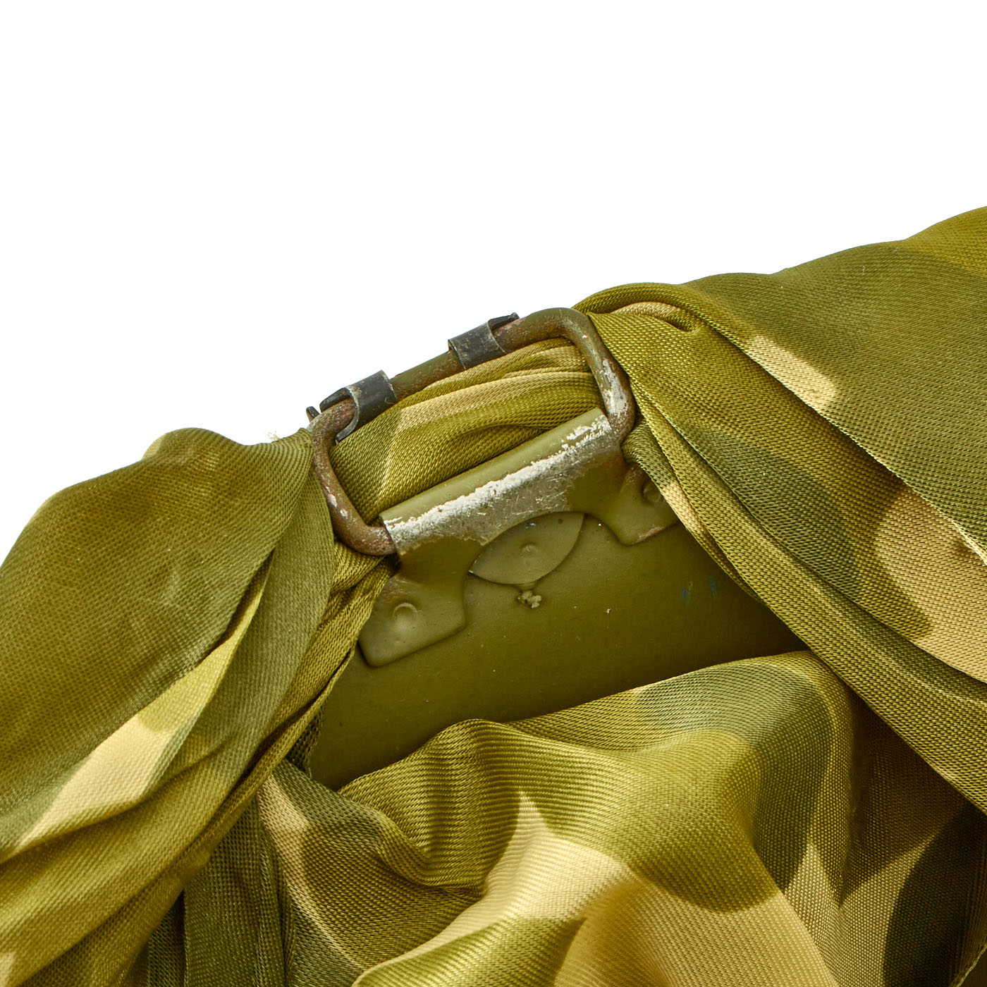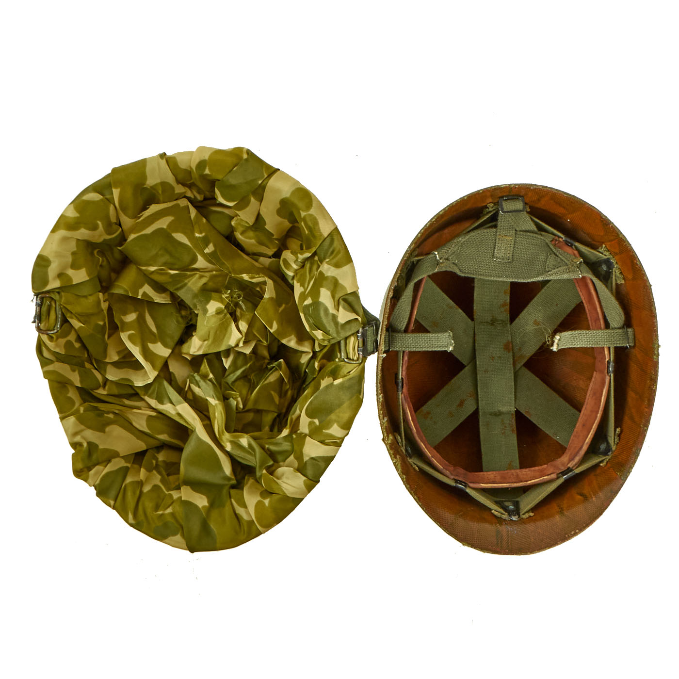 This helmet is a fine example and still retains all of its original Vietnam War parts and the shell has all original corked grain paint. The cover used is a section of parachute canopy silk. It was a common practice during WWII, Korea and the Vietnam War to use canopy silk as a helmet cover when one was needed. This cover does not appear to be field used and was more than likely a later addition.