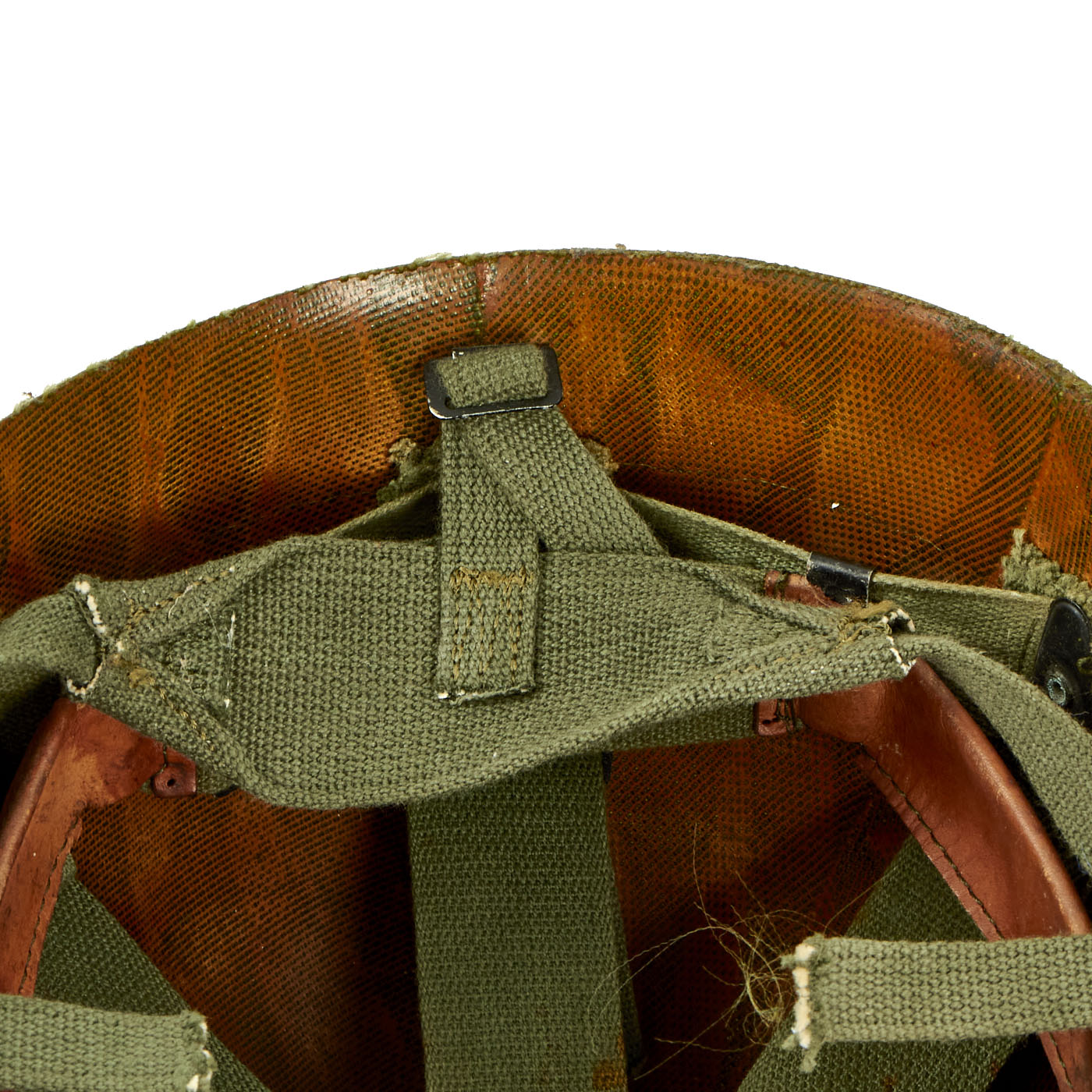 The liner is a correct high pressure 1960s issue liner with a replaced 1973 dated sweatband. The rigging is intact and in great shape, with original markings visible on the sweat band, and just a bit of cracking on the sweat band leather. The rear lower nape strap is present. The liner itself shows honest wear in a hot, humid, environment, but is in good condition overall.