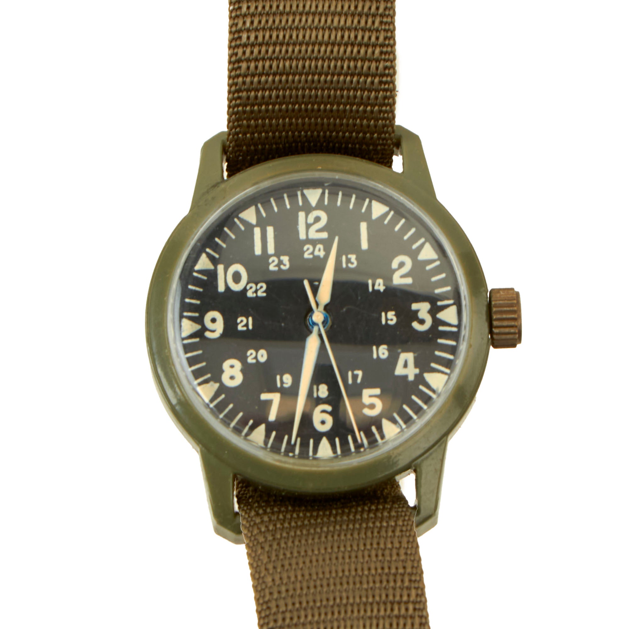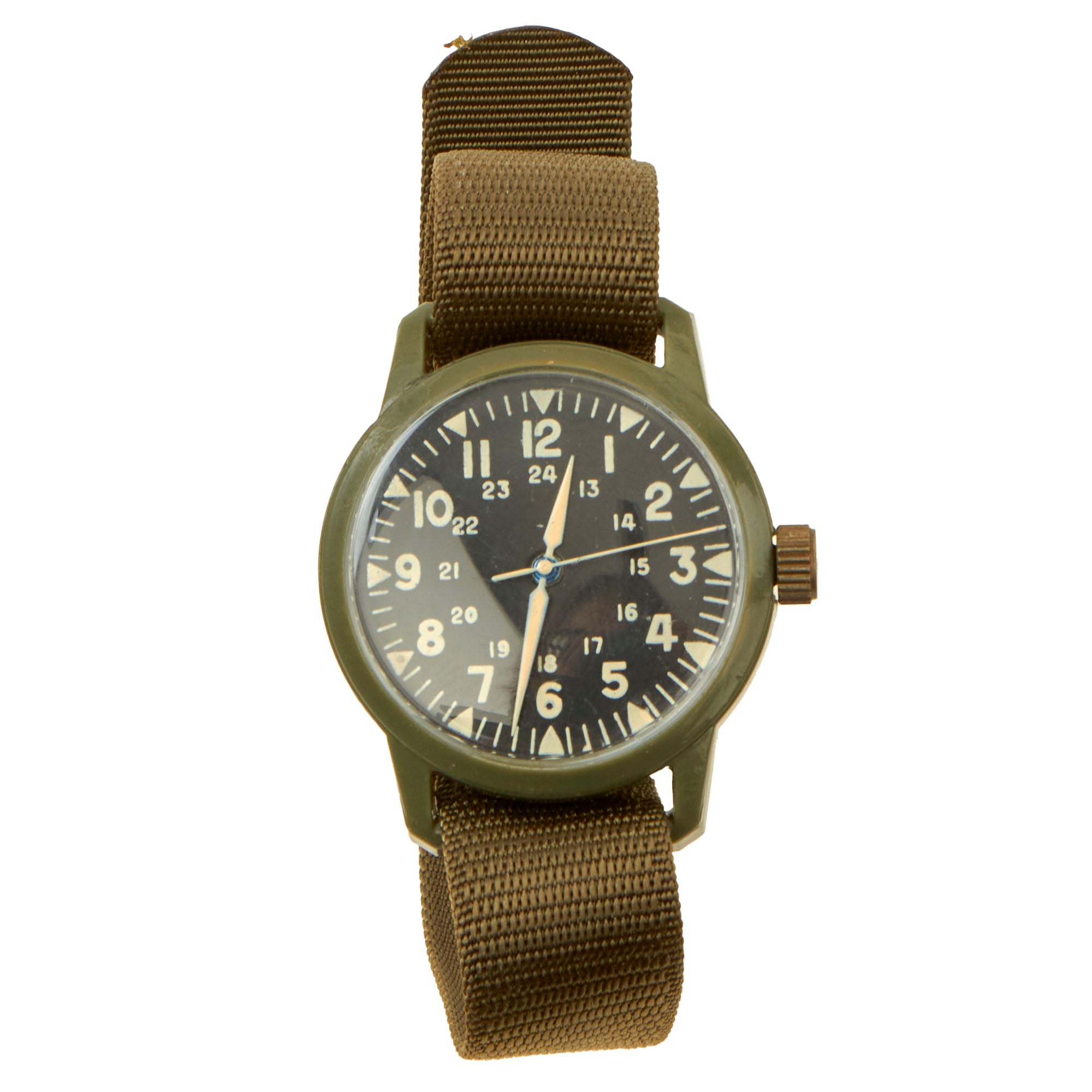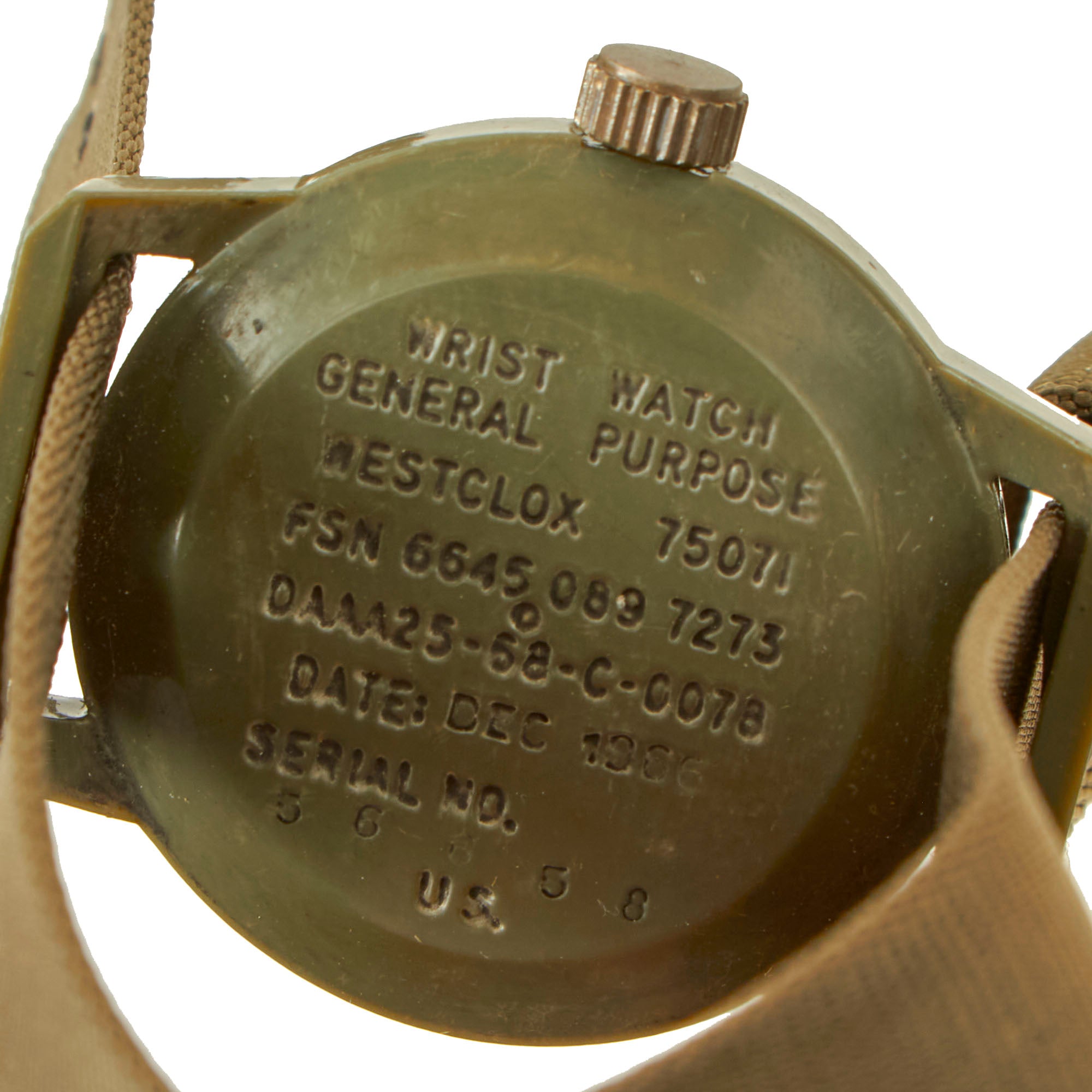 Original Item: Only One Available. There is no warranty for this watch and returns for a non-working watch will not be honored. Please note all watches are wound and tested before shipment. We are not in the watch repair business- ALL SALES ARE FINAL.This is a great Vietnam War General Purpose wristwatch in excellent functional condition. The watch has its original band which shows heavy usage, very rare to find. The back of the watch is marked:WRIST WATCHGENERAL PURPOSEWESTCLOX 75071FSN 6645-089-7273DAAA25-68-C-0078DATE: DEC 1966SERIAL NO.56658U.S.The Vietnam War was a long, dark period in American military history. Primarily a conflict between North and South Vietnam, and by proxy the communist and anti-communist allies, this 20 year conflict came at the cost of 3 million human lives, most of them civilian.U.S. involvement began in 1954 and ended when Nixon ordered the withdrawal of U.S. forces in 1973. For enthusiasts of mechanical watches and military history, this period of time produced a plethora of interesting military watches with real historical provenance. From the military specific field watches produced by Bulova, Elgin and Benrus to the civilian dive and pilot watches acquired by troops at Post Exchanges.Most of the mil-spec watches produced during this time period were “non-maintainable”, or essentially disposable like this example. They were designed to last for two years and be replaced after they quit working. Considering the rigors of combat that these watches were subjected to, it’s a miracle that this example even survived at all!Since “military-spec” watches were not issued to troops, many servicemen acquired their own personal watches during R&R at one of the foreign military bases. Seiko watches in particular were incredibly popular, being both relatively affordable and unobtainable in the U.S., it was common to see a Japanese dive or field watch on the wrist of an American service member.This example is in lovely functional condition with all original components. The band is stamped STAINLESS STEEL on the buckle. The watch is in great functional condition with what we believe to be the original band.Comes ready to wear or display!