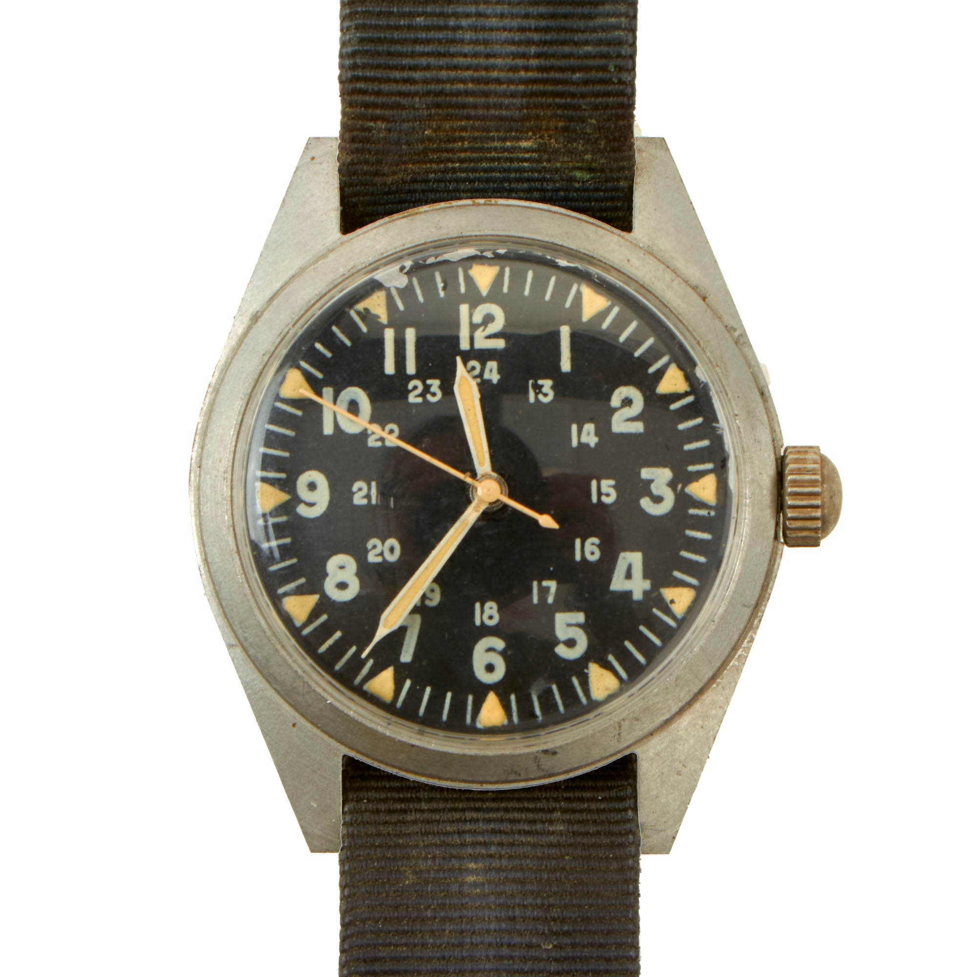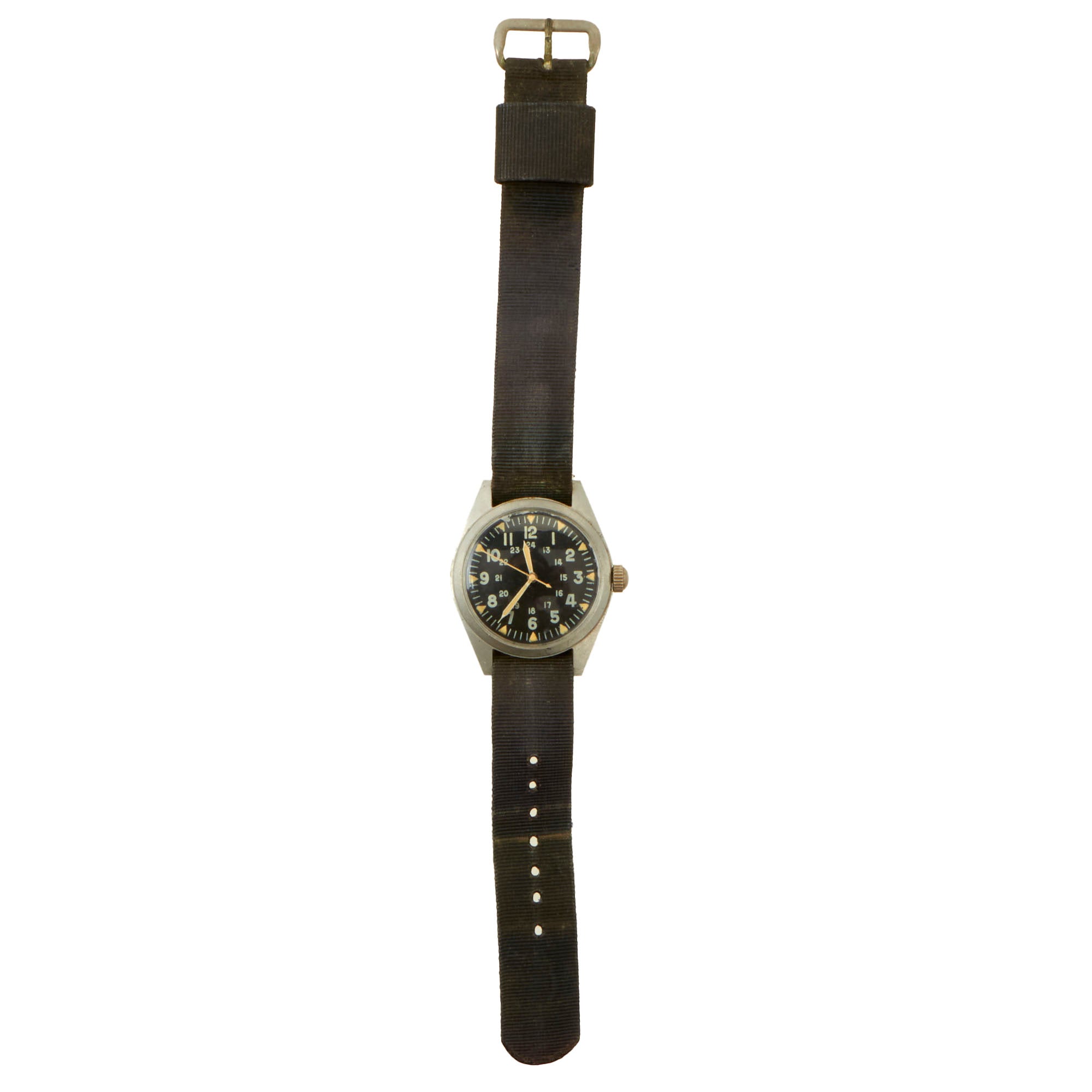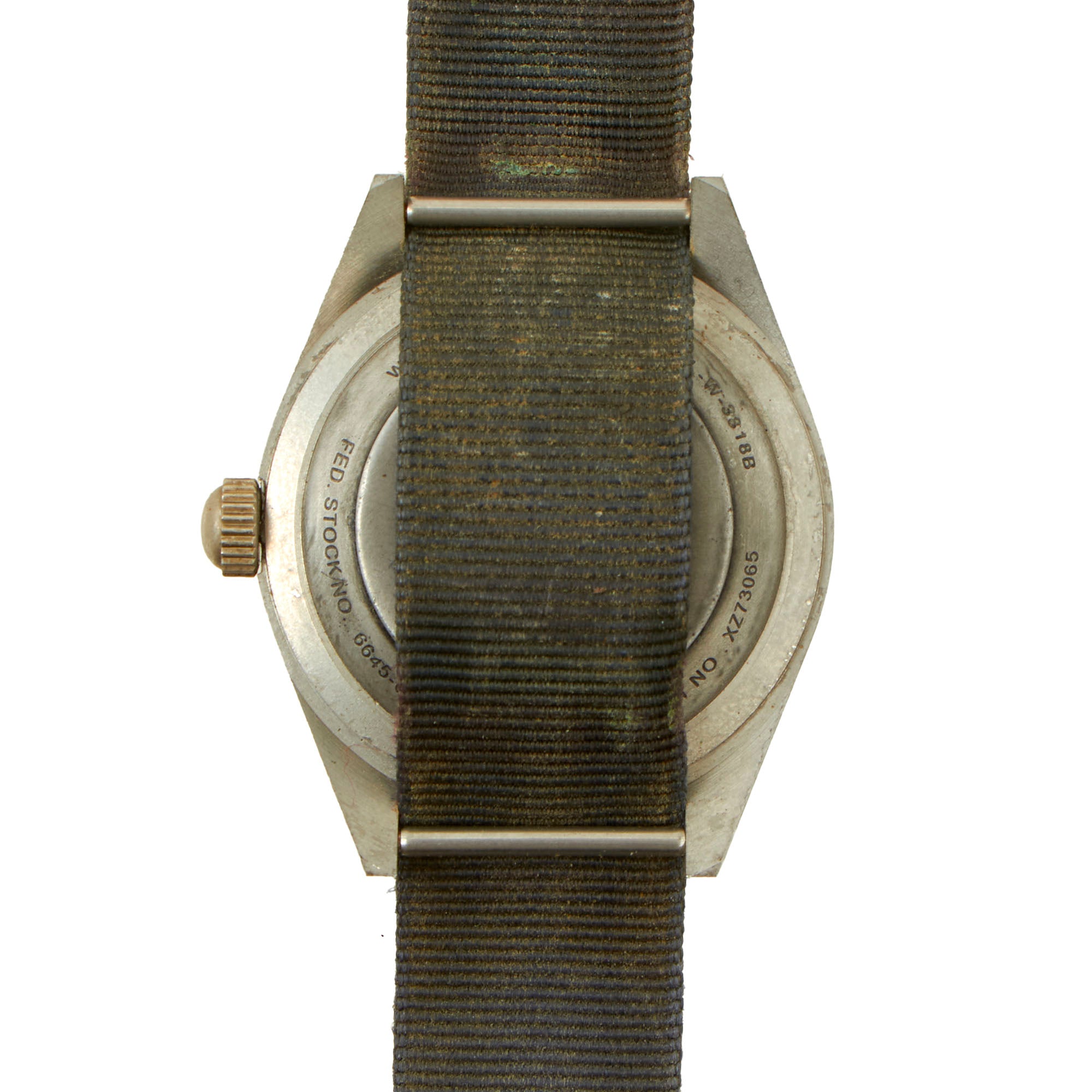 This is a great Vietnam War wristwatch in excellent functional condition. The watch has its original band which shows heavy usage, very rare to find. The back of the watch is marked: