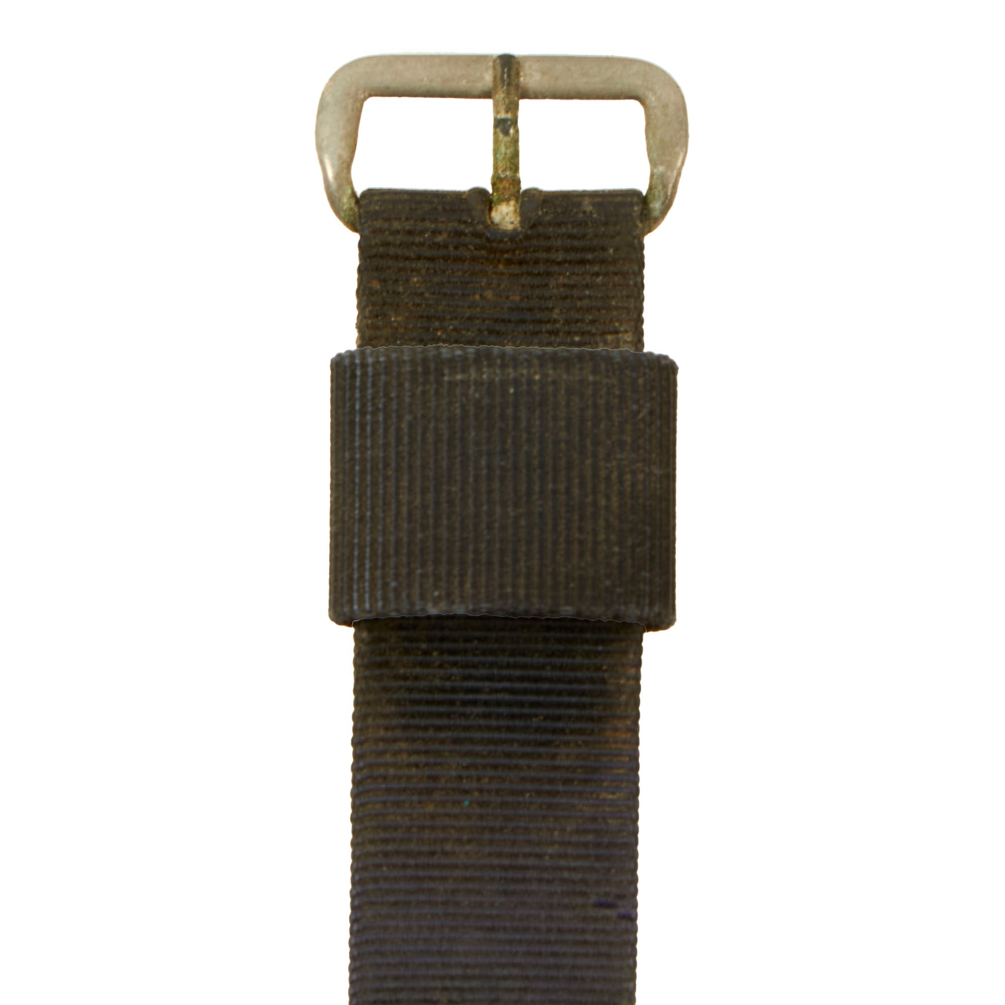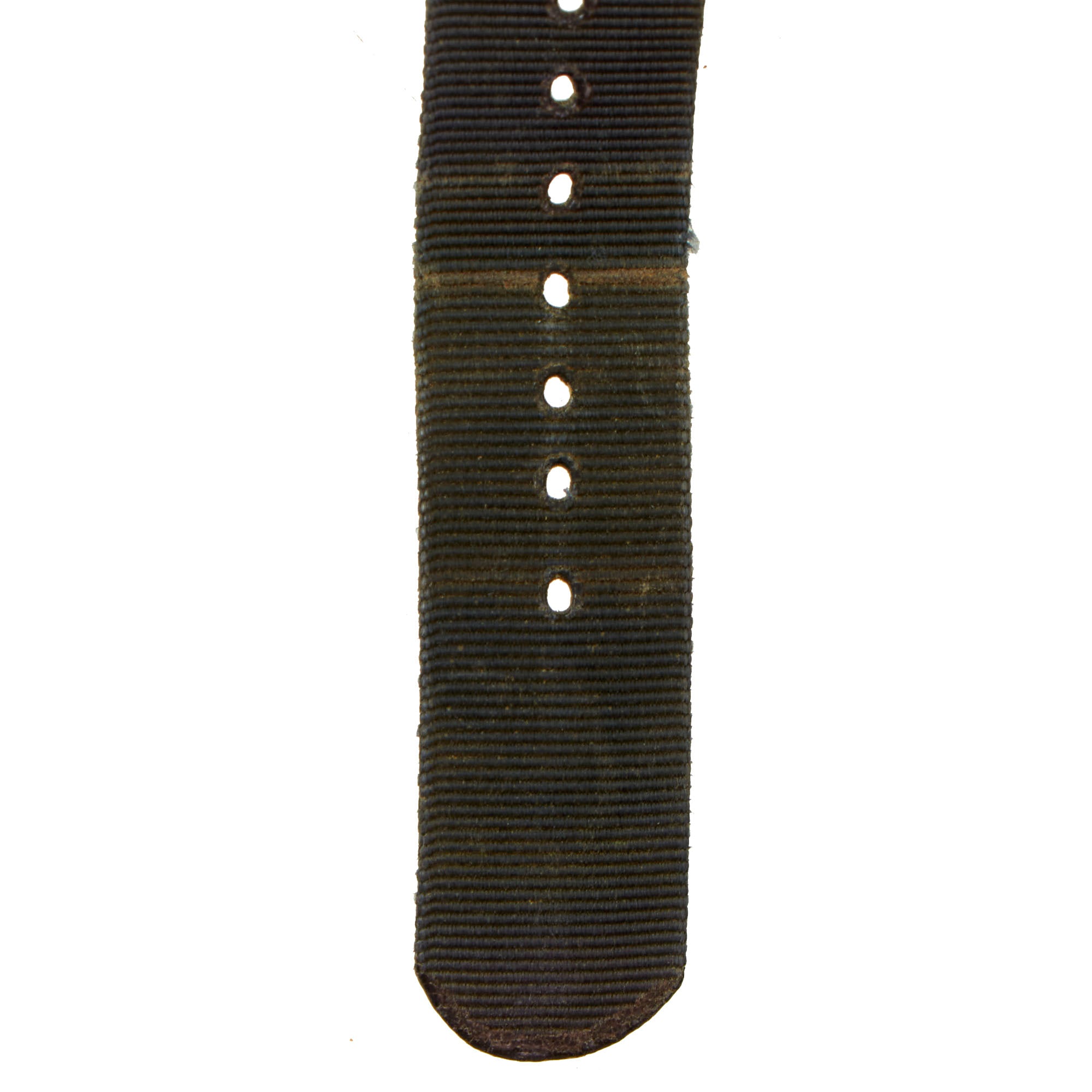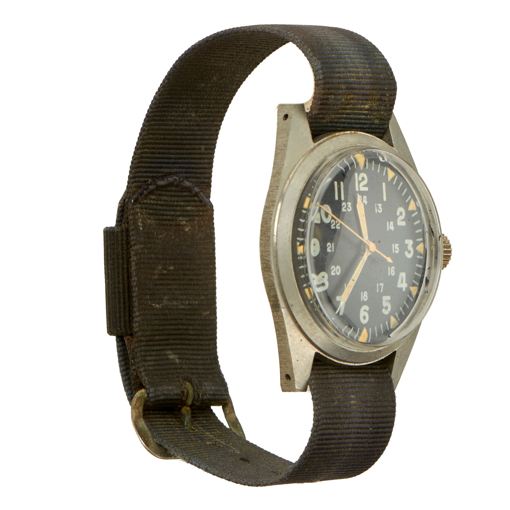 This is a great Vietnam War wristwatch in excellent functional condition. The watch has its original band which shows heavy usage, very rare to find. The back of the watch is marked: