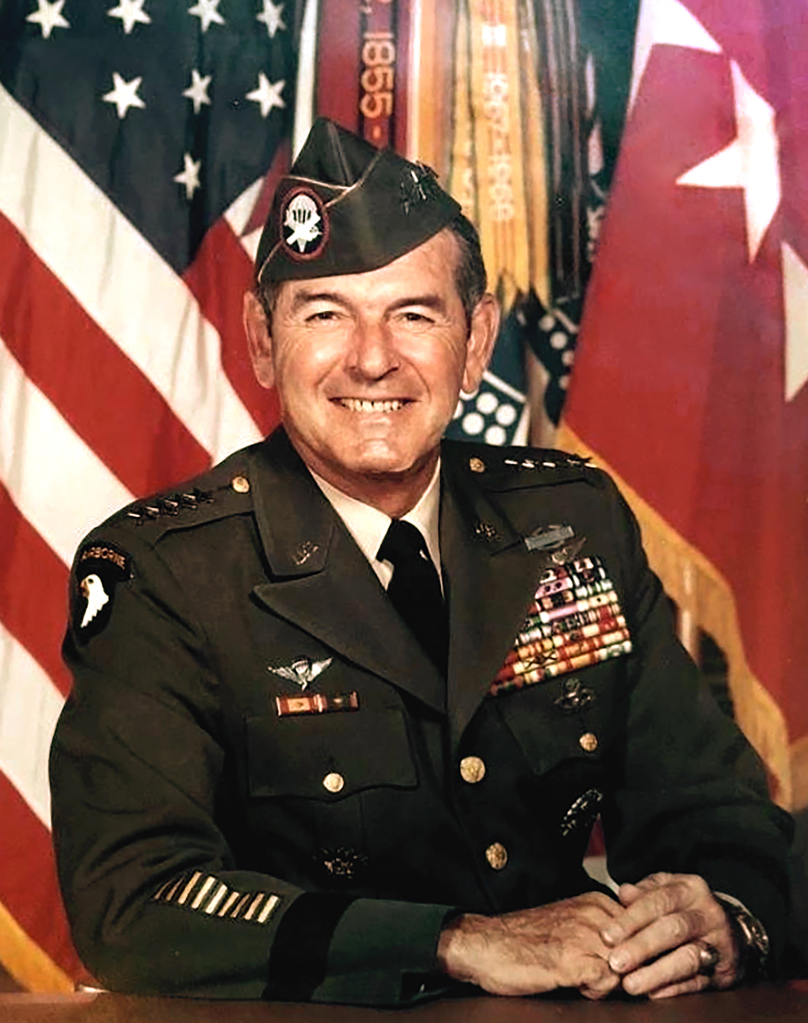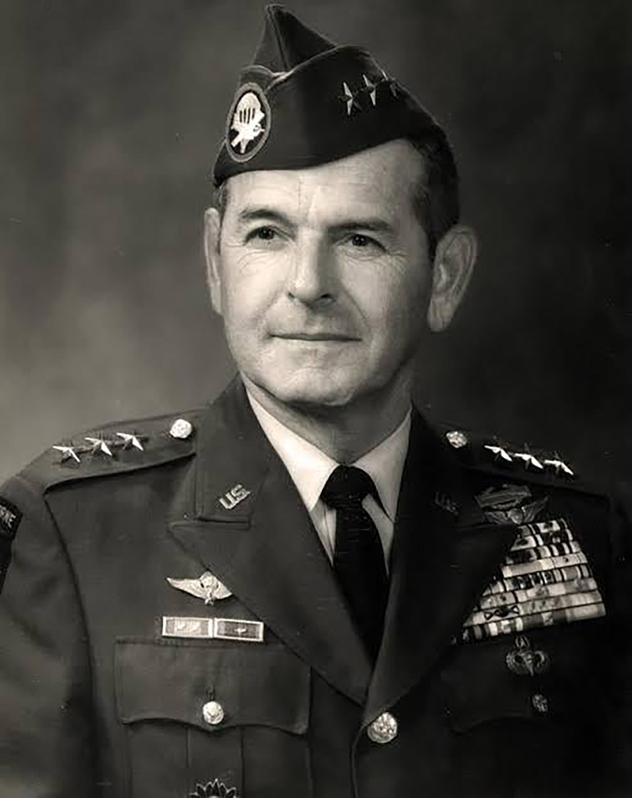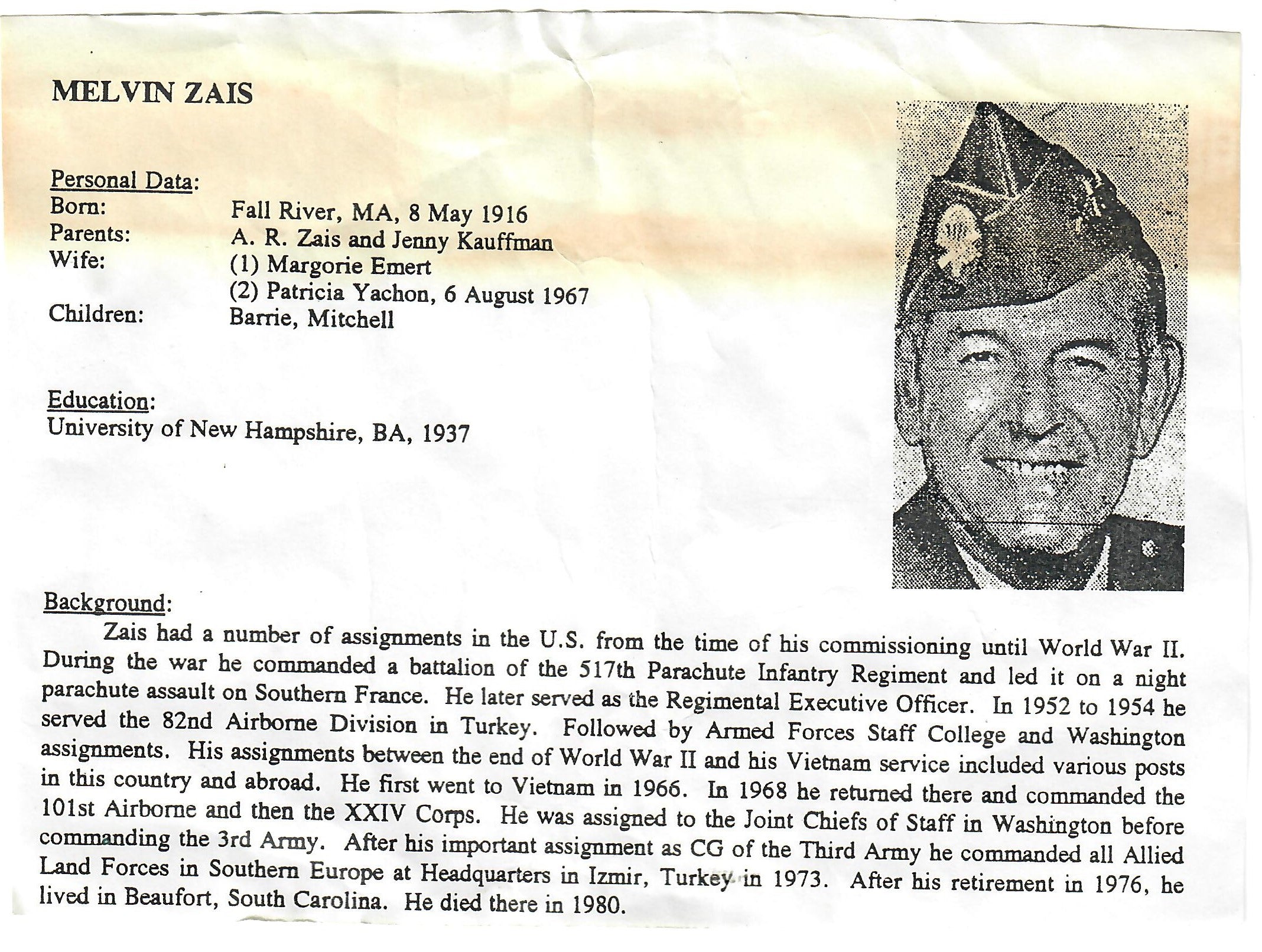 Melvis Zais was born on May 8th, 1916, in Fall River, Massachusetts. He graduated from the University of New Hampshire in 1937. He joined the U.S. Army prior to WWII and during the war, he commanded a battalion of the 517th Parachute Infantry Regiment and led it on a night parachute assault on Southern France. He was in Vietnam in 1966 and again in 1968, when he commanded the 101st Airborne and later the XXIV Corps. He was assigned to the Joint Chiefs of Staff in Washington before commanding the 3rd Army. After his important assignment of Commanding General of the Third Army, he commanded all Allied Land Forces in Southern Europe at Headquarters in Izmir, Turkey in 1973. After his retirement in 1976, he lived in Beaufort, South Carolina. He died there in 1980.
