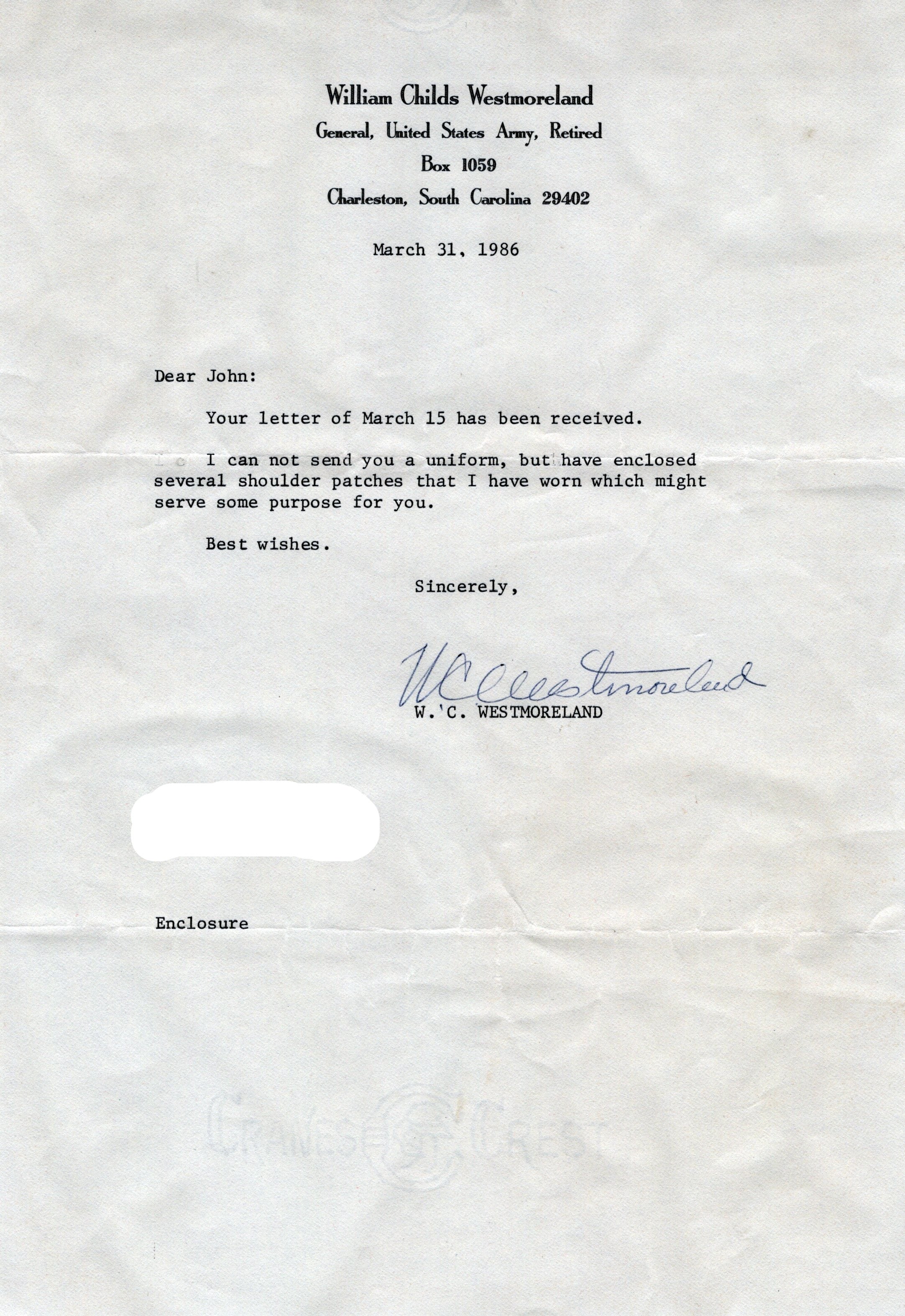 - March 31st, 1984 signed letter on Westmoreland's personal stationary. The letter reads: "Dear John: Your letter of March 15 has been received. I can not send you a uniform, but have enclosed several shoulder patches that I have worn which might serve some purpose for you. Best Wishes. Sincerely, W.C. Westmoreland"