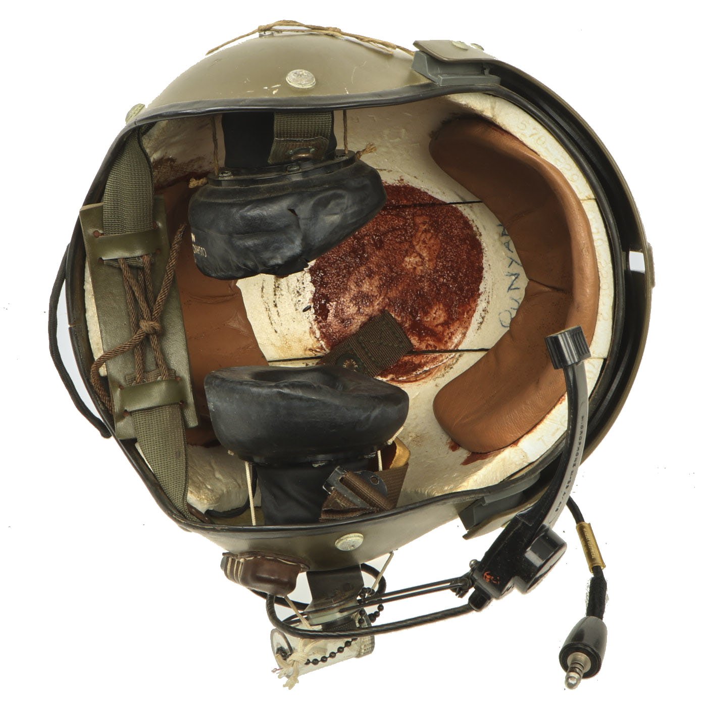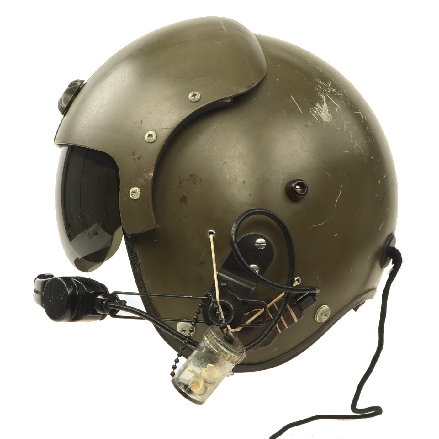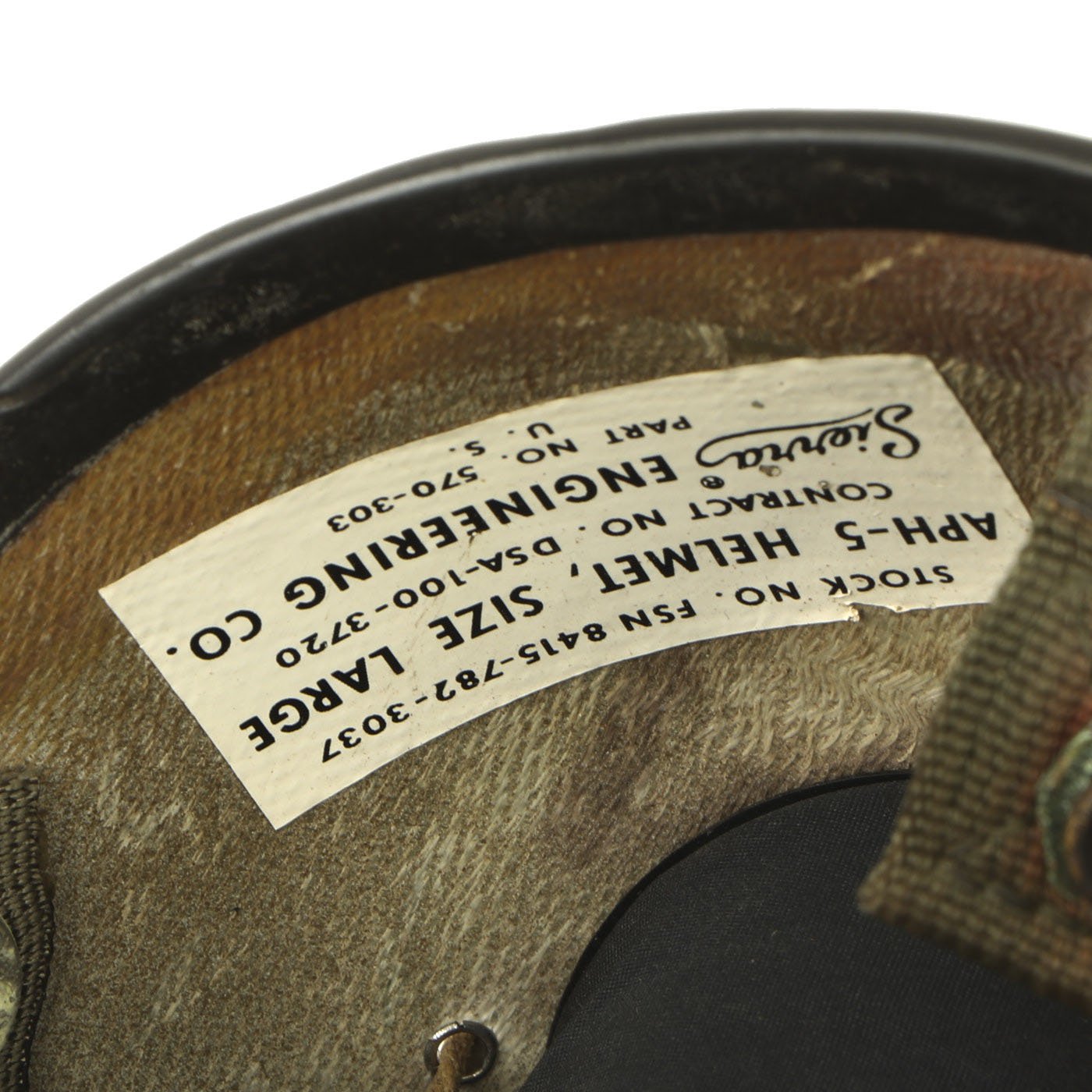 The original SPH-4 had a shell made of fiberglass cloth layers bonded by epoxy. The inner polystyrene foam energy absorbing liner was 97 mm (0.38") thick with a density of 5.2 lb/ft3. The helmet was fitted with a sling suspension liner and had a nape strap with a single snap on each side fitting to studs on a retention harness. The chin strap had a design strength of 150 lbs. The headset was mounted in 6 mm thick moulded plastic ear cups with excellent sound attenuation characteristics. A size regular helmet weighed 1.54 kg (3.4 lbs).