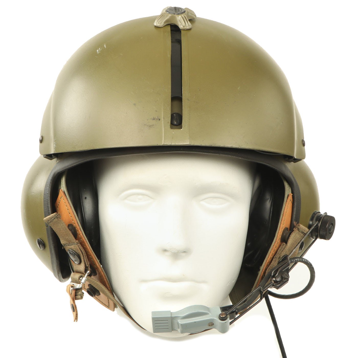 The original SPH-4 had a shell made of fibreglass cloth layers bonded by epoxy. The inner polystyrene foam energy absorbing liner was 97 mm (0.38") thick with a density of 5.2 lb/ft3. The helmet was fitted with a sling suspension liner and had a nape strap with a single snap on each side fitting to studs on a retention harness. The chin strap had a design strength of 150 lbs. The headset was mounted in 6 mm thick moulded plastic ear cups with excellent sound attenuation characteristics. A size regular helmet weighed 1.54 kg (3.4 lbs).