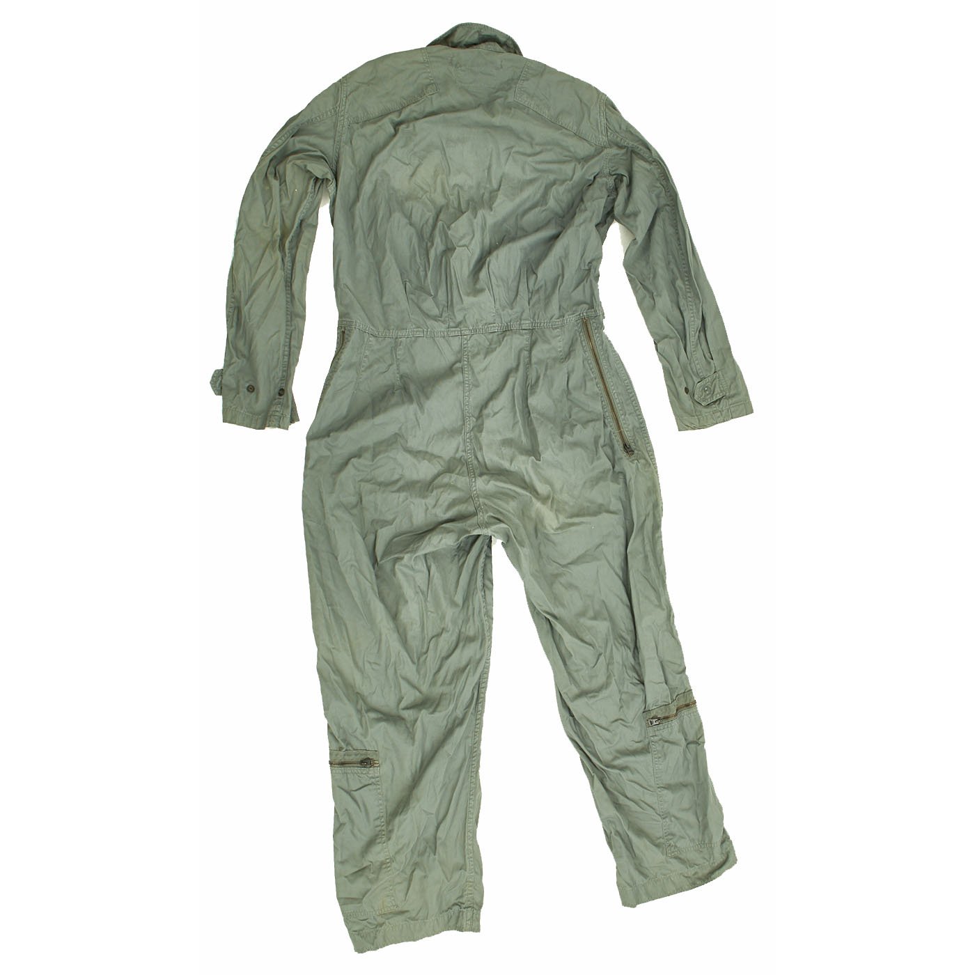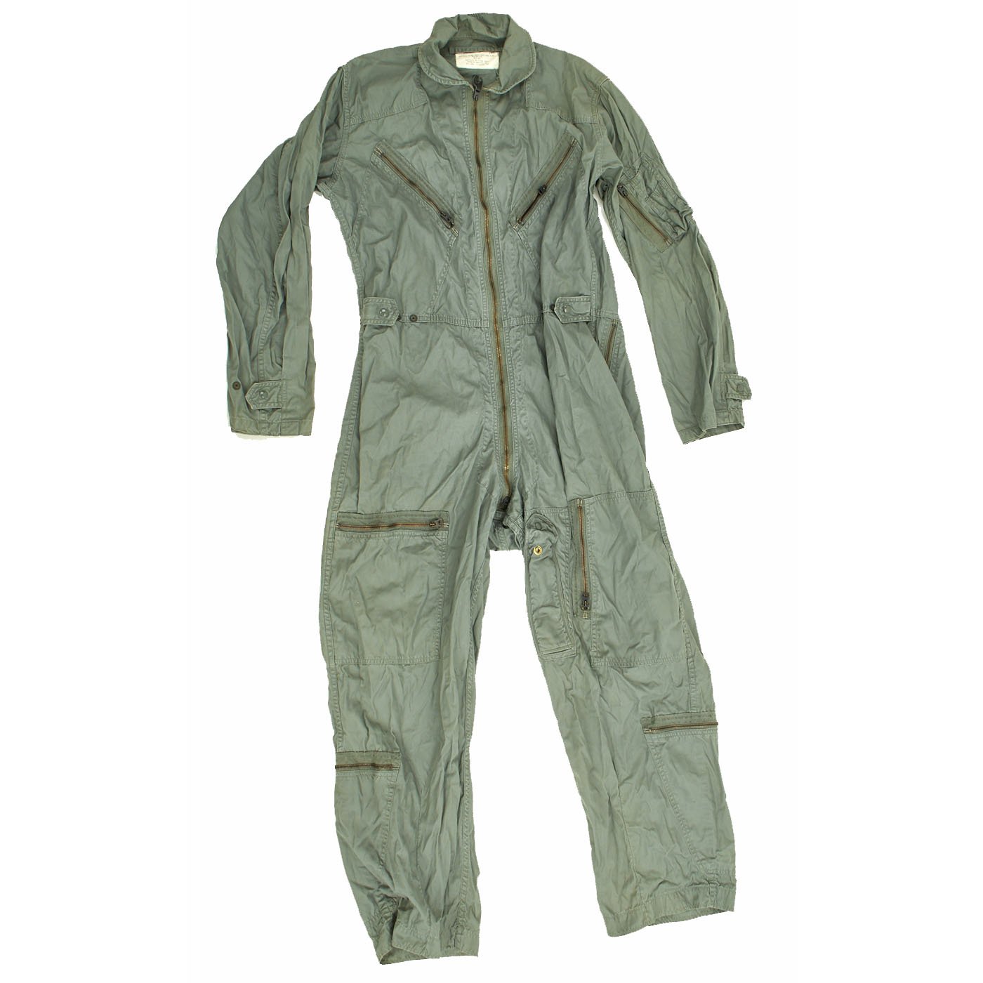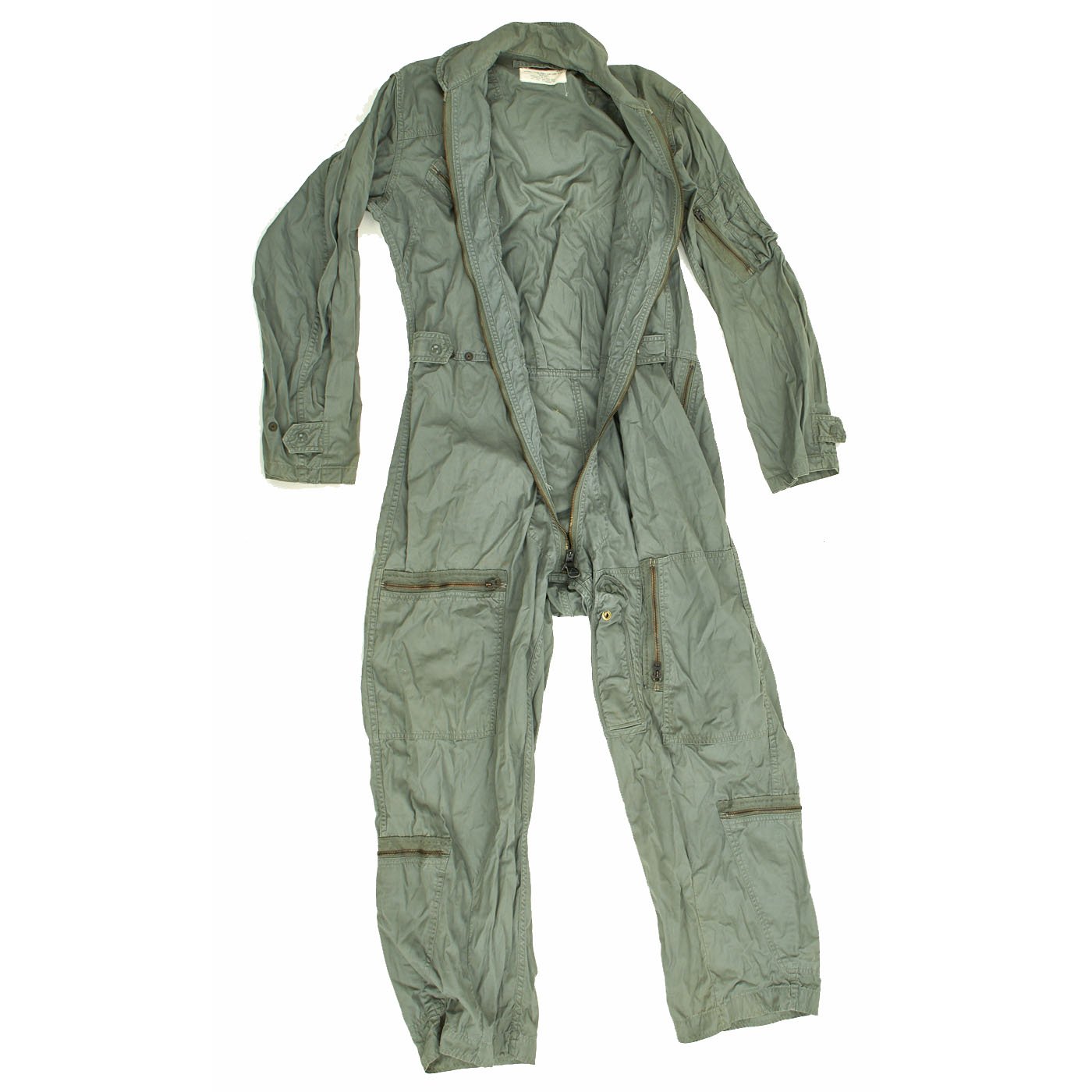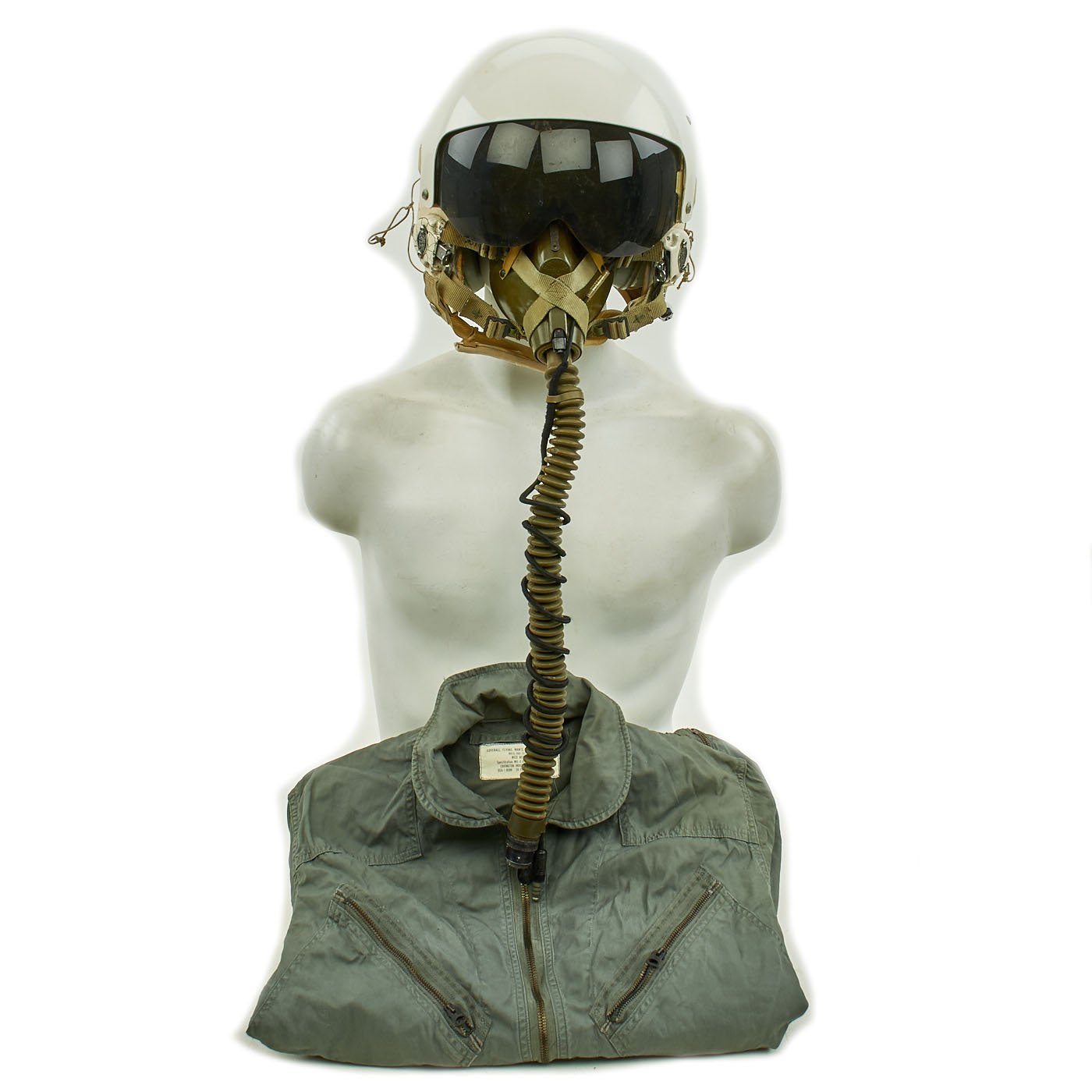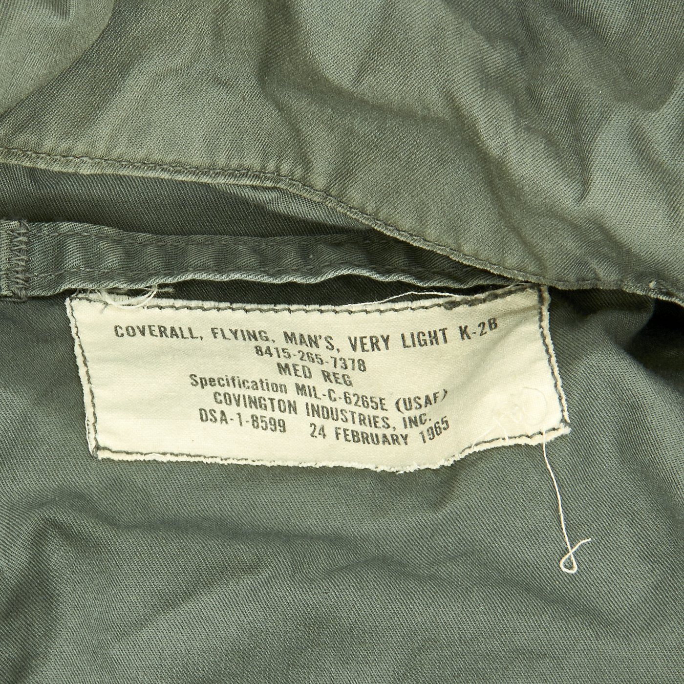 Also included is a United States Air Force flight suit with original label that reads COVERALL, FLYING, MAN'S VERY LIGHT K-2B in size Medium regular and dated 24 February 1965. Suit is offered in very good condition.