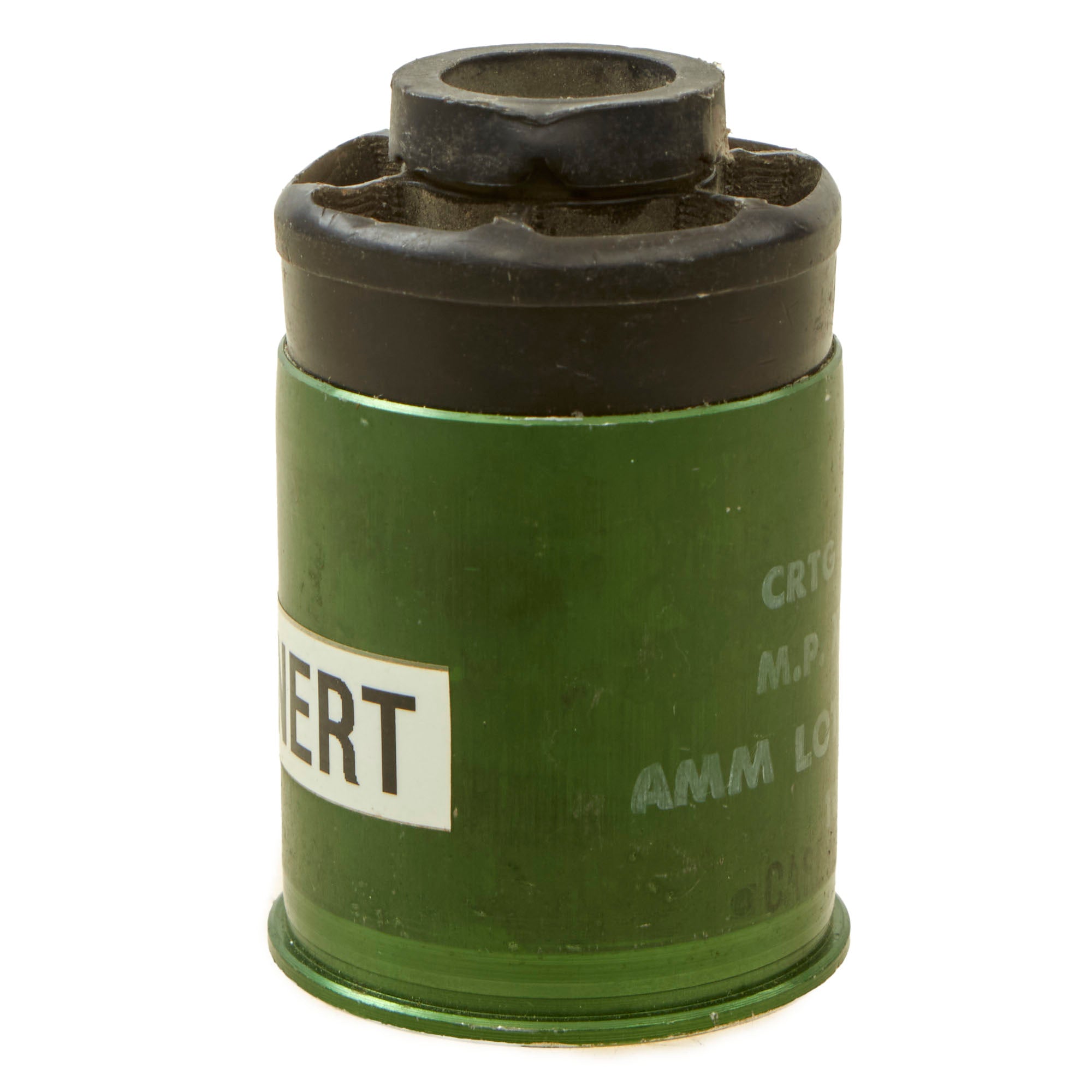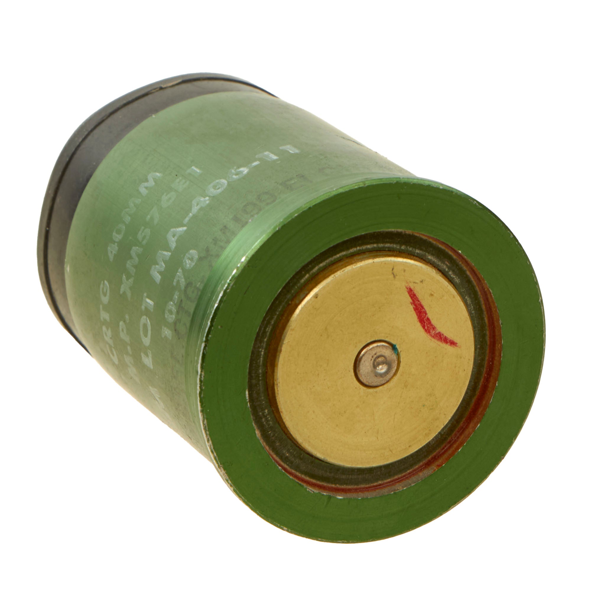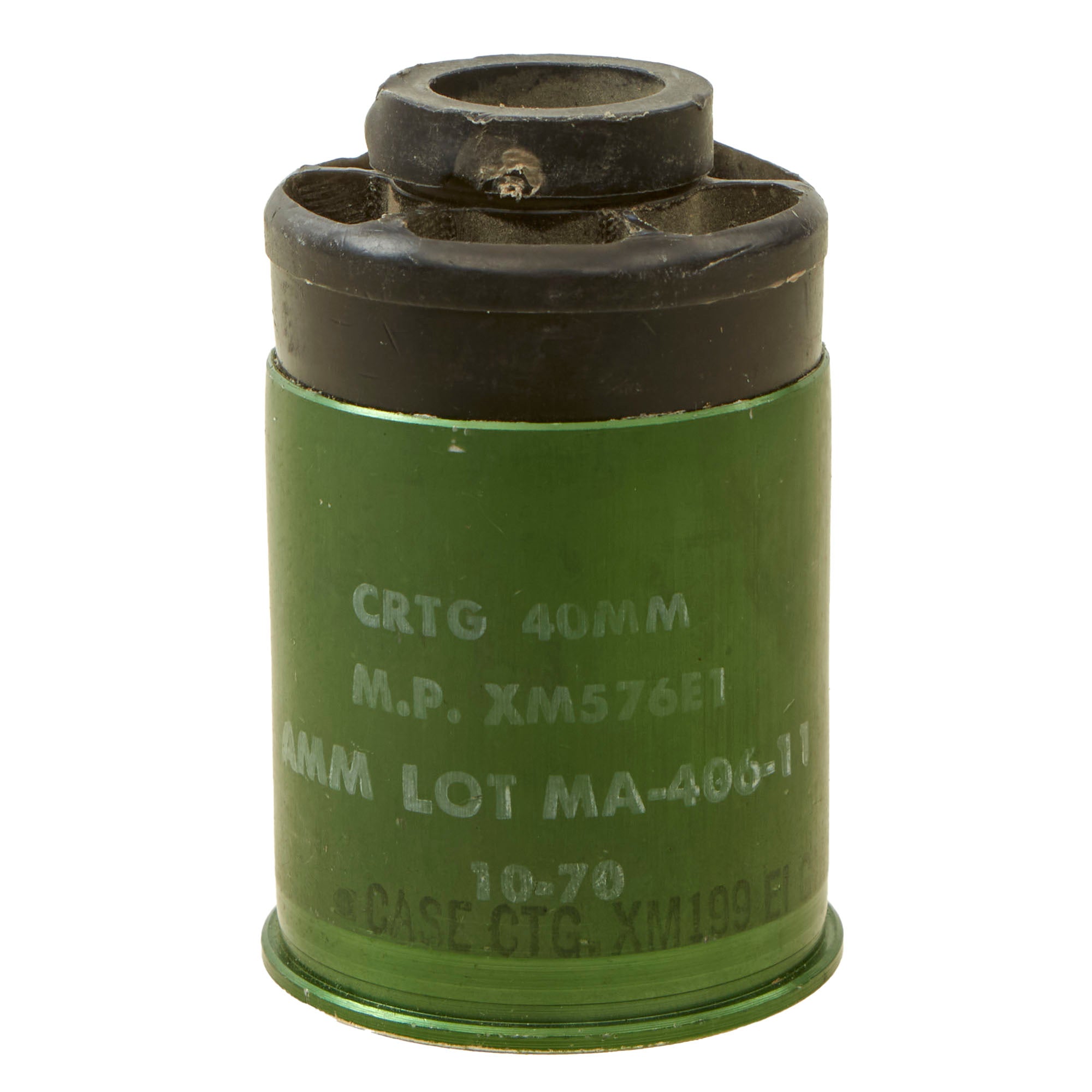 Original Item. Only One Available. The 40mm XM576E1 High-Velocity Buckshot Round was developed to enhance close-range effectiveness in combat situations. Designed for use with automatic grenade launchers, such as the Mk 19, this round was intended to provide a widespread shot pattern capable of engaging multiple targets simultaneously. The buckshot configuration made it especially useful in jungle warfare and urban combat, where enemy forces could be encountered at close quarters. Like all deactivated ordnance, this round is Not Available for Export.This is a great example of the scarce XM576E1 shotgun round, which still retains the markings on the side of the XM199 aluminum case:CRTG 40MMM.P. XM576E1AMM. LOT MA-406-1110-70CASE CTG. XM199 EI GIB 1-14 10-69The XM199 Aluminum Case was a crucial component, offering a lightweight and durable housing that ensured the round's reliability under various conditions. The high-velocity nature of the XM576E1 allowed it to achieve greater range and impact force, making it a valuable asset for soldiers in the field.There’s also an INERT sticker on the side. This is a great example with intact markings, ready for further research and display.