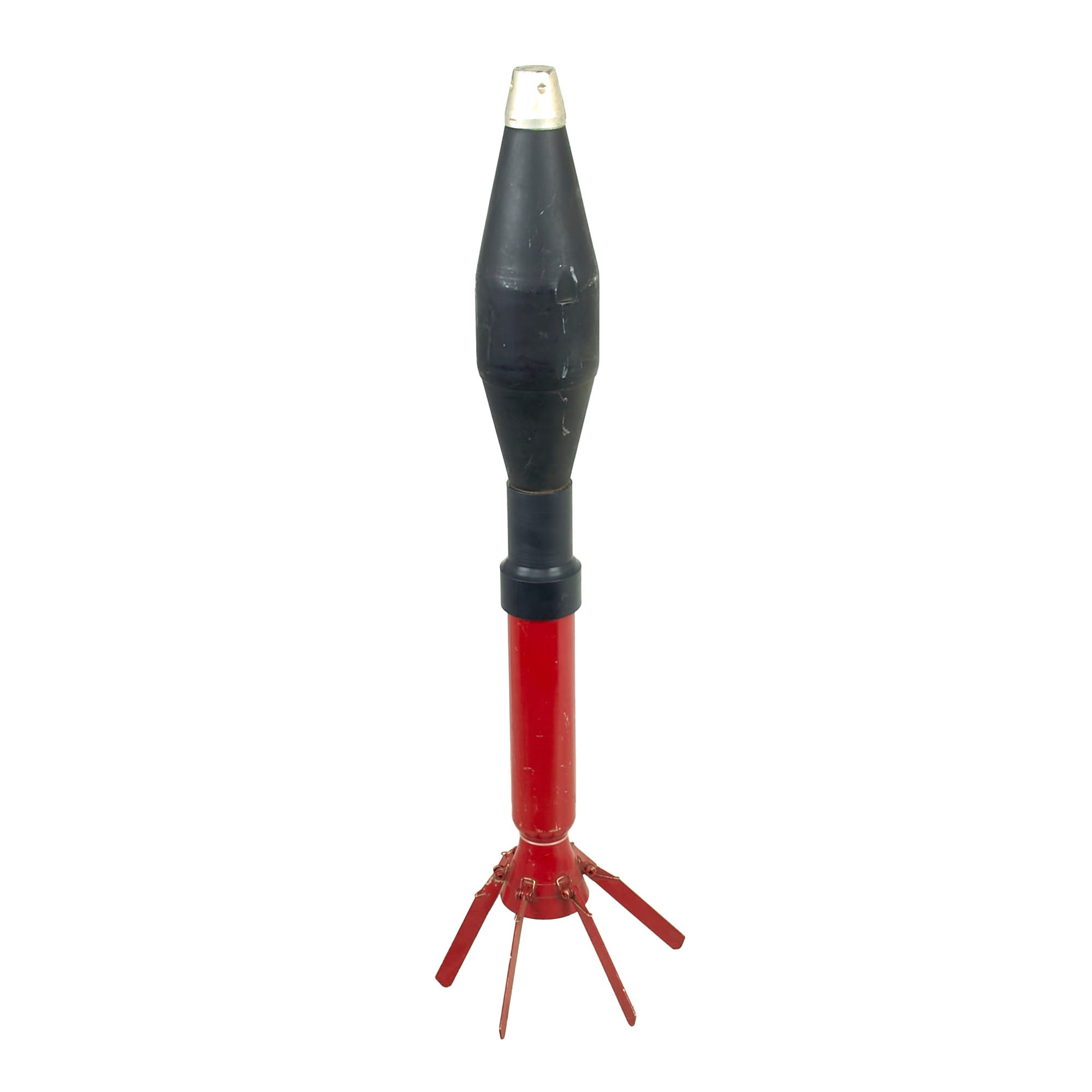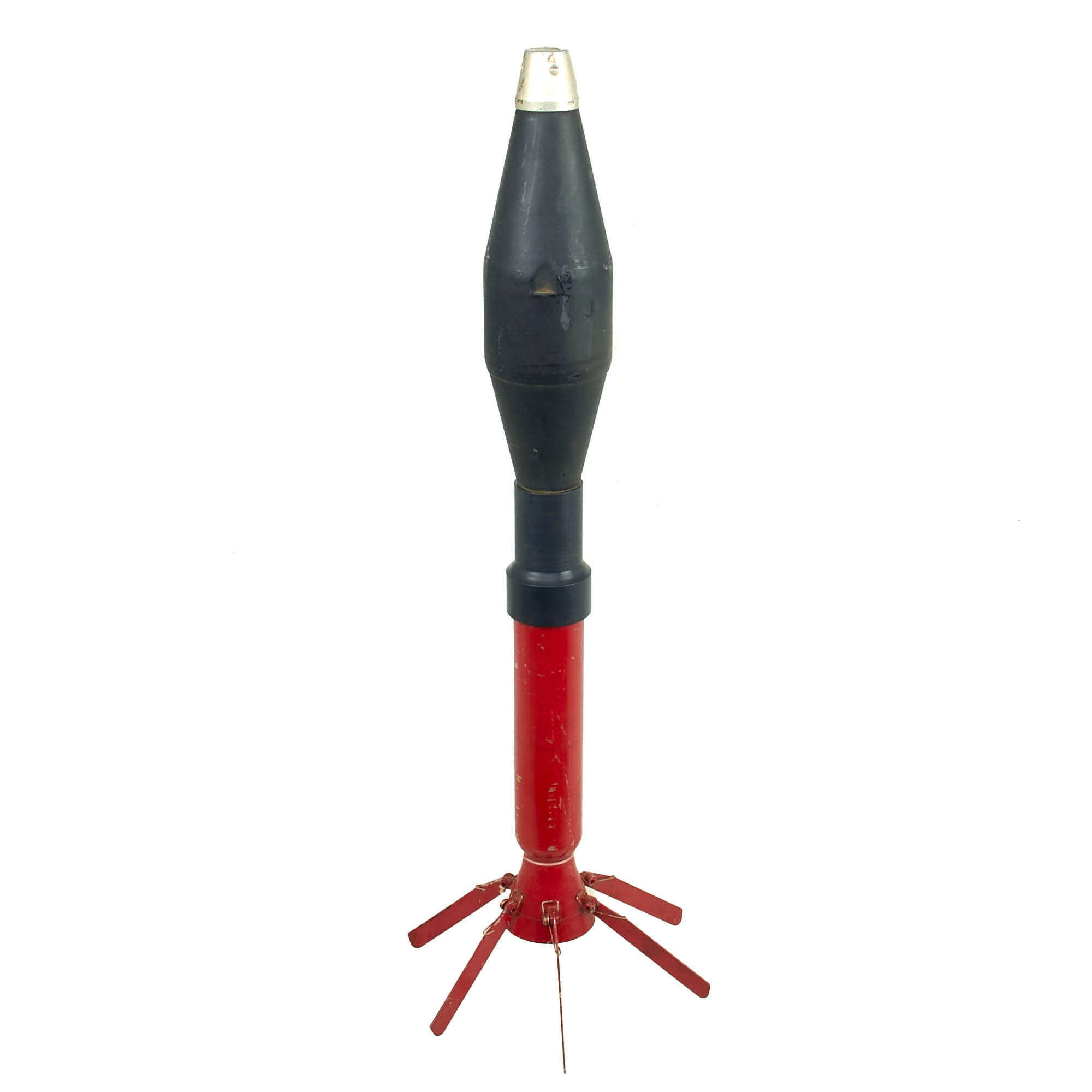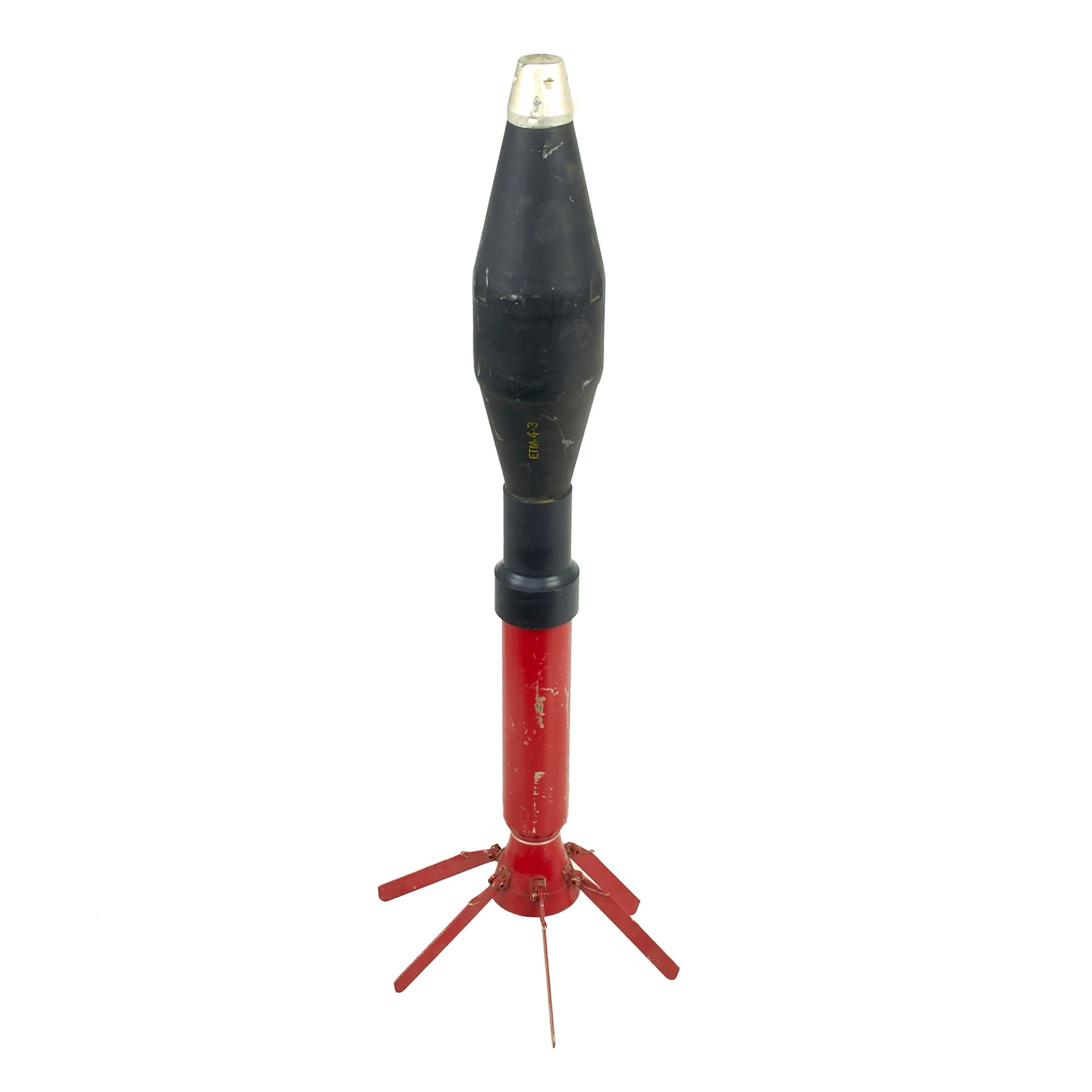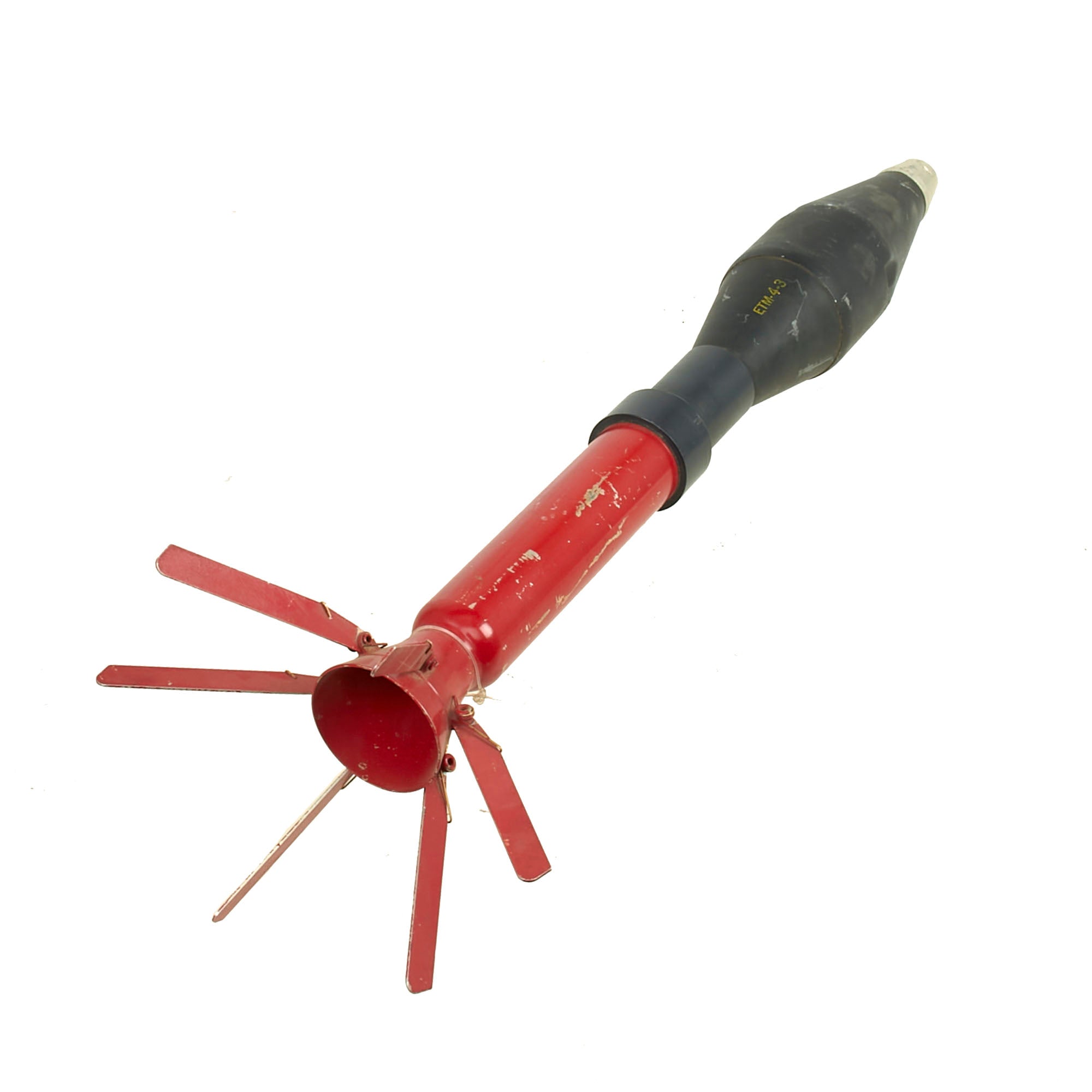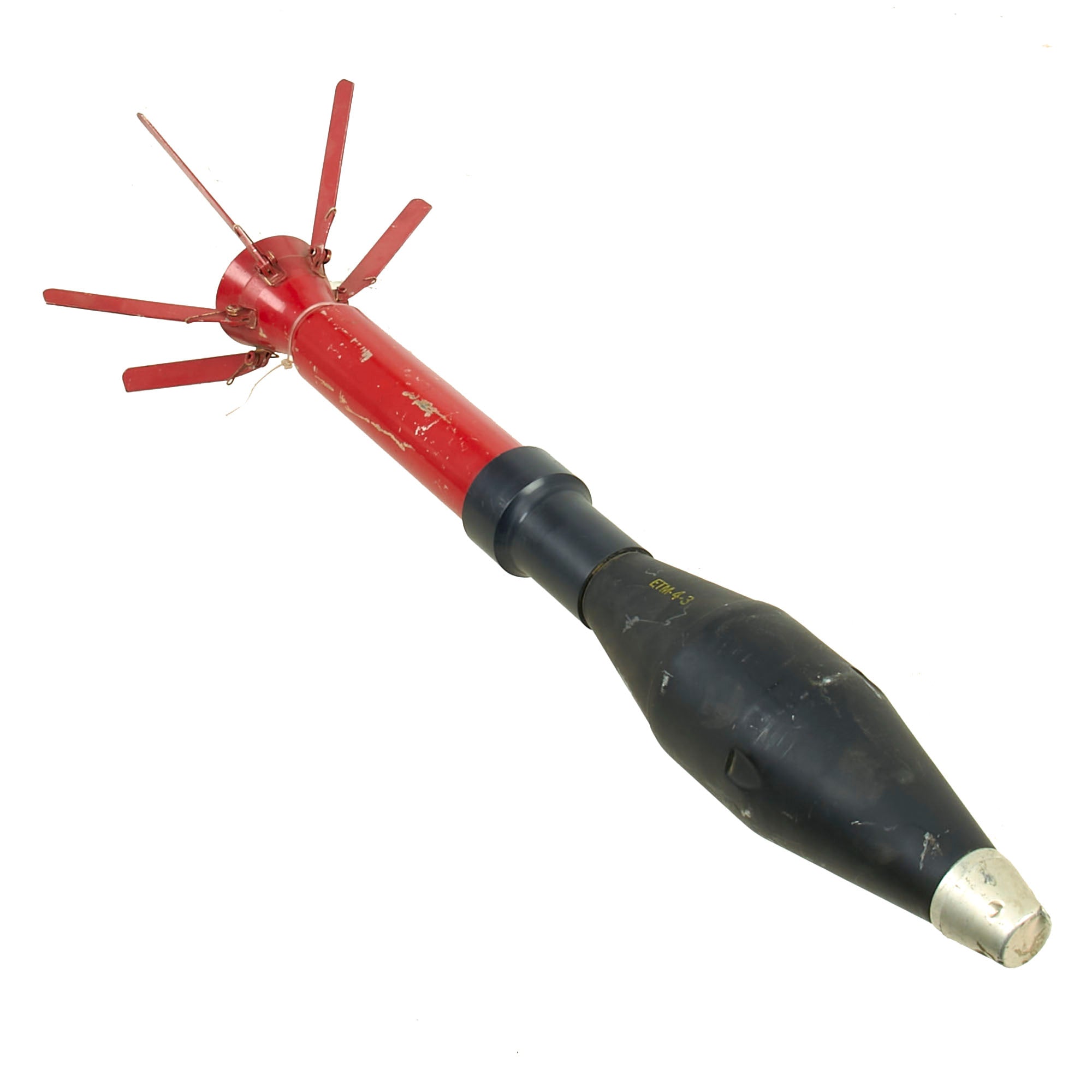 This is a lovely 66mm rocket for the M72A2 LAW launcher, in good overall condition. It still retains all six of its fins, with the shaft and fin assembly being painted red. The round measures roughly 21¾” with the fins extended. The fin assembly is stamped H14, and the side of the rocket is marked ETM-4-3. The fuse is still attached and in fair condition.