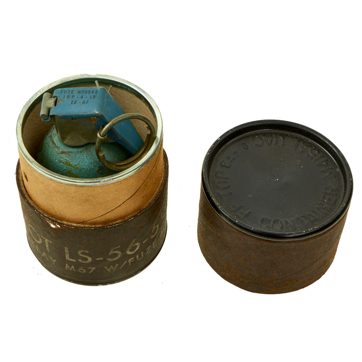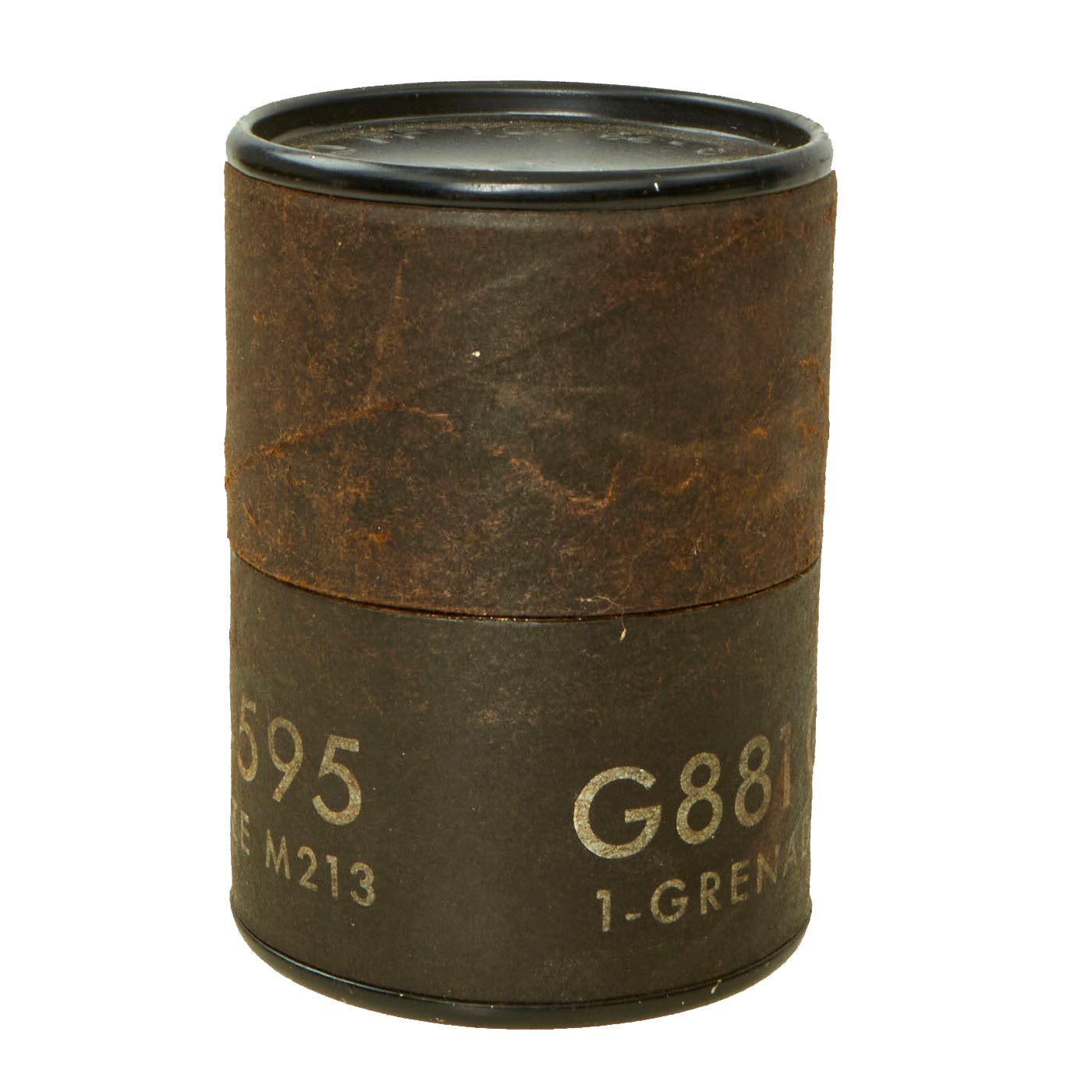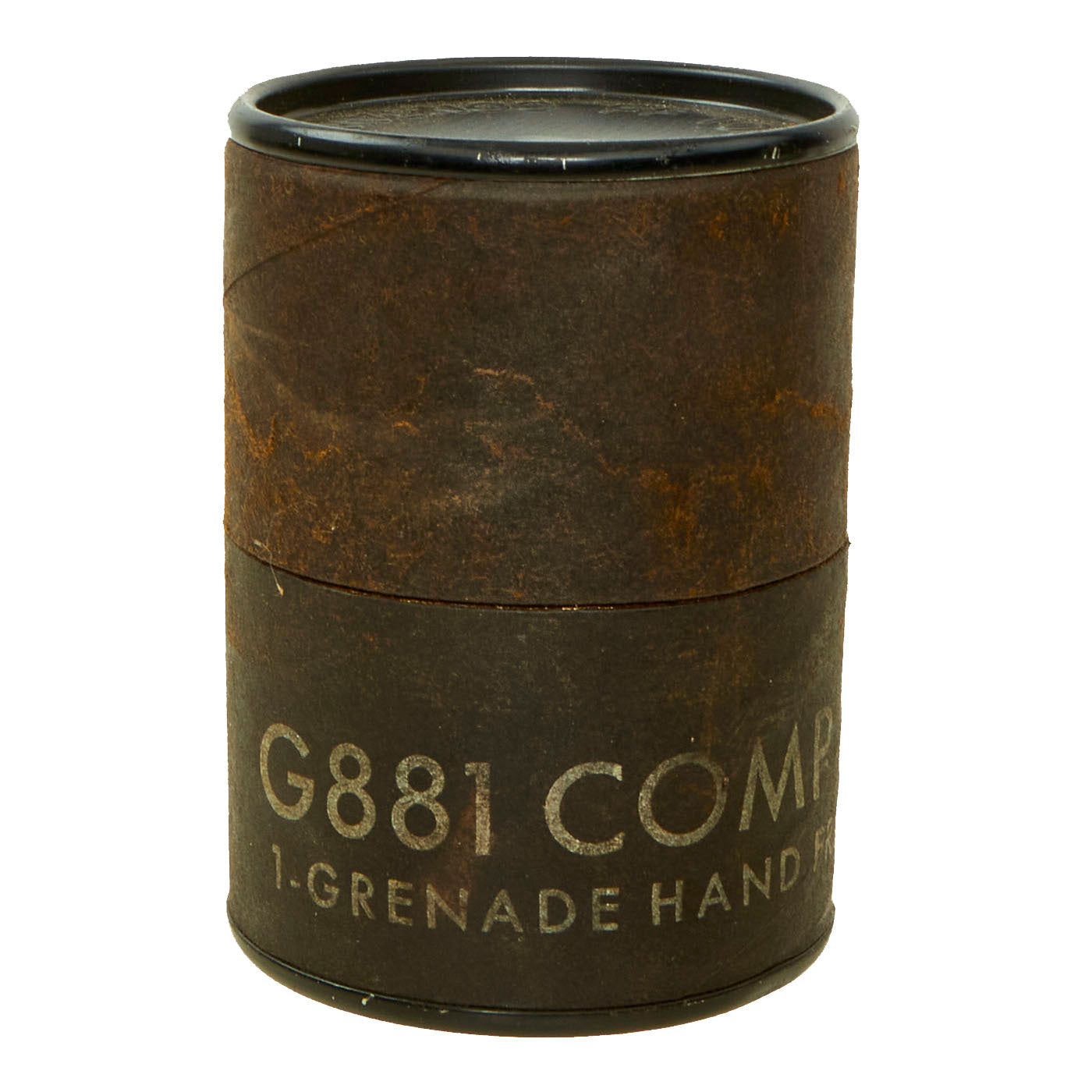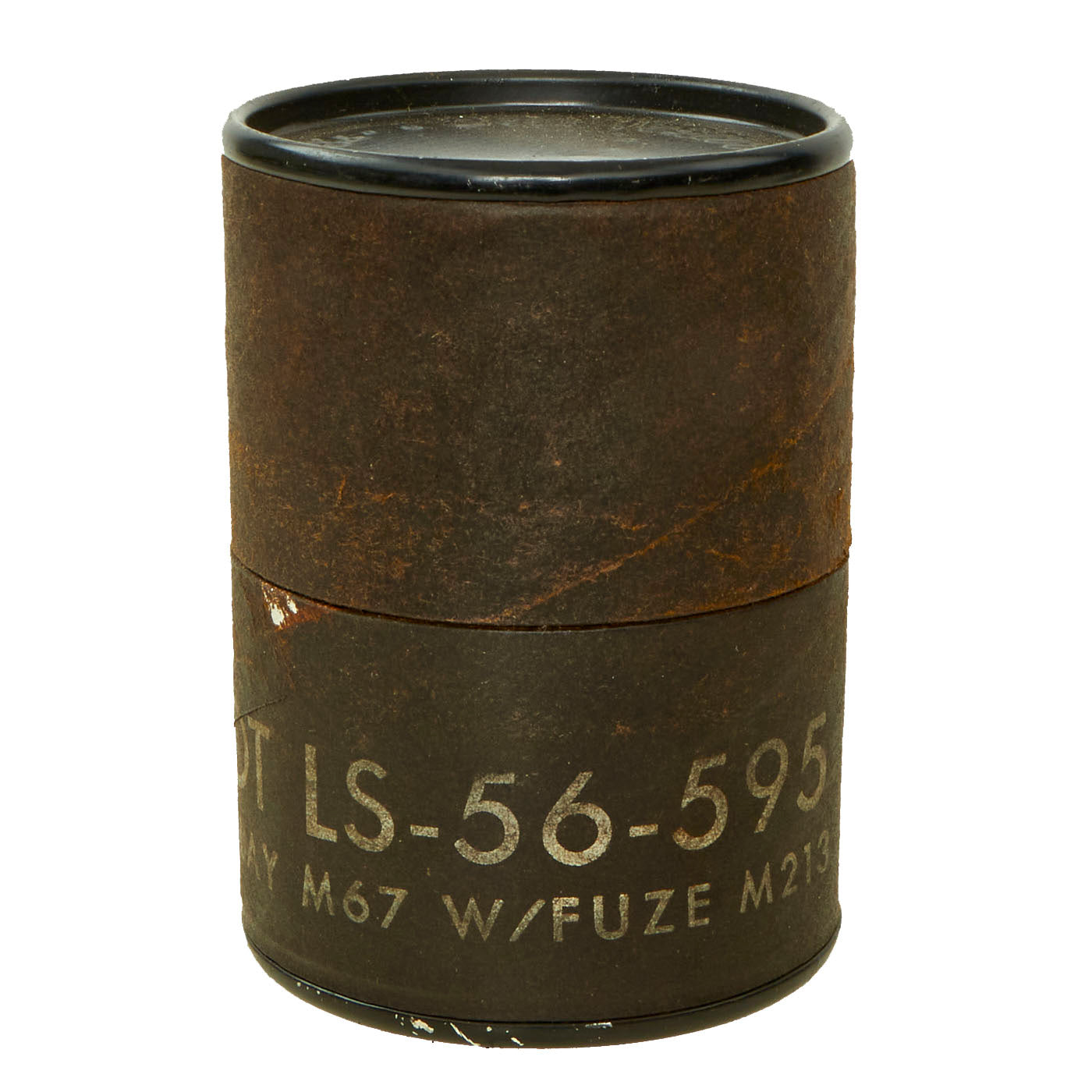 Included is a cardboard “husk” transportation canister for an M67 fragmentation grenade. Although not the correct container, it still fits well and serves its purpose.