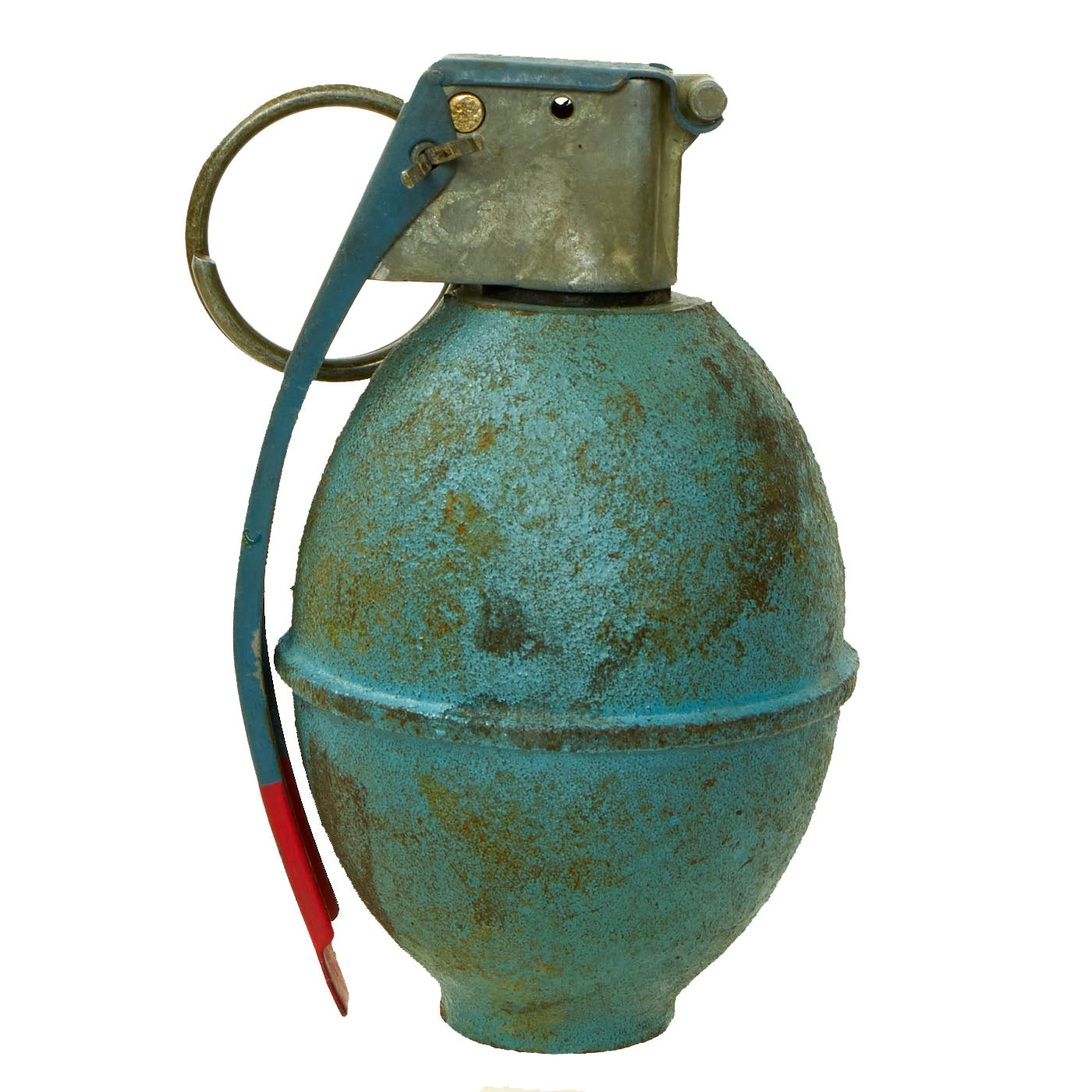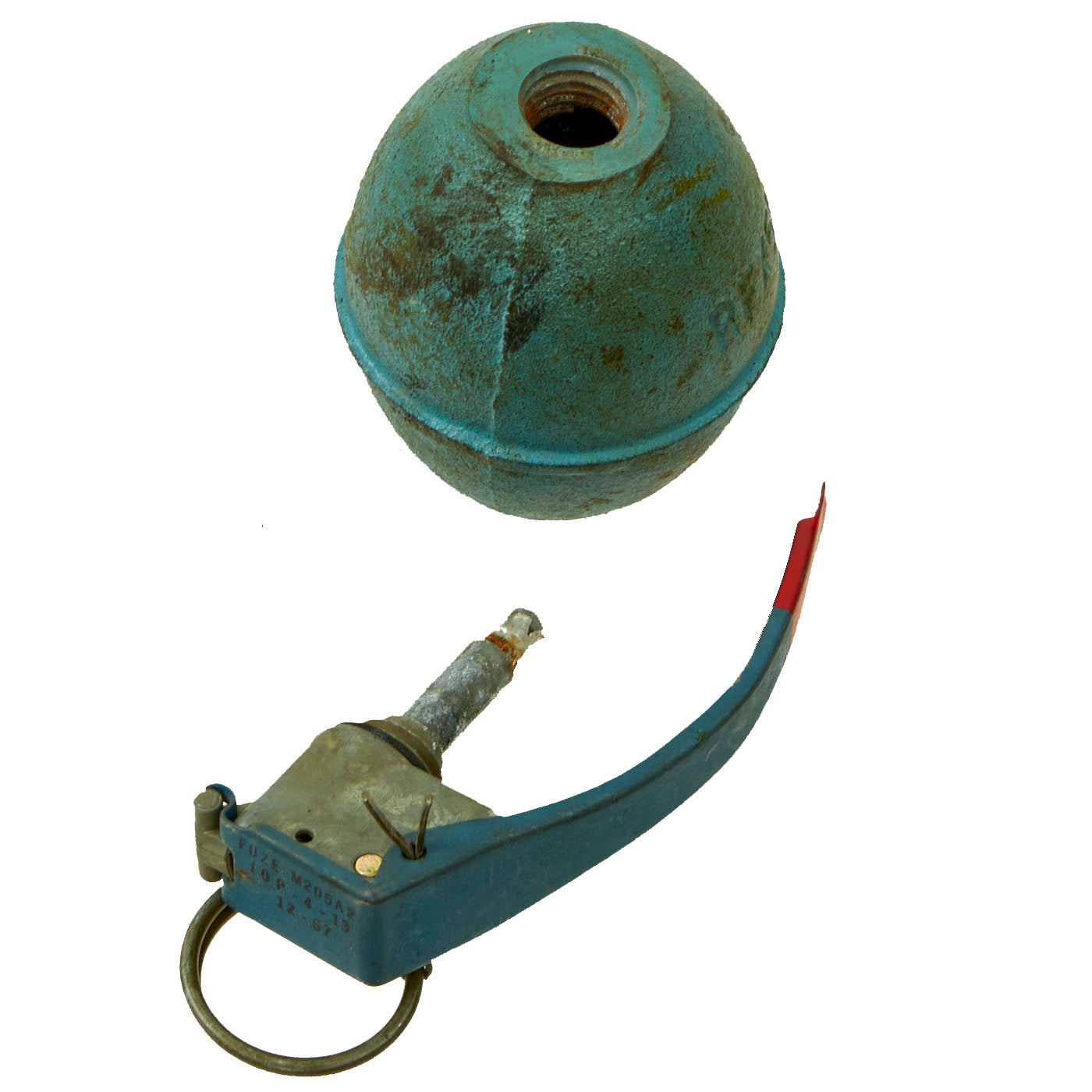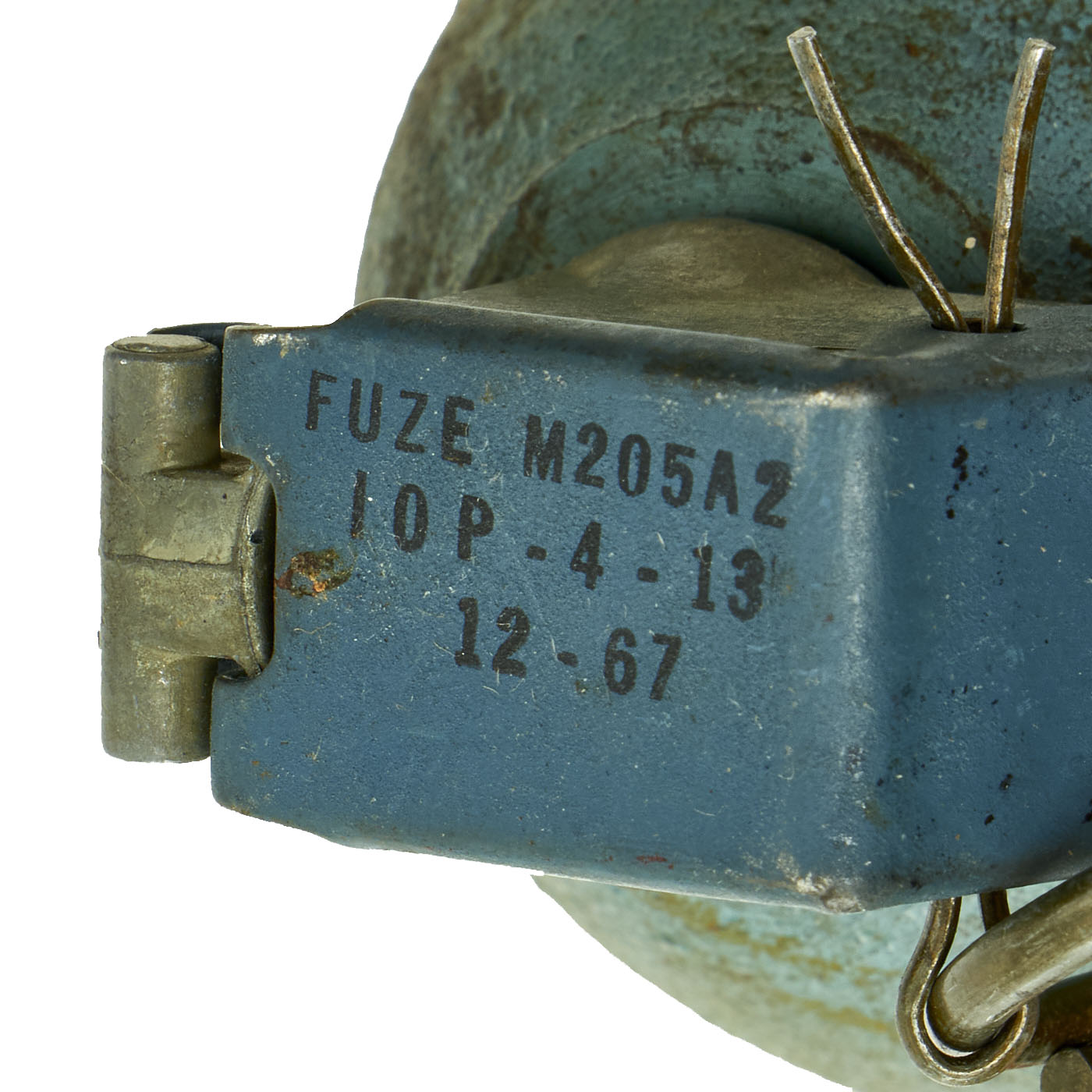 The M30 is the practice version of the M26 grenade. It has a cast-iron two-piece oval body and is missing the plastic base plug. The body is embossed with the symbols "RFX55" and M8; it was originally the basis for an experimental hand grenade that was never put into production. It had a filler of 21 grains of black powder and used the M10A3/M10A4 or M204A1/M204A2 series of fuzes. This one has a lovely 1967 dated M205A2 fuse with original pin. Its body is painted light blue and is without a brown band across the middle. When the grenade detonated, the overpressure made the plug pop out and released a plume of black smoke caused by the burnt filler.
