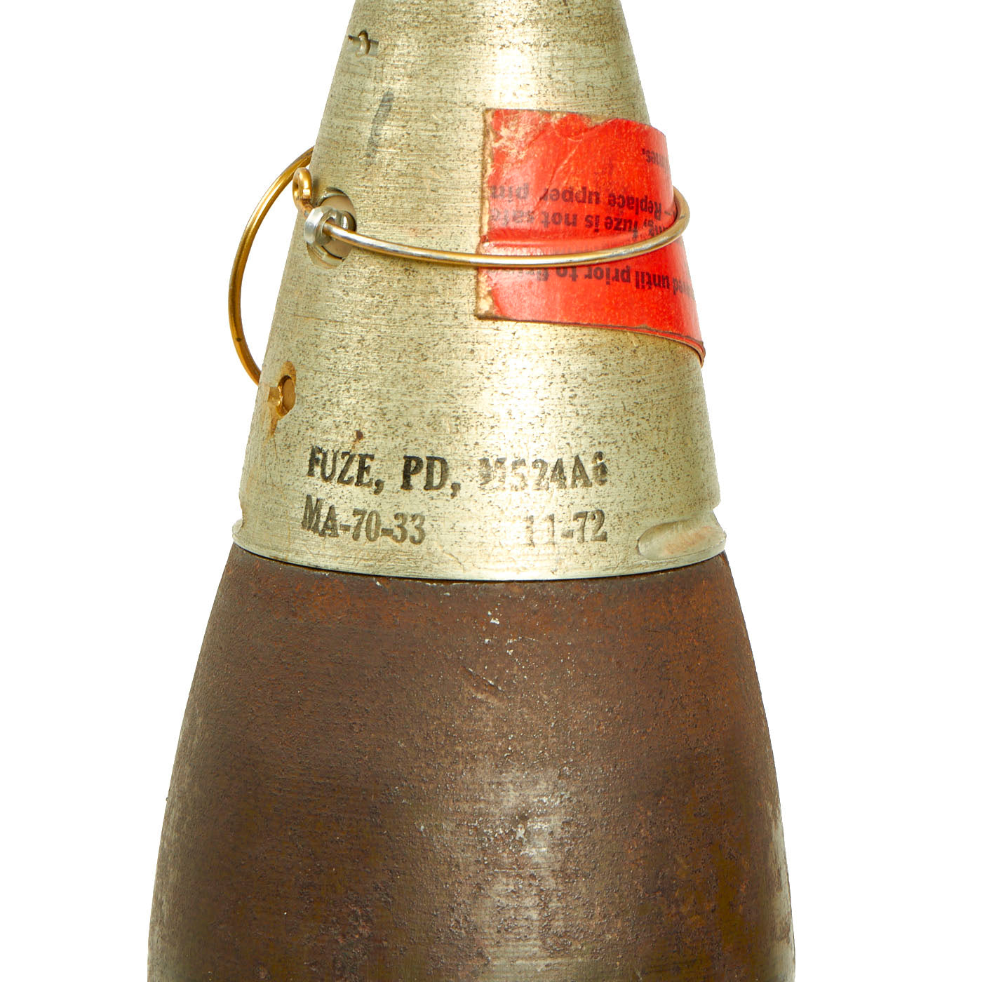 The round itself is in good condition and retains little of the original OD Green paint with handling wear present as well as some surface rust and pitting. The round still retains clear arsenal stamps which identifies this round as a 81mm HE M374A1 round and is dated as 11-1-69. The tail fin assembly is an added piece for display purposes. The fuse assembly is marked as a PD M524A6 and is dated 11-72.