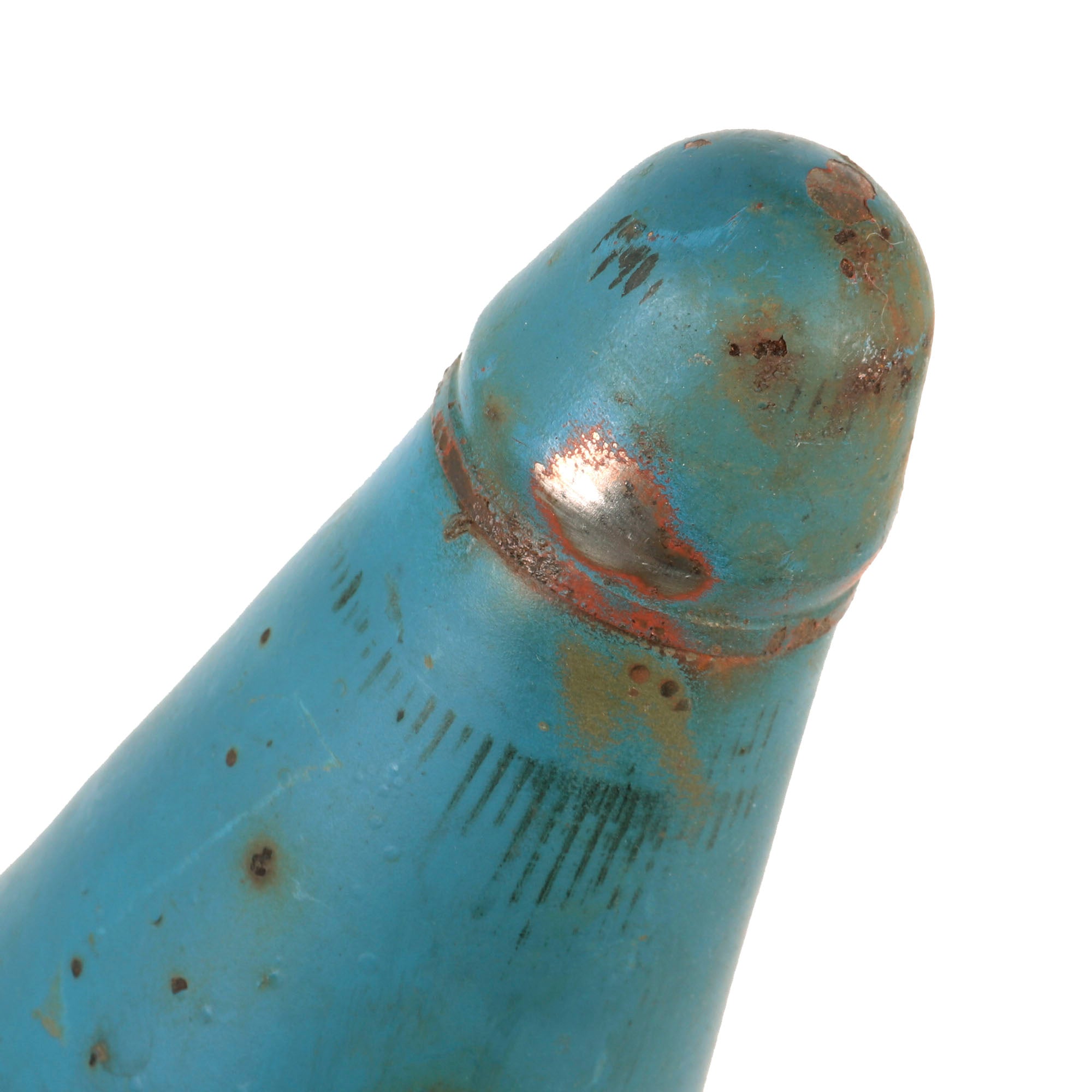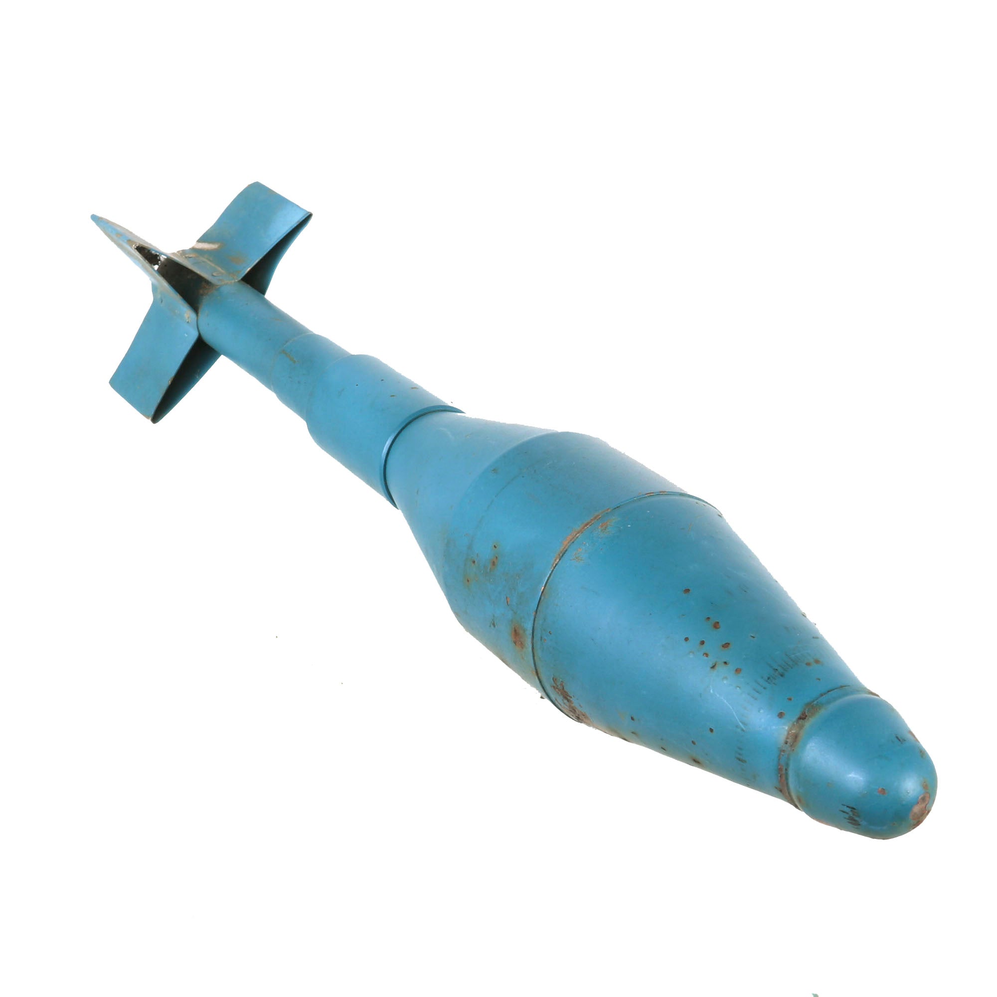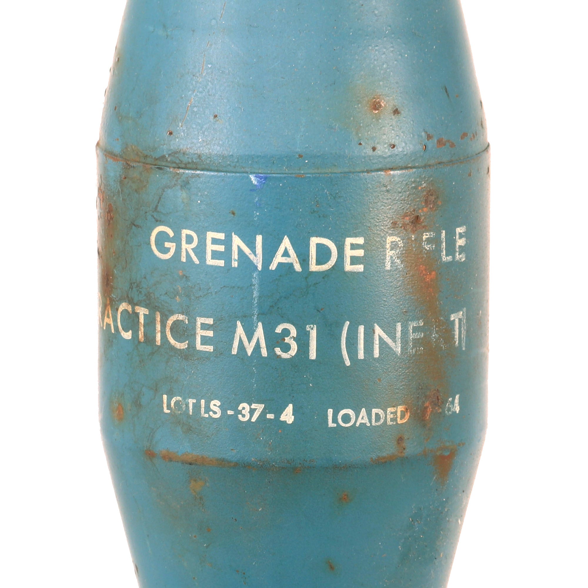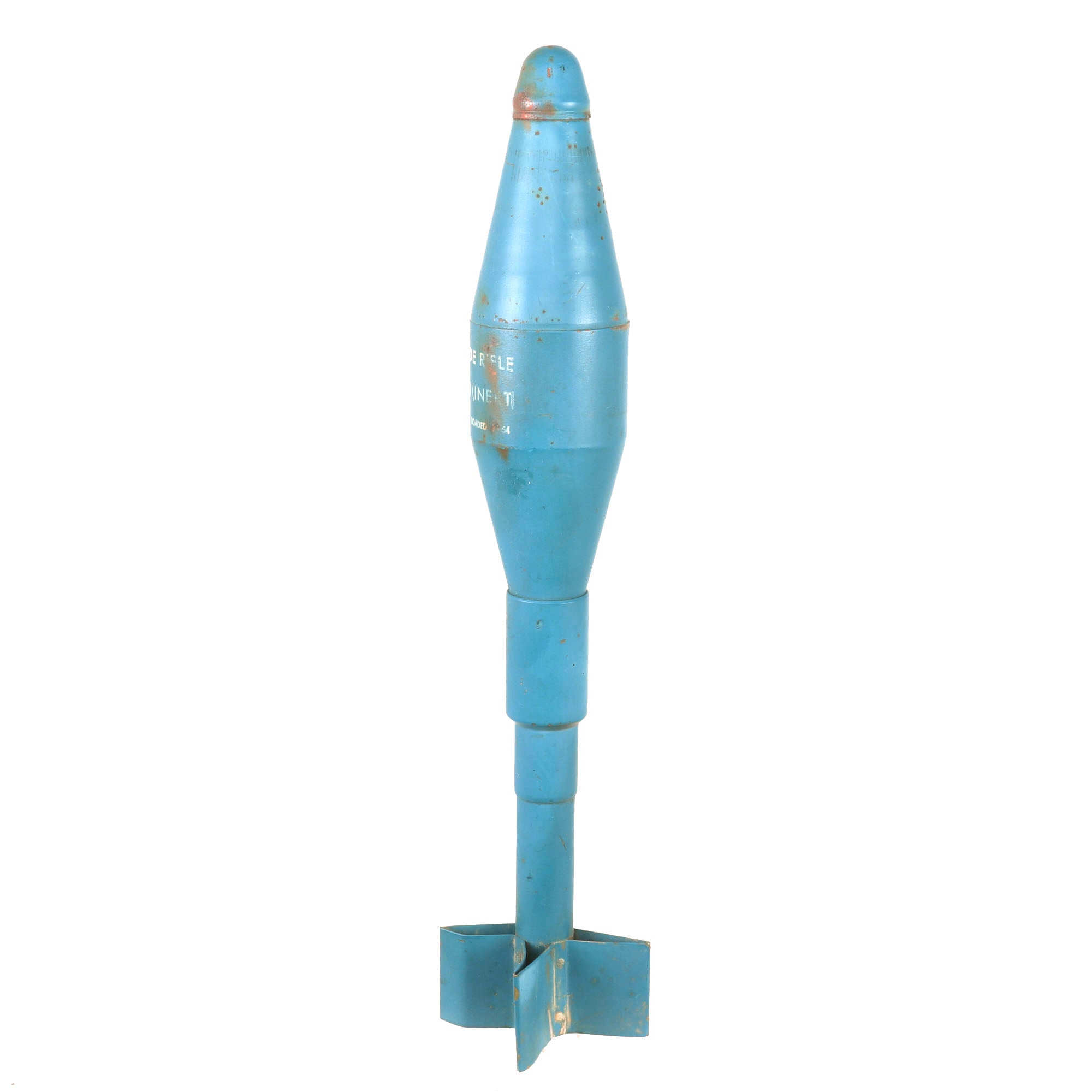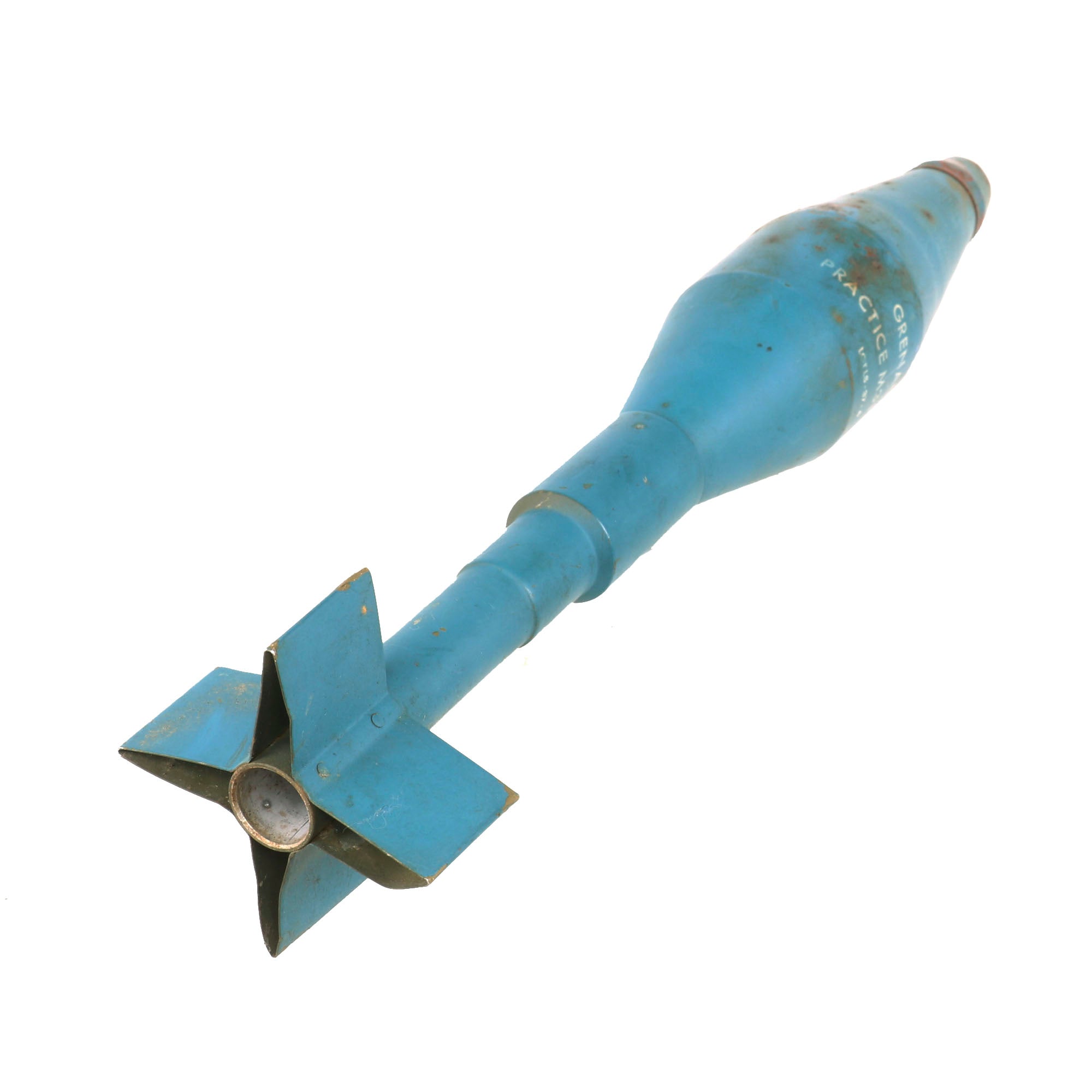 We are offering a great selection of Vietnam War Practice rifle grenades, all dated 1963-1964, great years for Vietnam use. These examples have not been repainted and retain the original blue color very well, with all markings still legible. The grenades are approximately 17” in length with a 3 ¾” base width, including the fins. The tail fins are a little bent on some examples, but that is expected with trainers such as this one, at least you know it was used by the military! There is also some scattered oxidation across these examples.