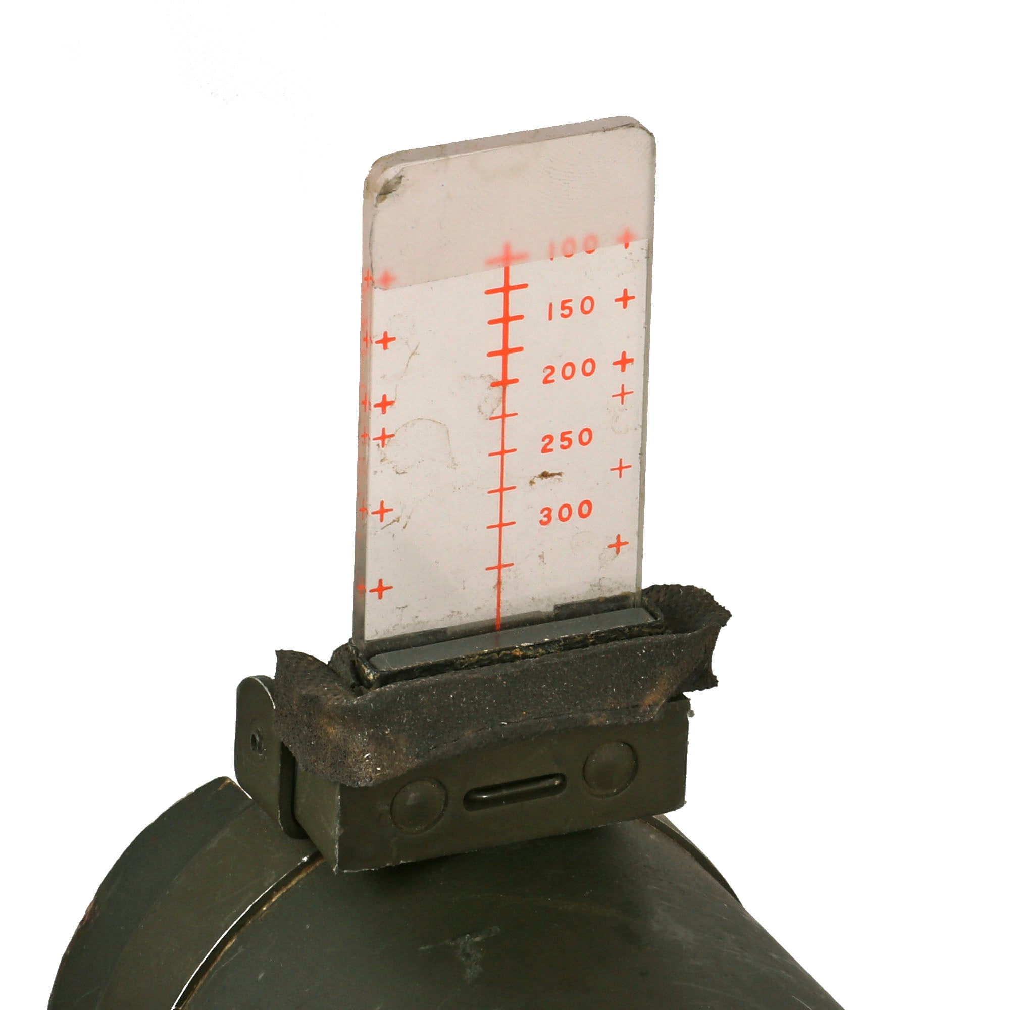 This beautiful example has both the front and rear sight intact, which are often missing from these early examples. The end cap is unfortunately missing from this example. The rubber clicker on the side is missing some of its rubber covering, and the labels show a good bit of scratching & damage. A great piece but certainly has some flaws. This launcher is lot numbered and dated on the side of the barrel: