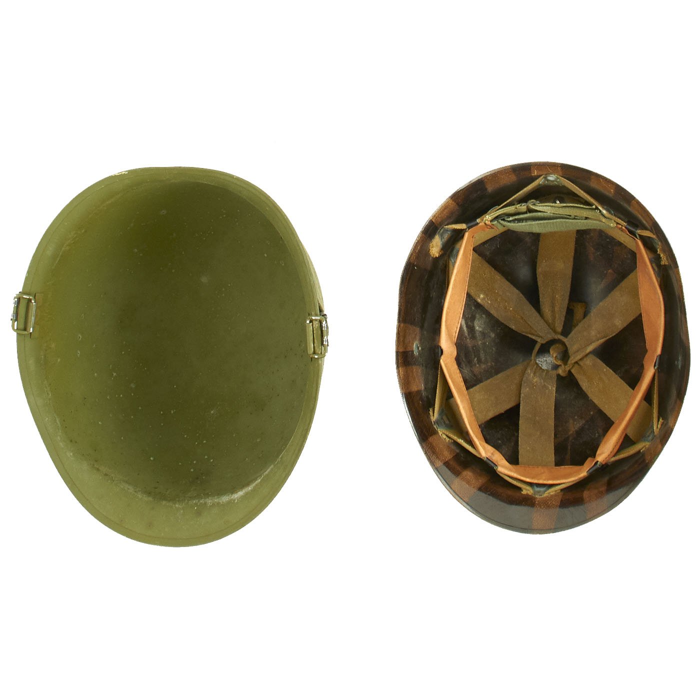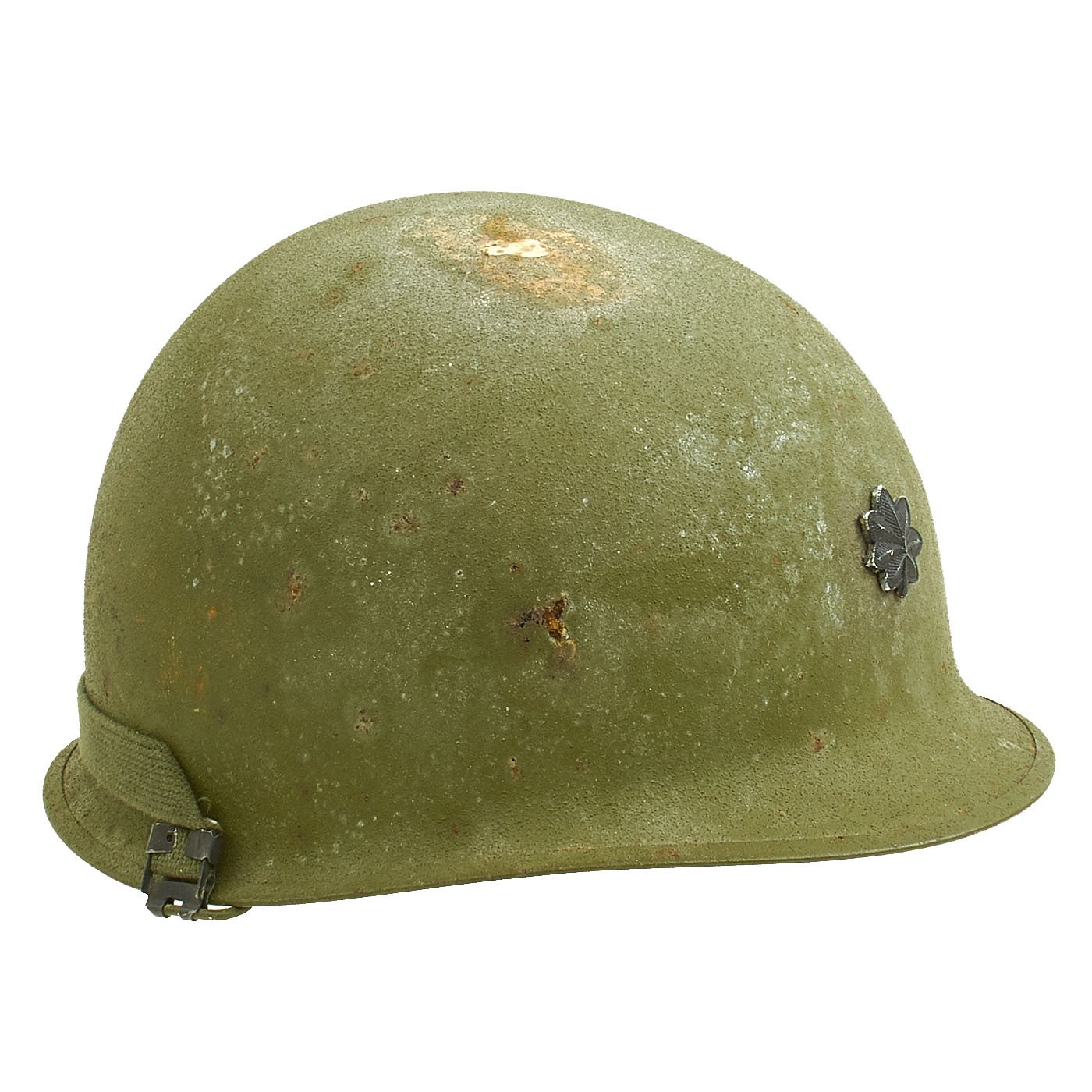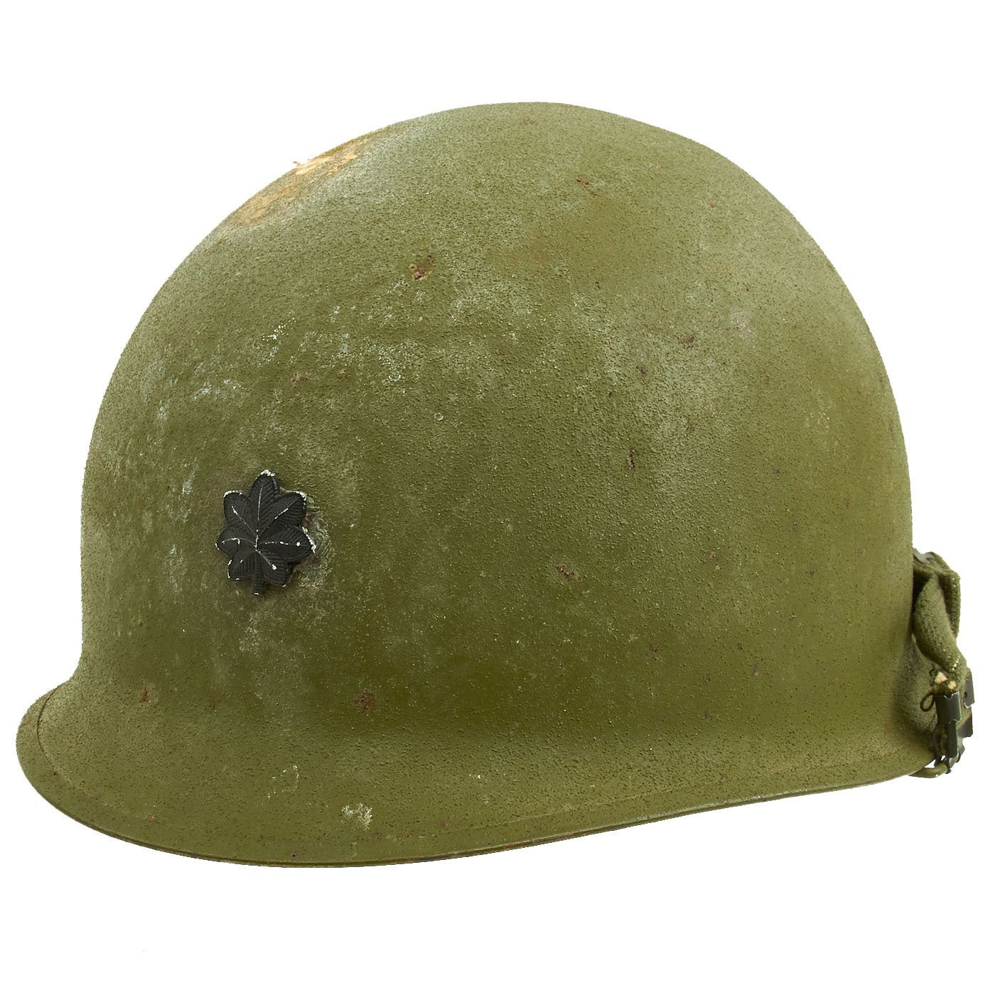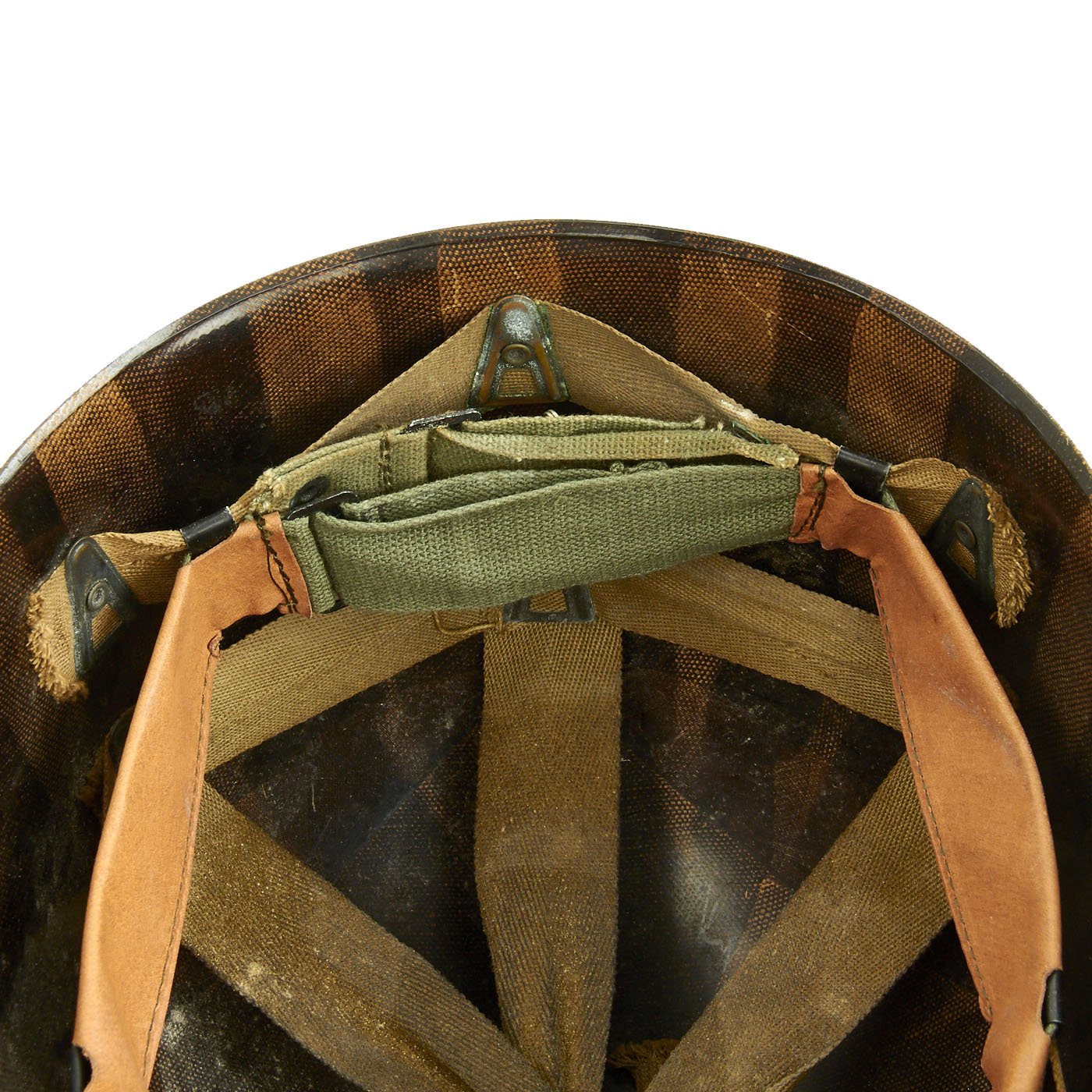 This helmet is a fine example and still retains all of its original Vietnam War parts, and the shell has the original dark OD Green finish. The front of the helmet has a black oak leaf badge attached to the front, the "subdued" color for a Lt. Colonel rank. It looks to be made of aluminum, which has worn through in a few spots. The helmet's heat lot code of I 4451 is clearly visible, which indicates manufacture by Ingersoll Rand Products, who produced a total of 3,174,296 helmet shells between 1965-1968 during the Vietnam Period. The shell still retains the correct Vietnam type chin strap, attached to the swivel bales, with the modified buckle designed to give way under excessive load, such as from an explosion.