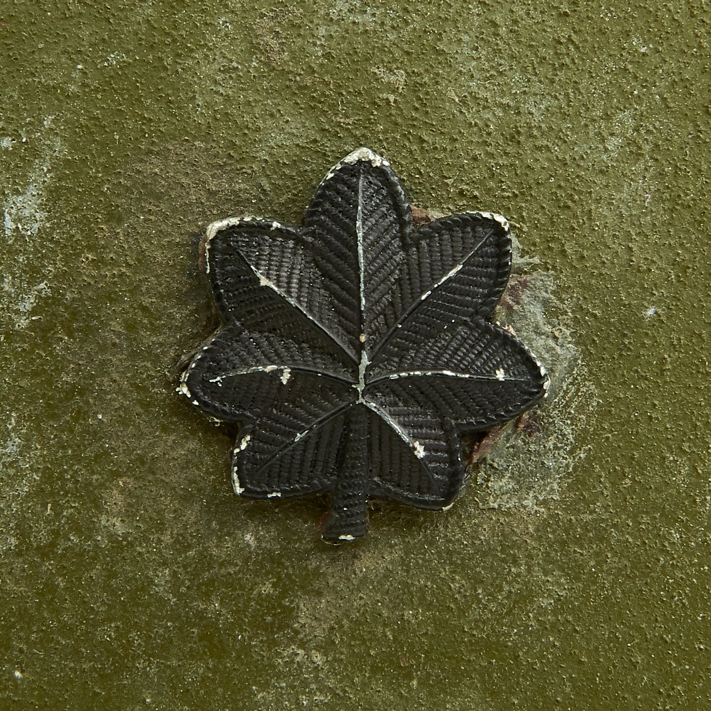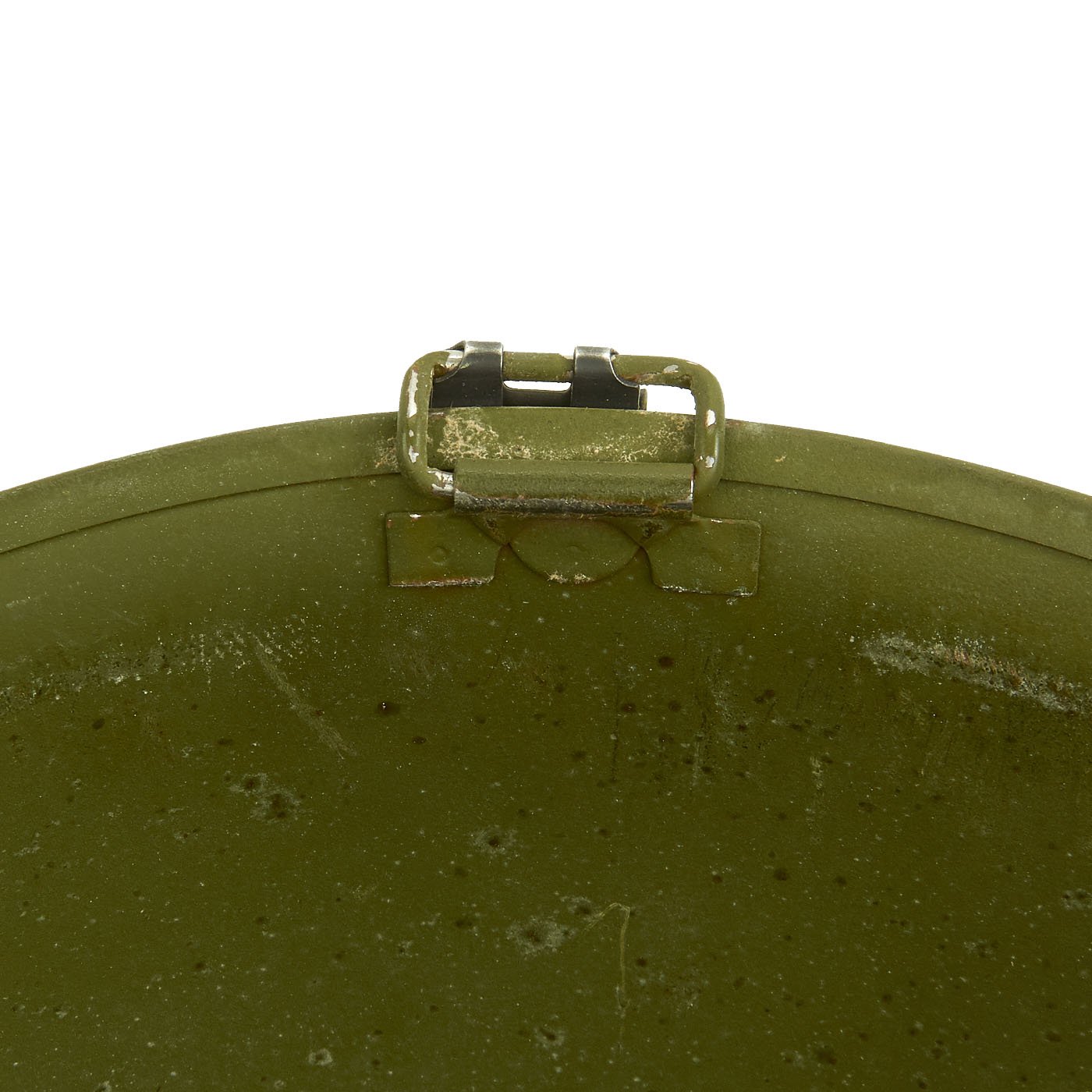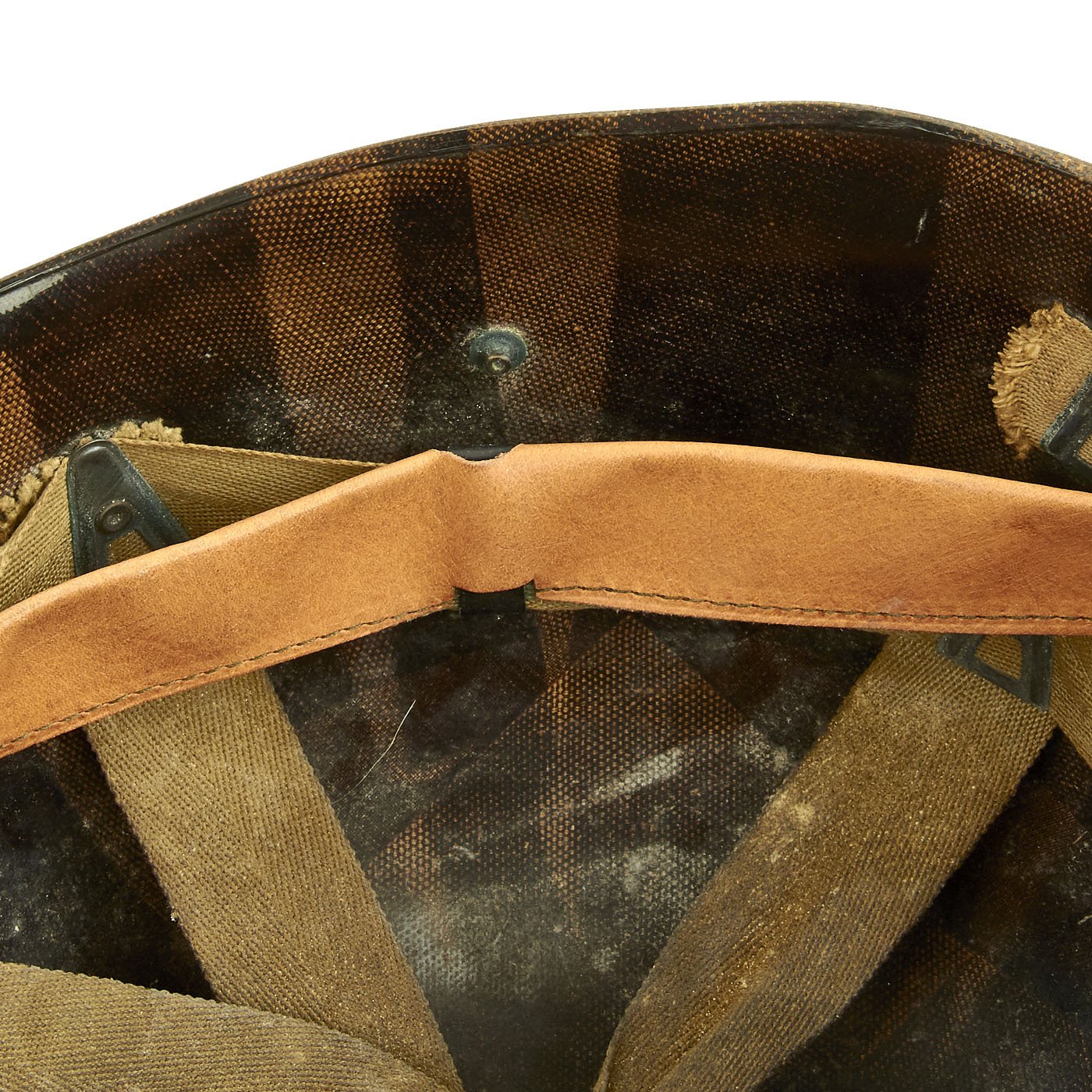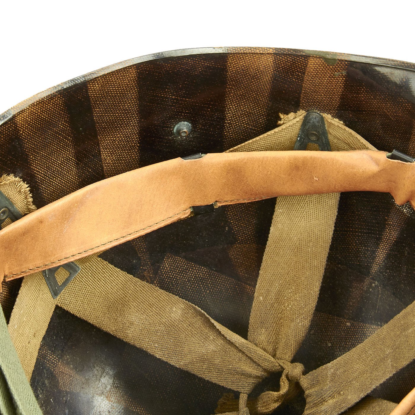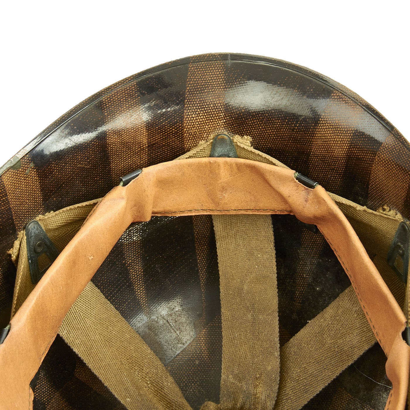 This helmet is a fine example and still retains all of its original Vietnam War parts, and the shell has the original dark OD Green finish. The front of the helmet has a black oak leaf badge attached to the front, the "subdued" color for a Lt. Colonel rank. It looks to be made of aluminum, which has worn through in a few spots. The helmet's heat lot code of I 4451 is clearly visible, which indicates manufacture by Ingersoll Rand Products, who produced a total of 3,174,296 helmet shells between 1965-1968 during the Vietnam Period. The shell still retains the correct Vietnam type chin strap, attached to the swivel bales, with the modified buckle designed to give way under excessive load, such as from an explosion.