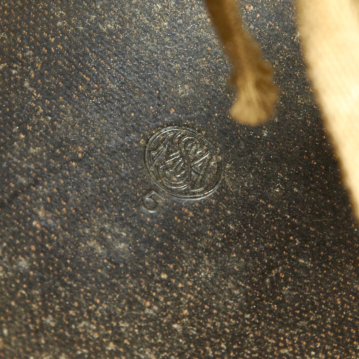 This true US WWII M-1 helmet liner be identified through the frontal eyelet hole. Other correct WWII features include OD Green #3 cotton herringbone twill (HBT) cloth suspension liner, with the webbing in very good shape. This HBT suspension is held tightly within the M-1 helmet liner by rivets and a series of triangular "A" washers. The three upper suspension bands are joined together with the correct OD green string. This way the wearer could adjust the fit. The sweatband is a Vietnam War replacement, and has DSA stock number markings on the back of the securing strap.