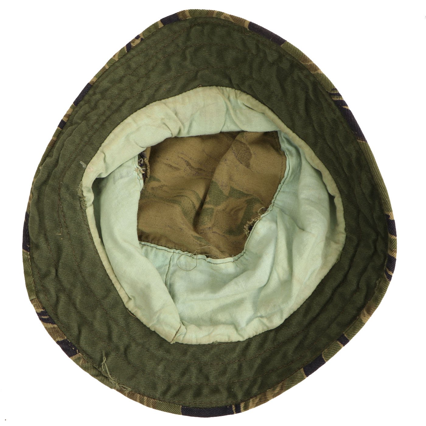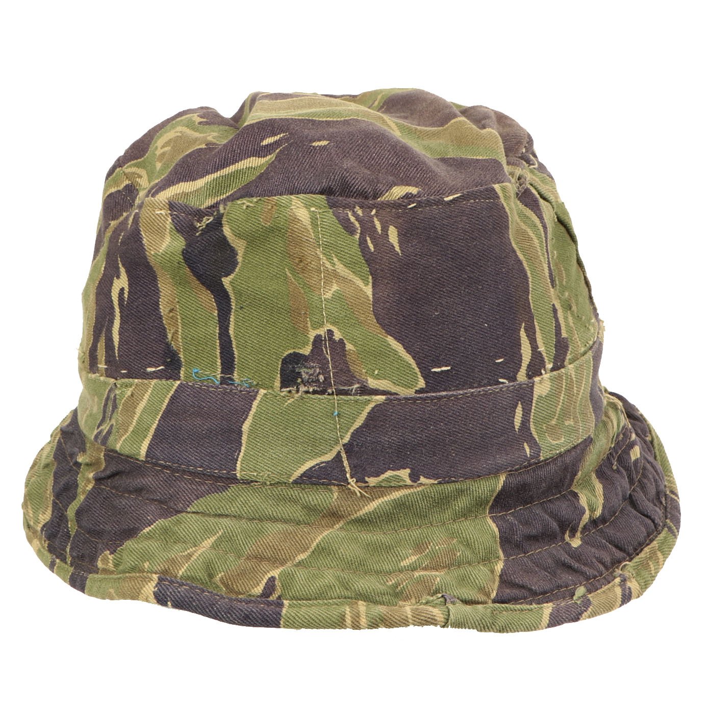 Original Item: Only One Available. This is a very good condition "Tiger Stripe" camouflage Vietnam War Issue Boonie Cap which was manufactured in Japan. This style boonie was used by the MACV-SOG in the field. This example is cotton with an interior lining and name in ink. You can see where patches were removed on either side of the cap with silhouettes of stitching remaining. Its a clearly Japanese made example by both quality, materials and construction.