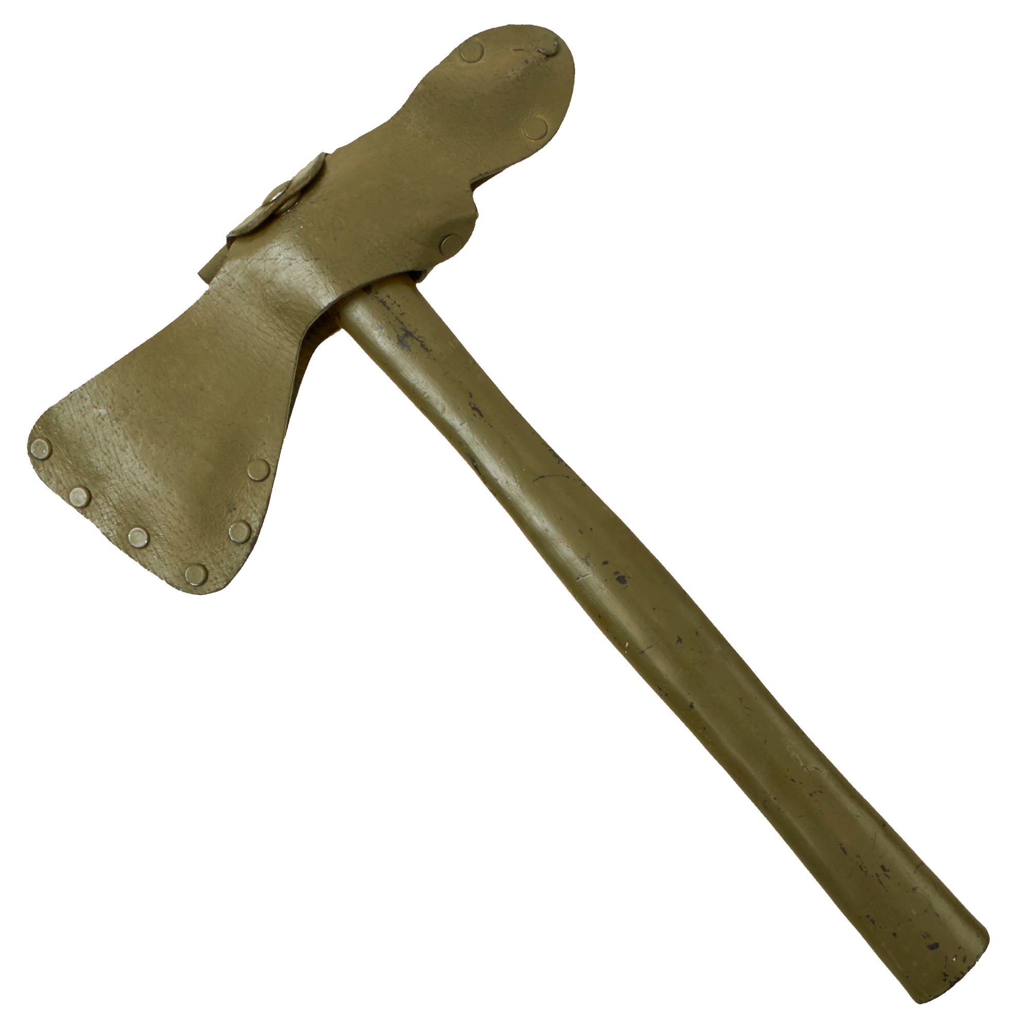 Original Item: Only One Available. This is a remarkable specimen of an early "Lagana" tomahawk manufactured by the American Tomahawk Company. The tomahawk is in excellent condition, with all of its paint intact and with no significant damage, except for some minor wear from storage. The leather cover/sheath is also in great condition, with only a few areas of paint loss. This would make a valuable addition to the collection of any serious enthusiast of edged weapons.
