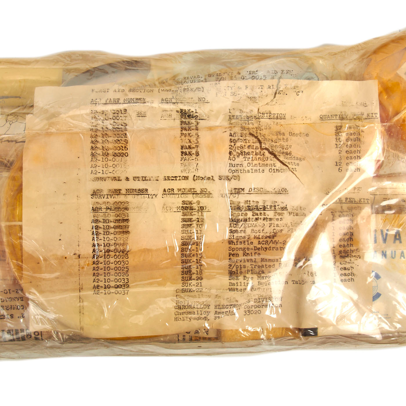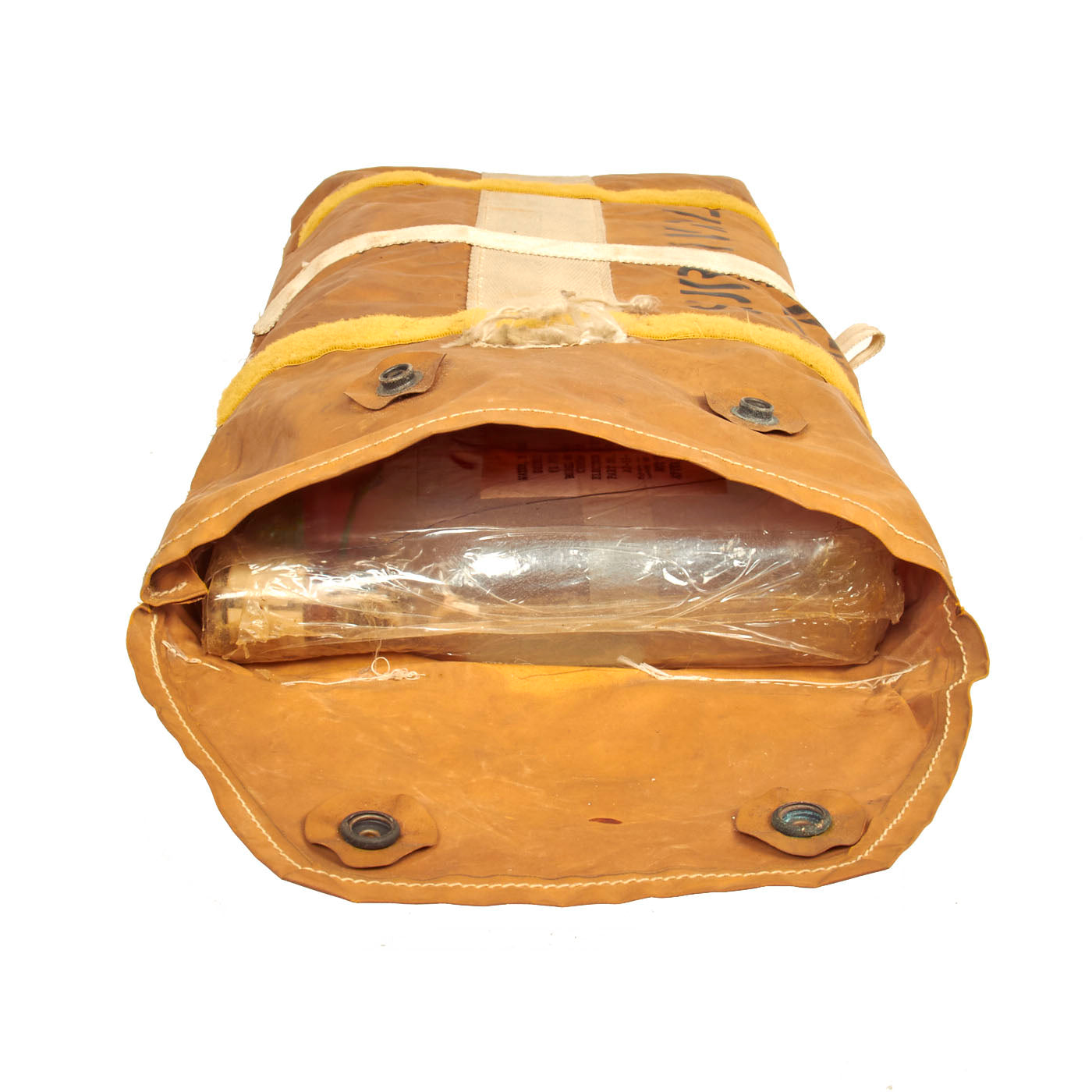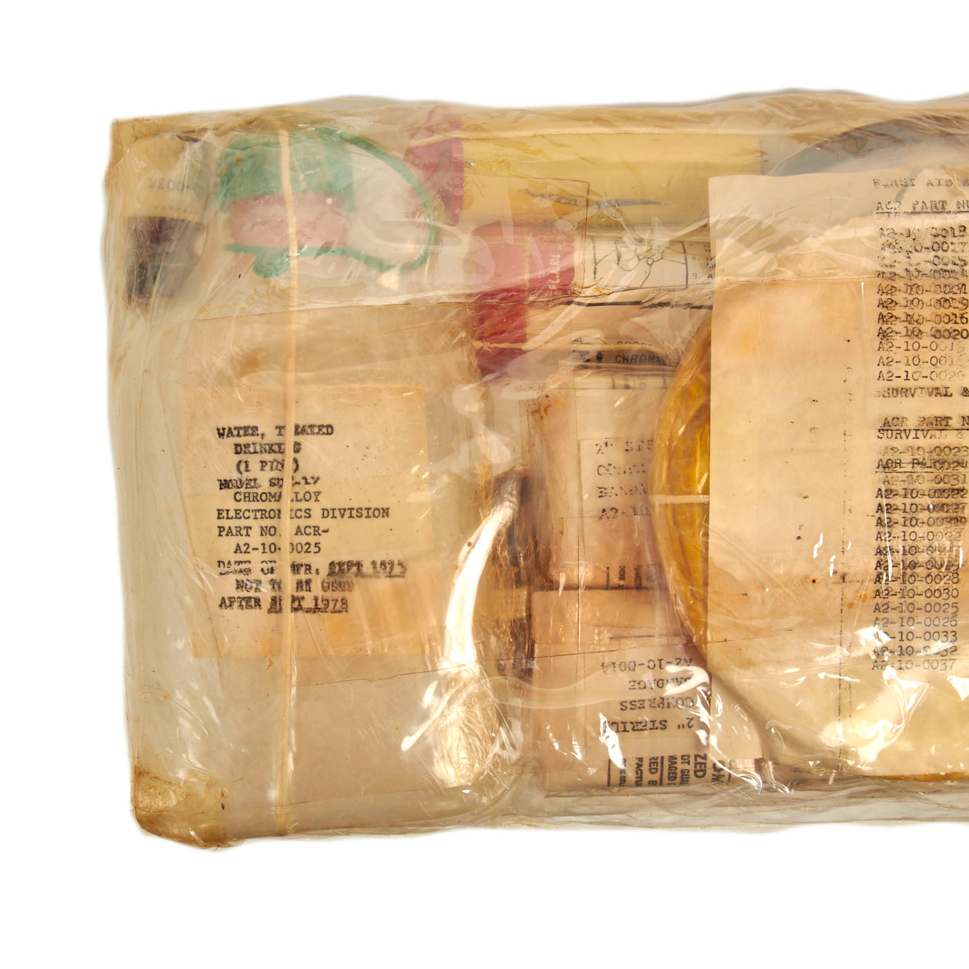 We have not been able to identify this kit completely, but from the contents this does appear to be a lifeboat / raft survival kit. The kit itself is unopened and appears to be complete with original contents, even has treated drinking water still in the flasks!