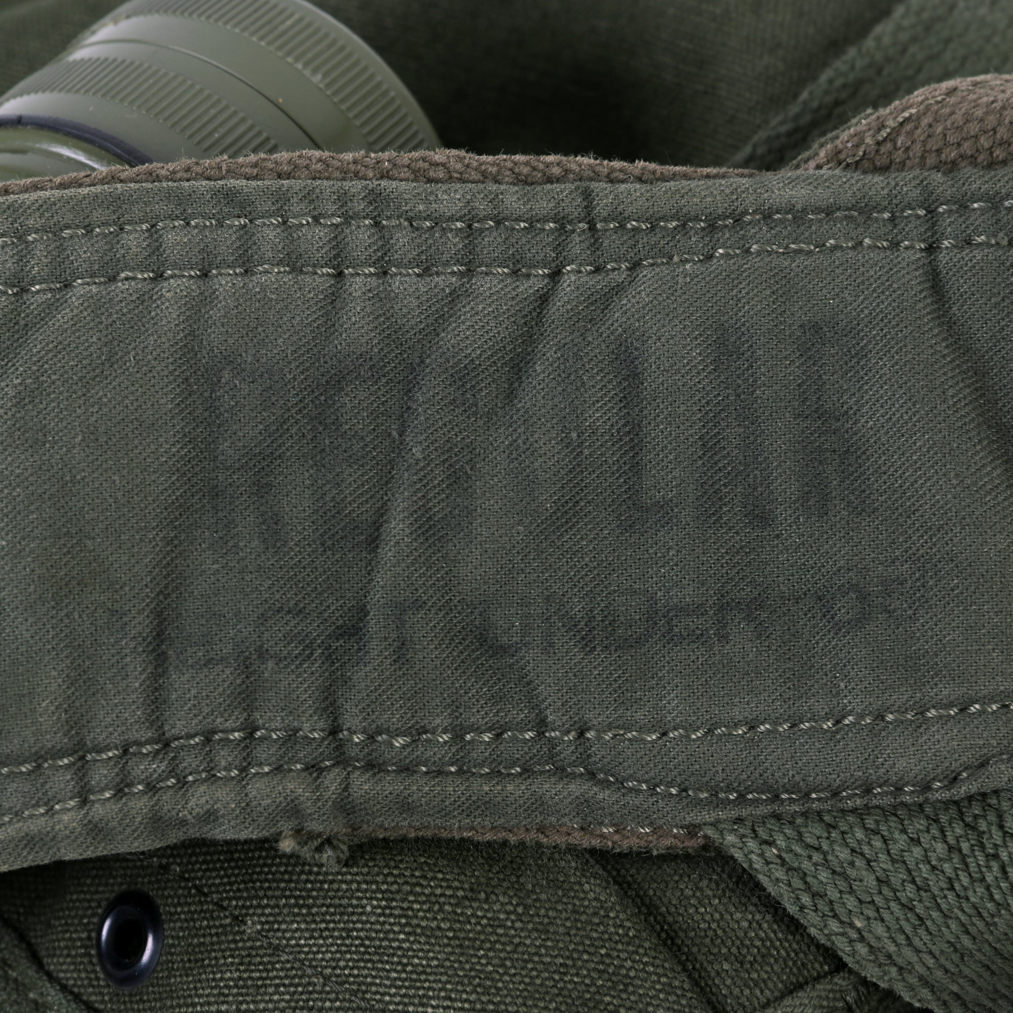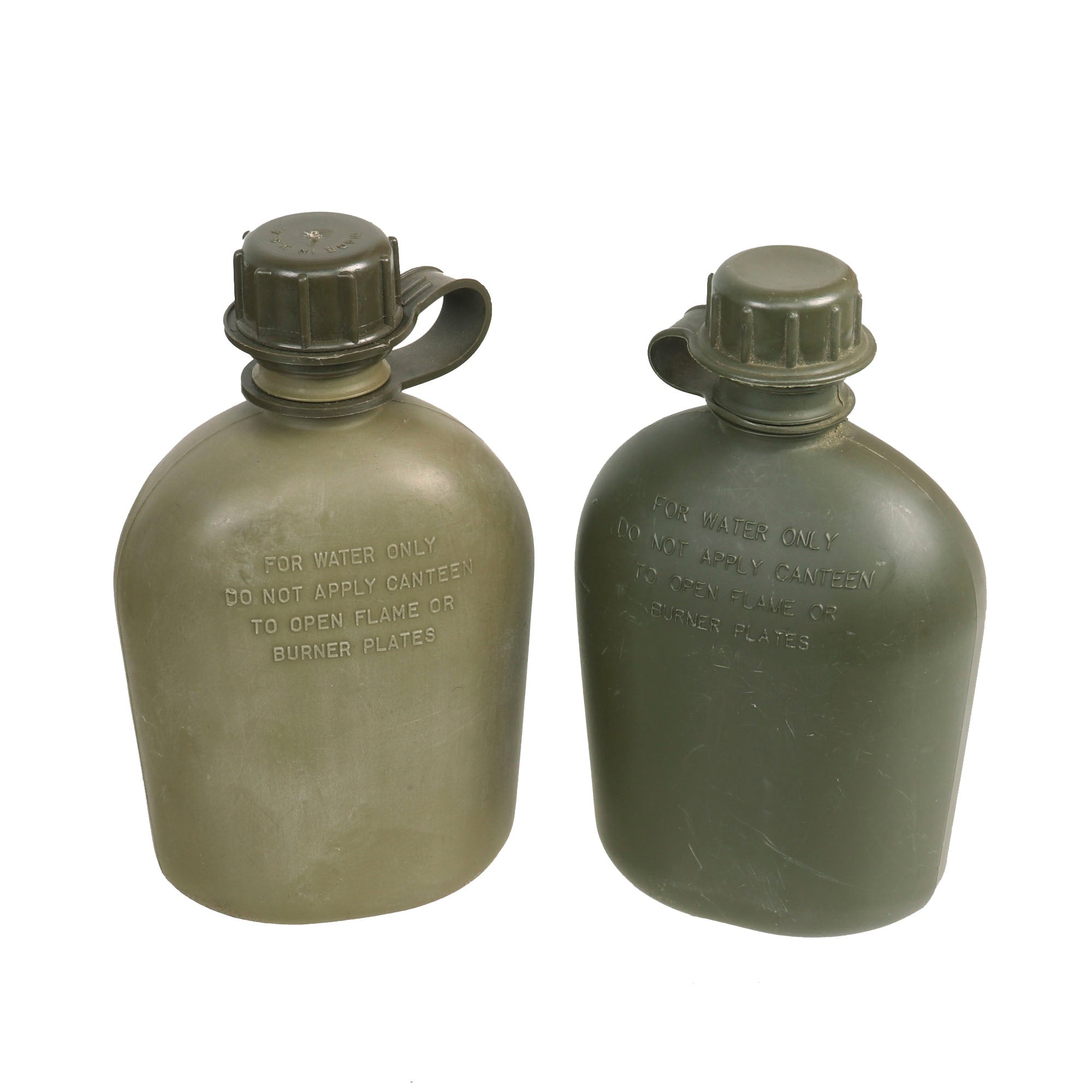 -2 Vietnam War 1qt Canteens with M-56 Canteen Covers. The 1qt canteen in 1956 was essentially the same metal body with plastic cap carried throughout WWII and Korea. In 1962, the plastic 1qt canteens were designed and began limited production in 63 on a larger scale. However, it is not until the mid-60's that they become the most common style. The M-56 Canteen Cover was issued without major changes from 1956 through 1966. During this period, there was a transition from a felted insulation lining to a synthetic fleece lining.The only cosmetic exterior change occurred in 1967. At this time the trim around the canteen cover flaps was changed from cotton to a nylon trim.