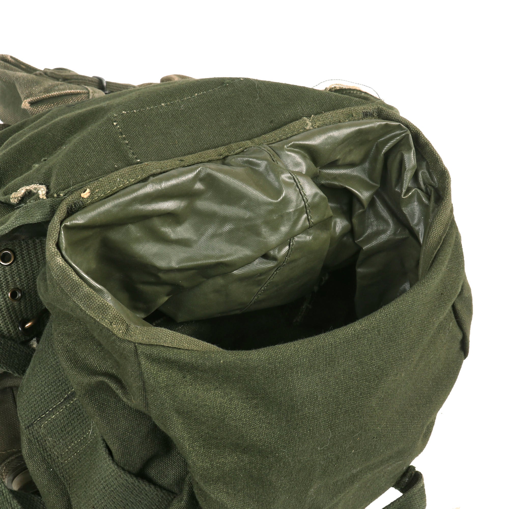 -Vietnam War M-56 / M-61 Individual Field Pack. The "buttpack" was originally a square design with no liner. In 1961 the pack was revised to be larger and it had the addition of the rubber throat in the liner.