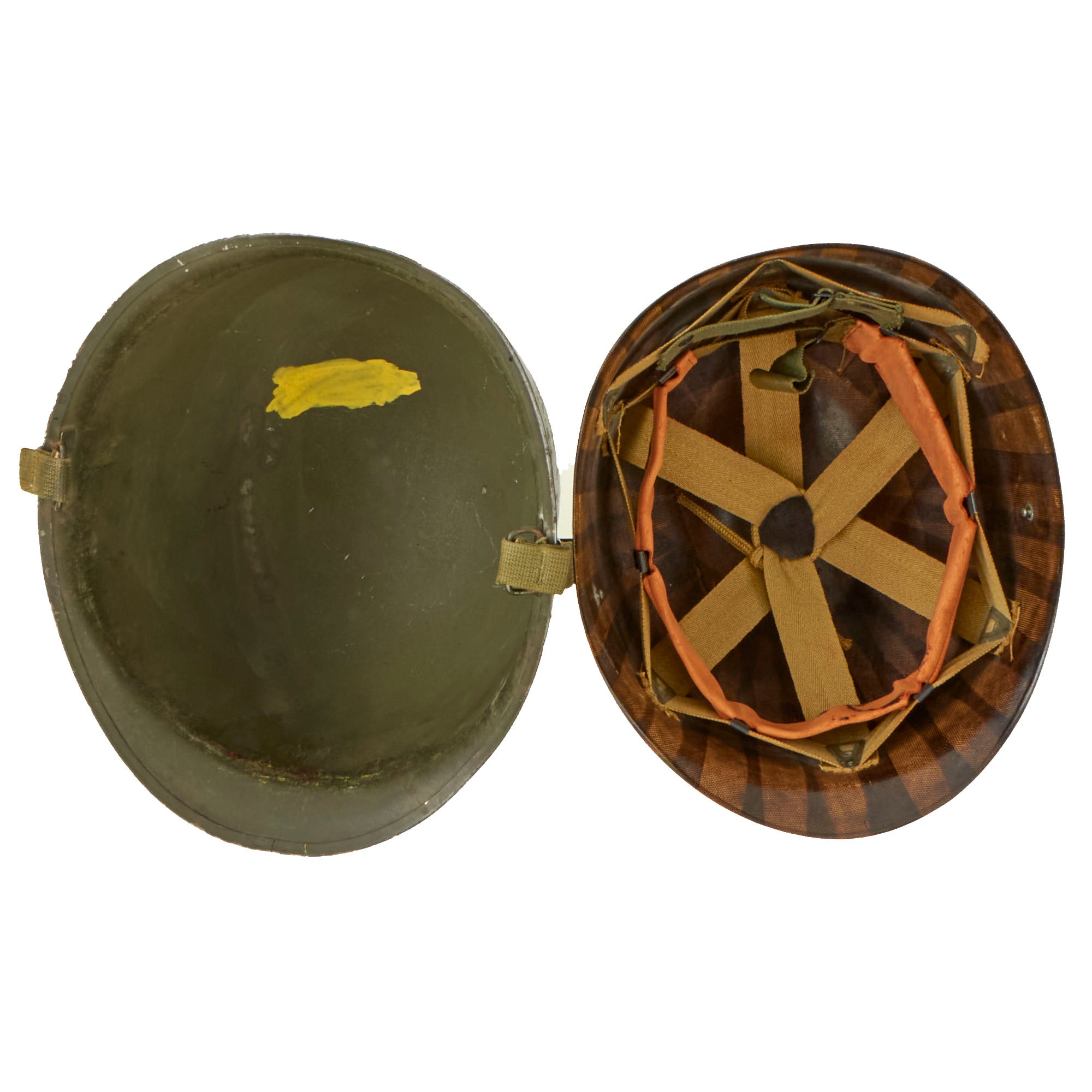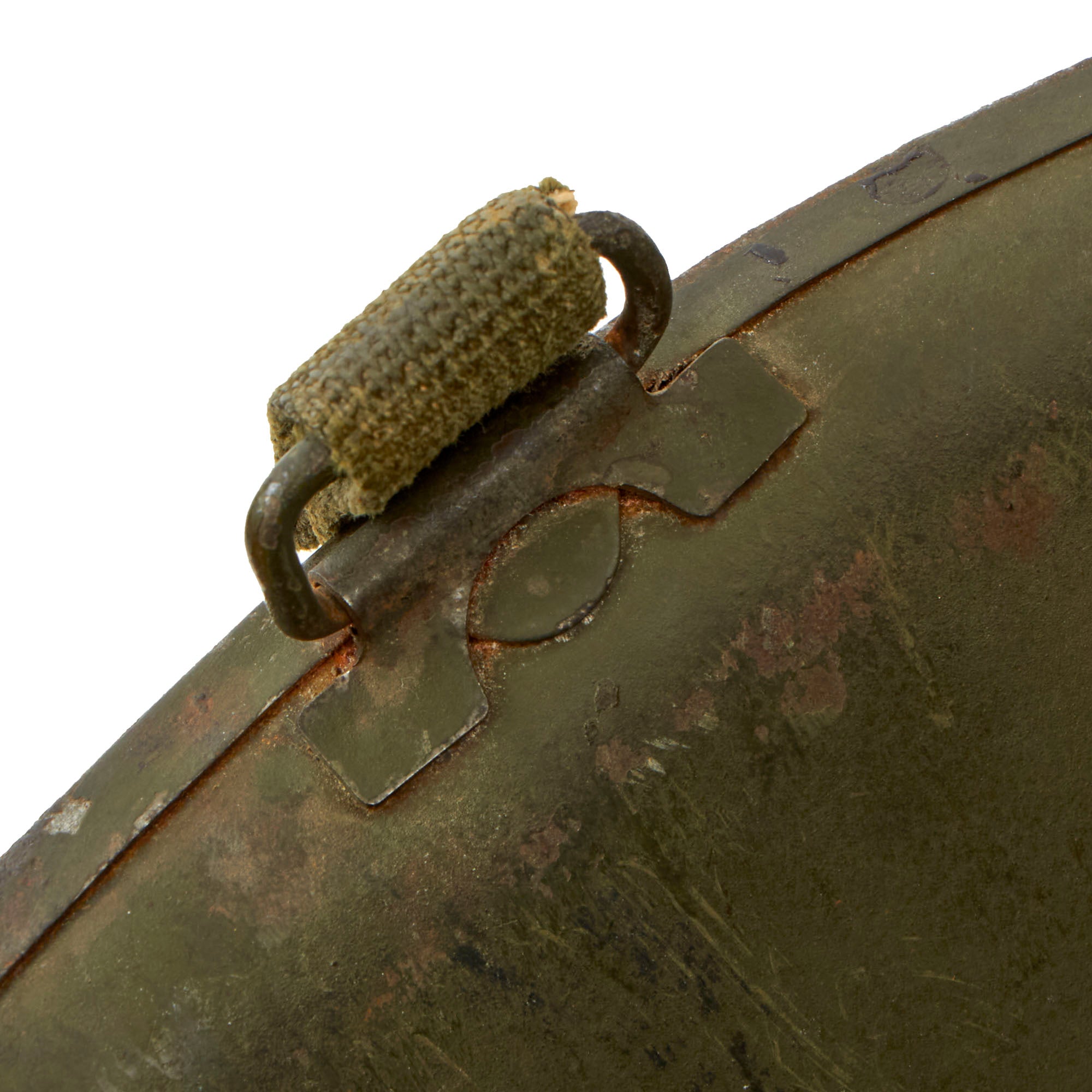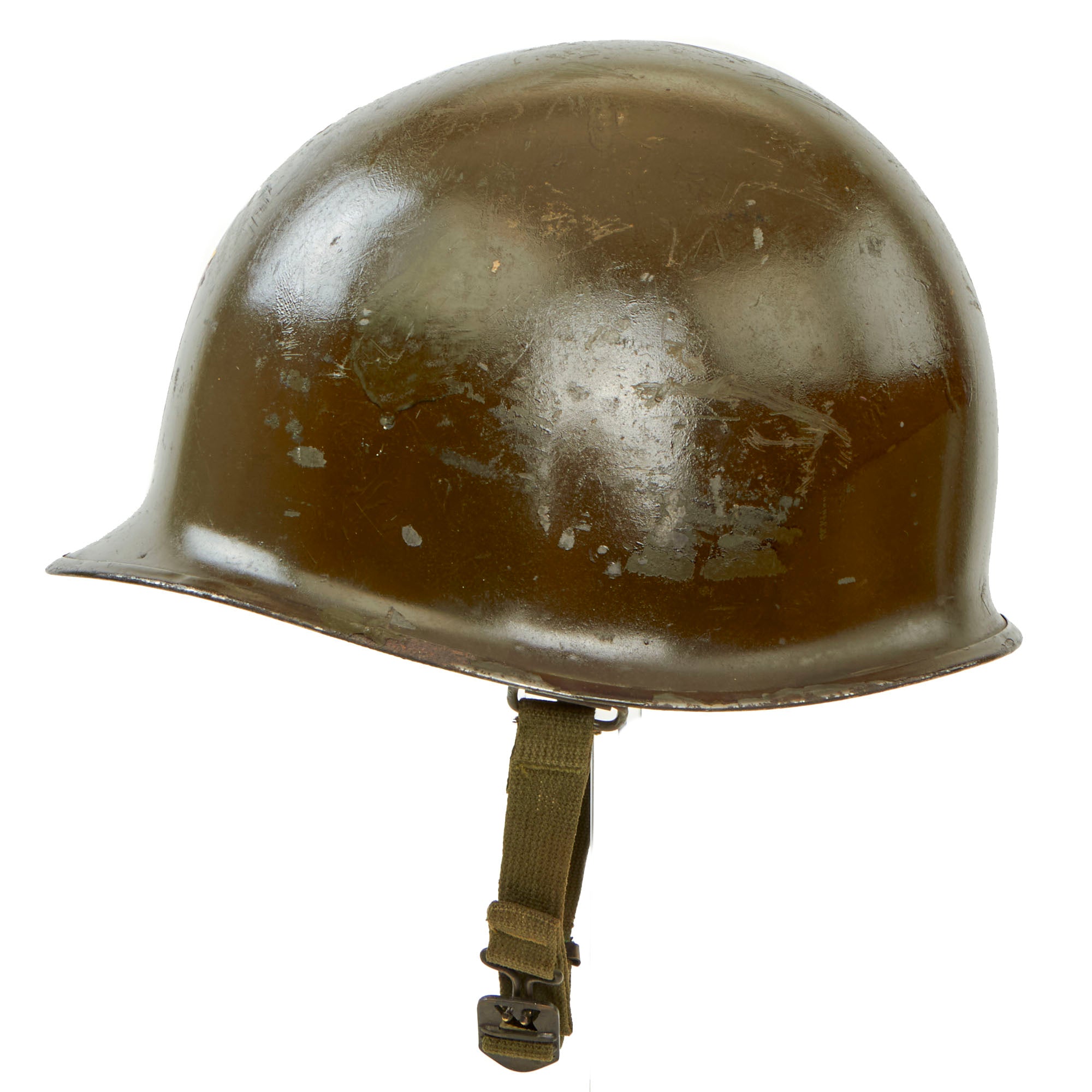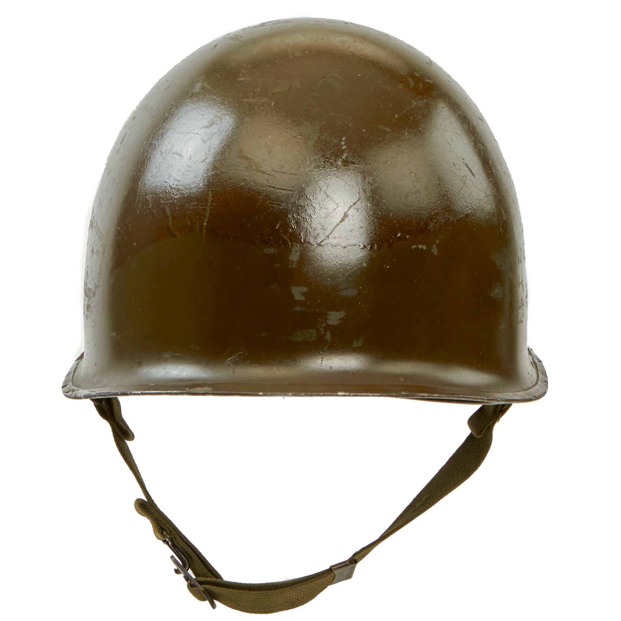 This very good condition M1 shell has correct late war moveable chinstrap loops, called "bales," and a stainless steel rim with a front fully welded seam. These rims were both rust resistant and had "non-magnetic qualities" that reduced the chance of error readings when placed around certain sensitive equipment (such as a compass). In November 1944 the specification was changed to have the rim seam in the rear of the helmet.