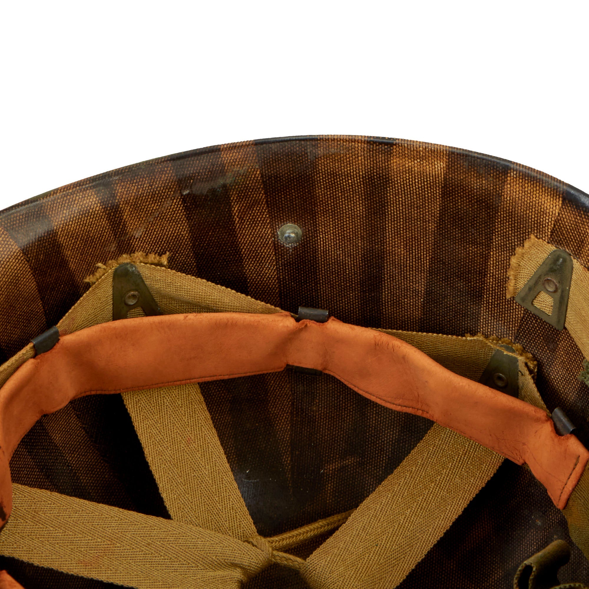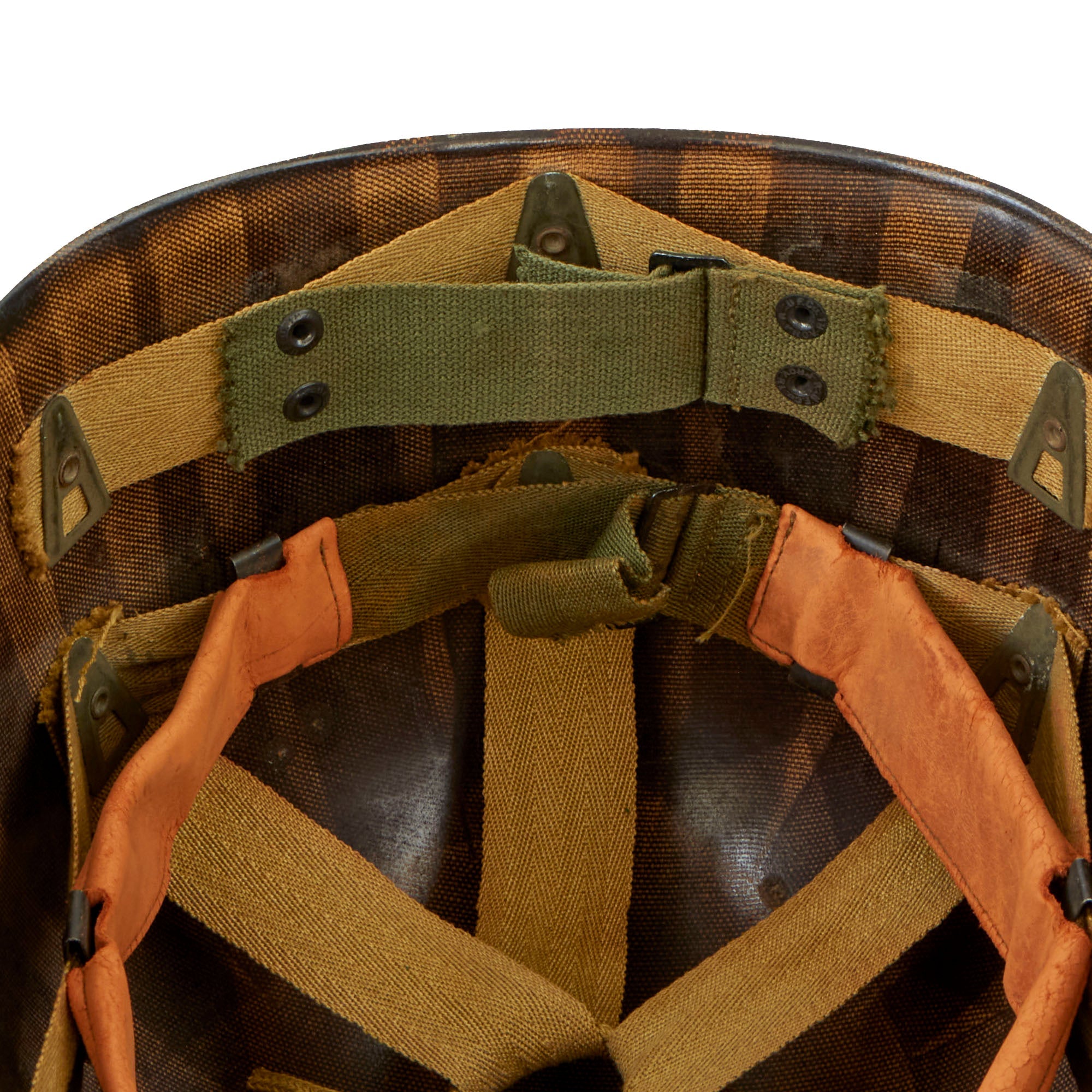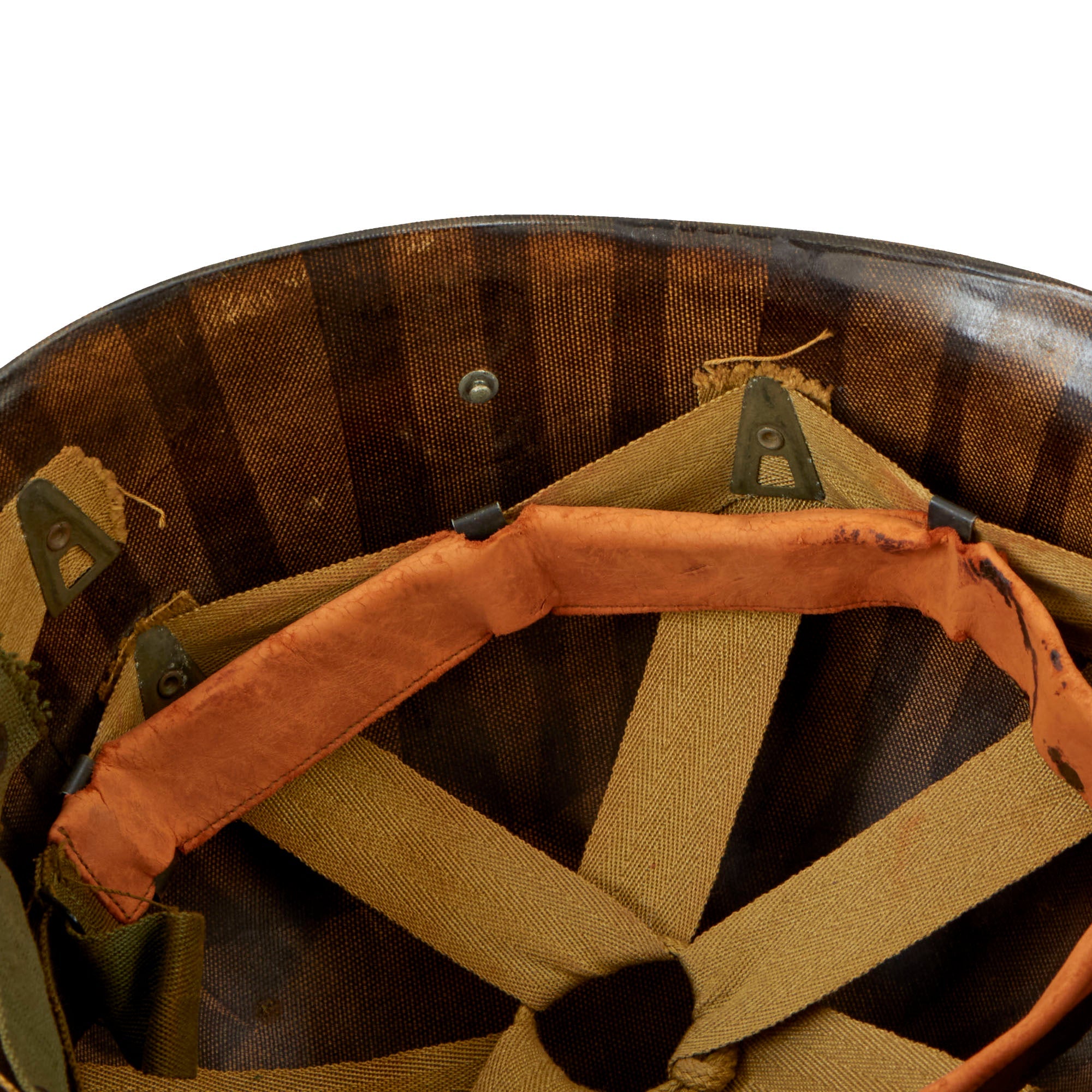 This true US WWII M-1 helmet liner can be identified through the frontal eyelet hole. Other correct WW2 features include cotton herringbone twill (HBT) cloth suspension which dates to early Vietnam. This HBT suspension is held tightly within the M-1 helmet liner by rivets and a series of black triangular "A" washers. The three upper suspension bands are joined together with a correct string. This way the wearer could adjust the fit. Unfortunately the rear nape strap is slightly worn.
