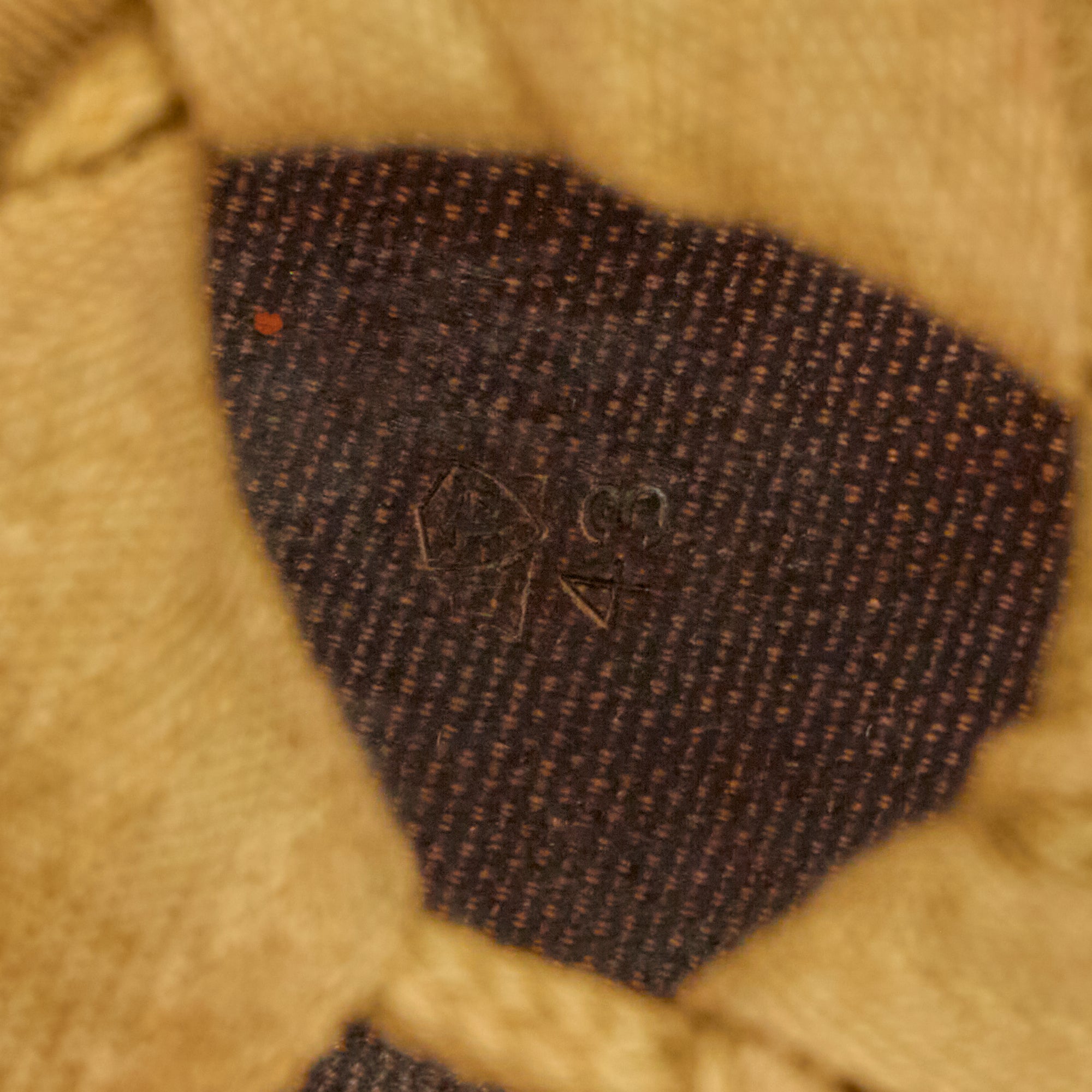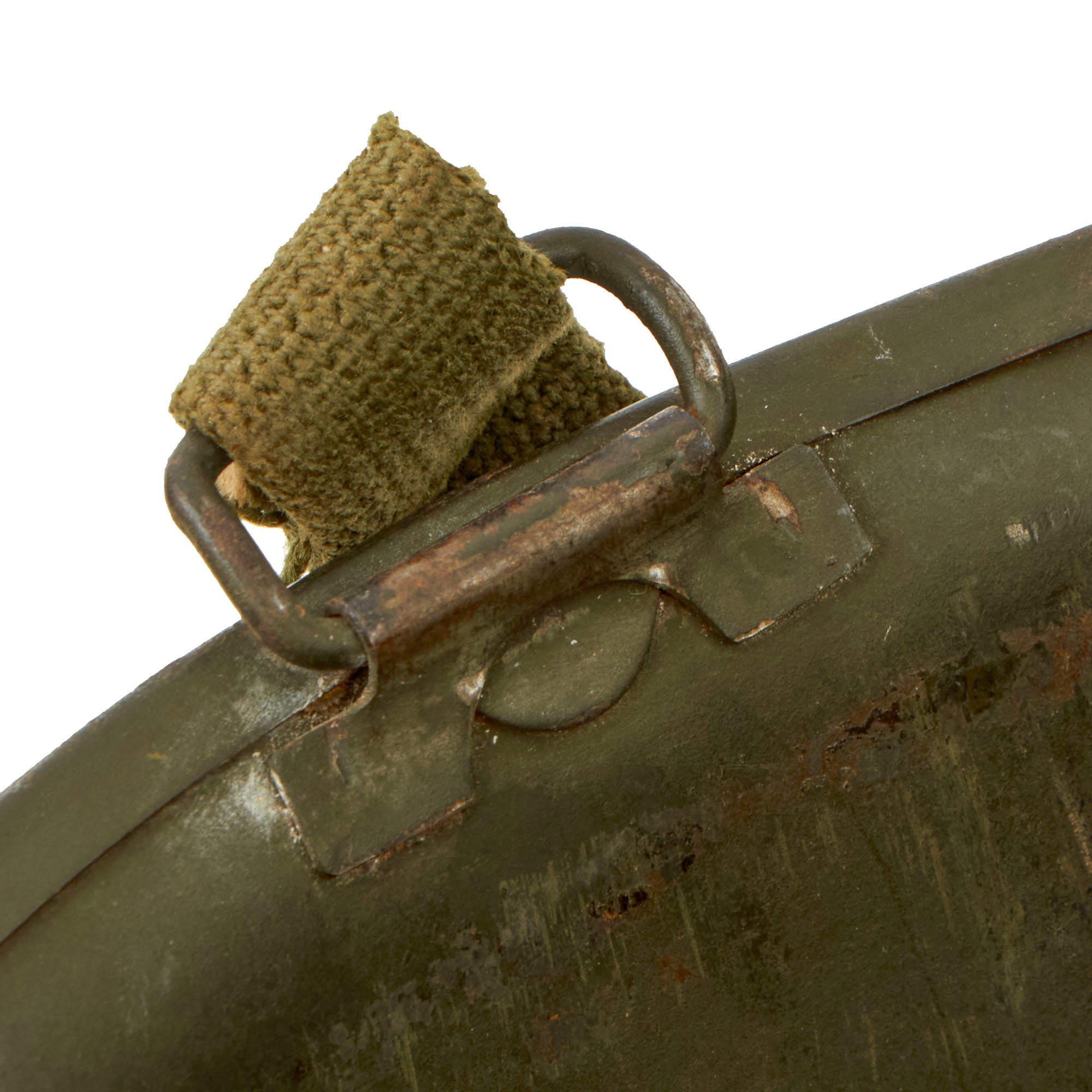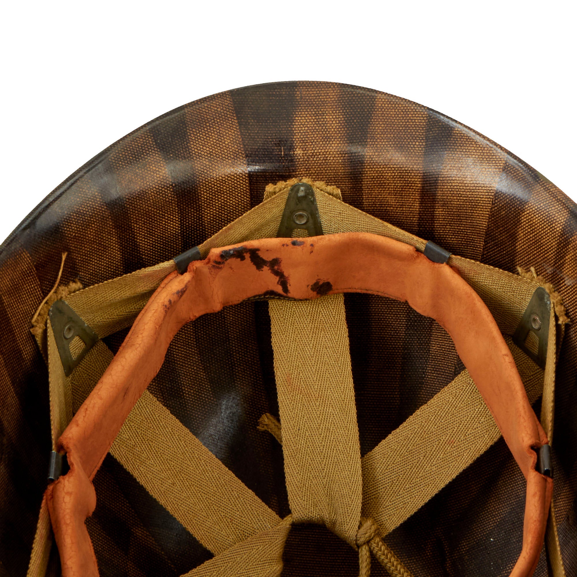 This true US WWII M-1 helmet liner can be identified through the frontal eyelet hole. Other correct WW2 features include cotton herringbone twill (HBT) cloth suspension which dates to early Vietnam. This HBT suspension is held tightly within the M-1 helmet liner by rivets and a series of black triangular "A" washers. The three upper suspension bands are joined together with a correct string. This way the wearer could adjust the fit. Unfortunately the rear nape strap is slightly worn.