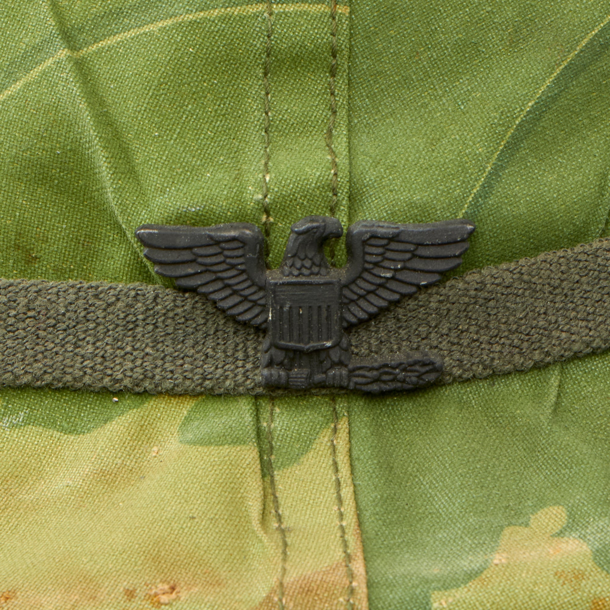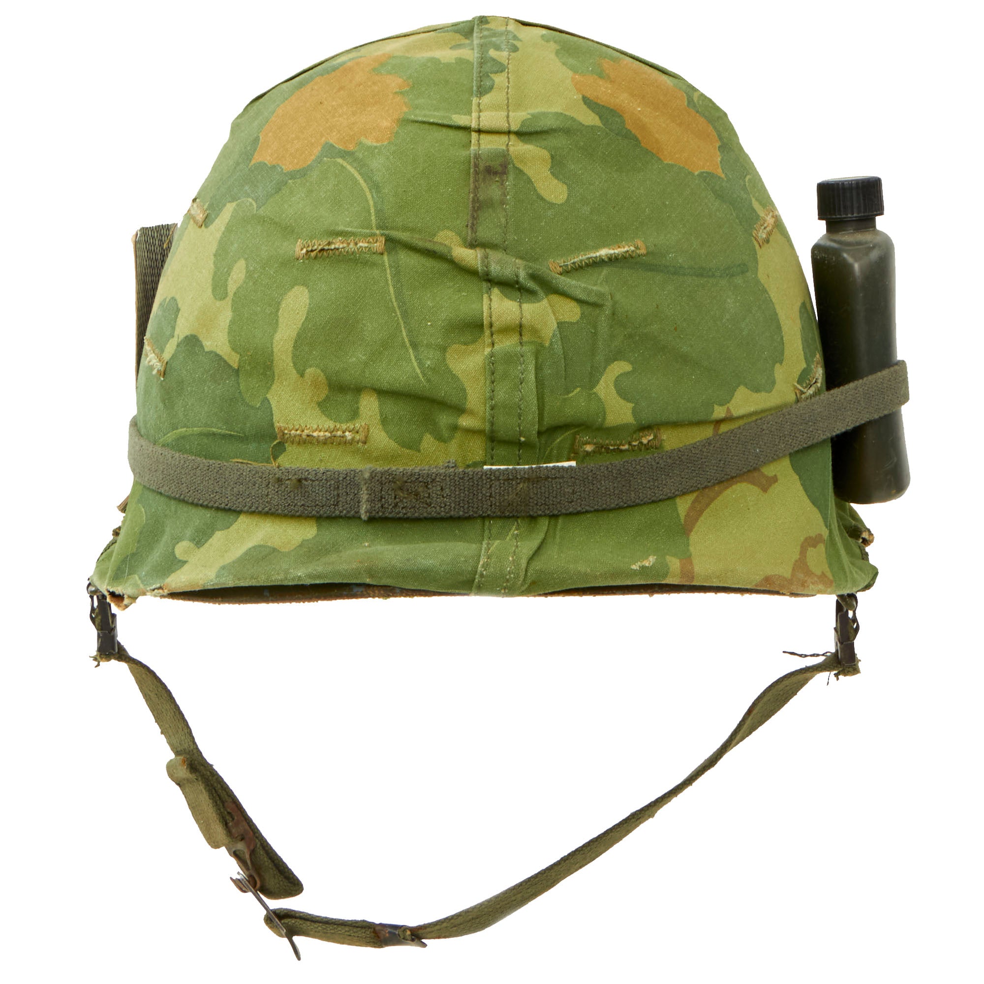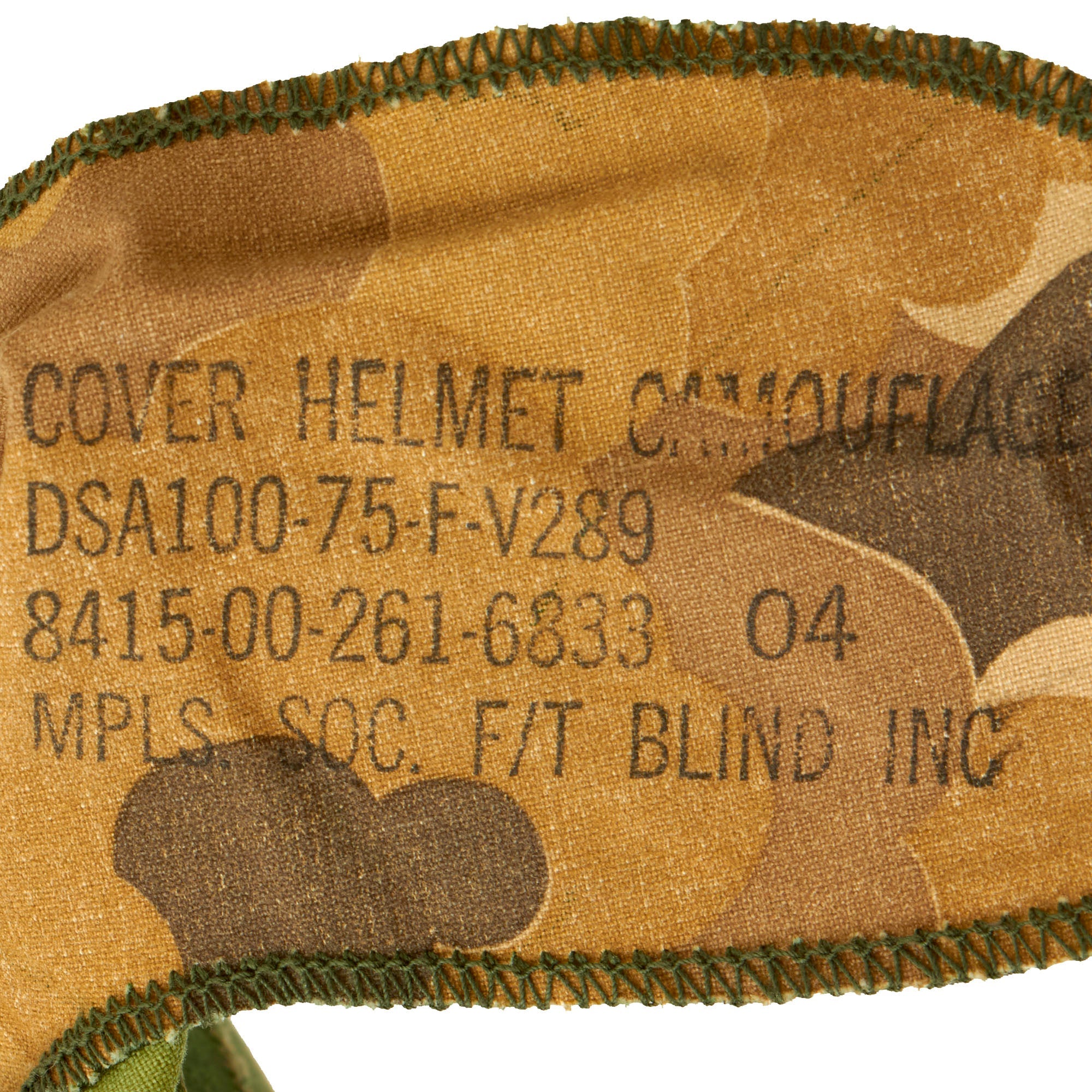 It is equipped with a standard Reversible Camouflage cover, which has a contract date code for 1975. It is held in place by the elastic band that retains the cover. The helmet, cover, shell, and liner are all correct for a Vietnam war helmet.