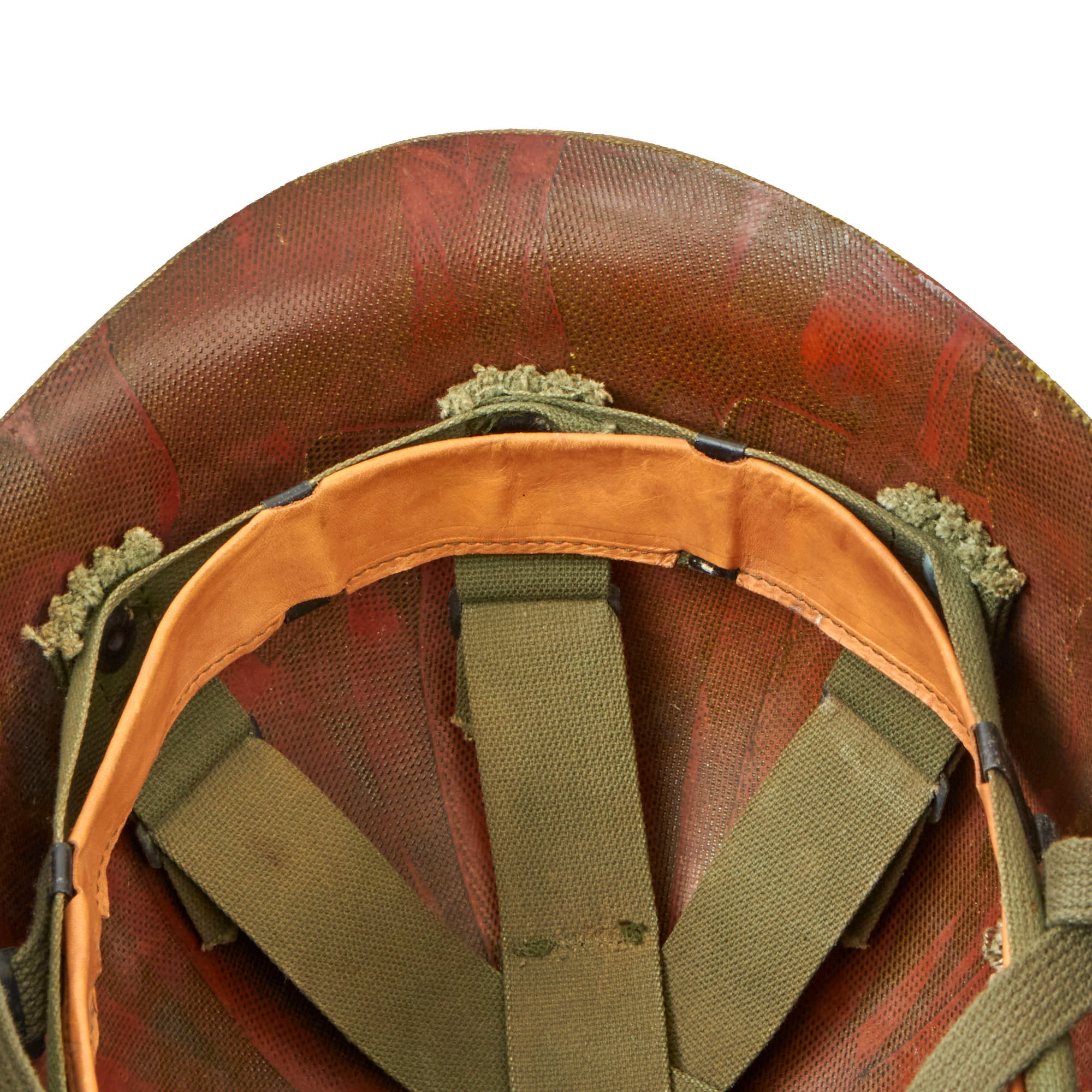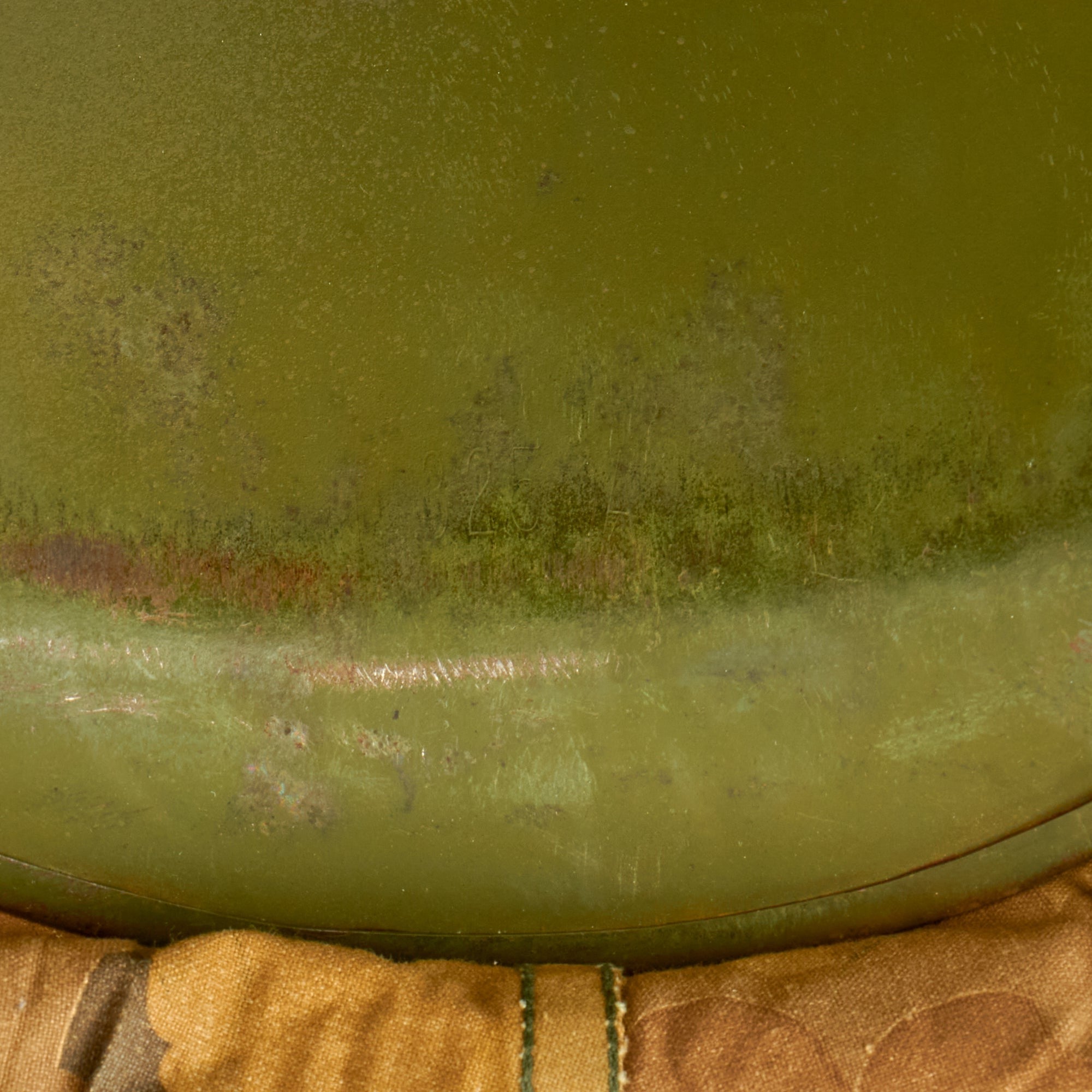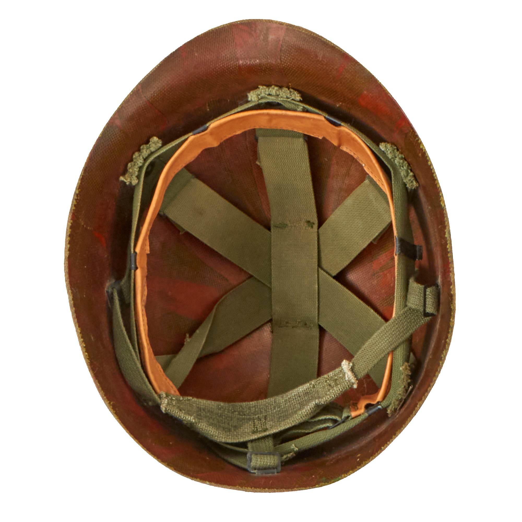The helmet comes complete with high pressure Vietnam War era liner. The liner does not have a frontal eyelet, indicating that it is a post Korean war manufacture. A new suspension system for the M1 Helmet Liner was introduced in 1964, with this one being in great condition.