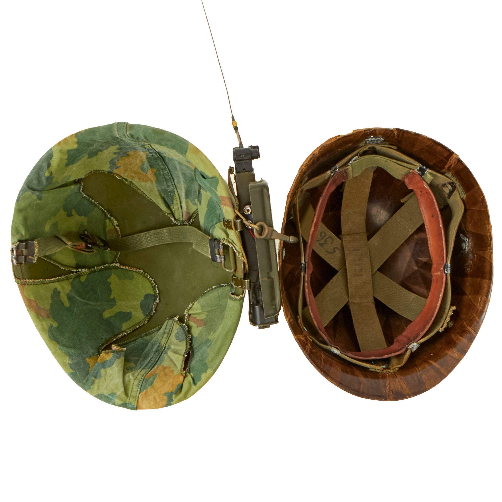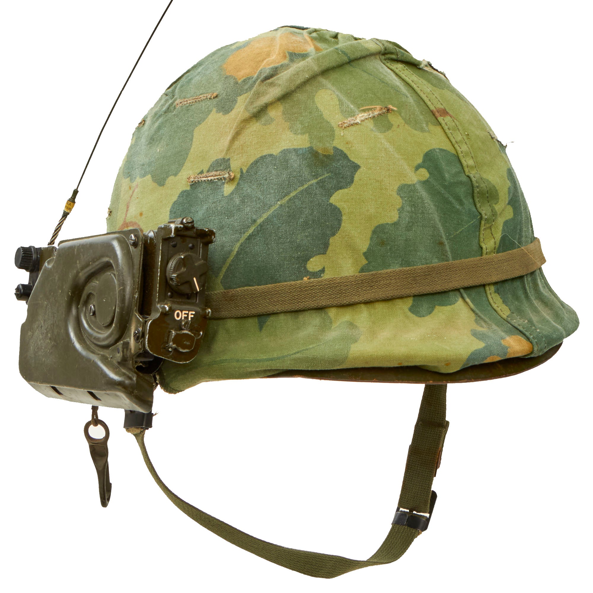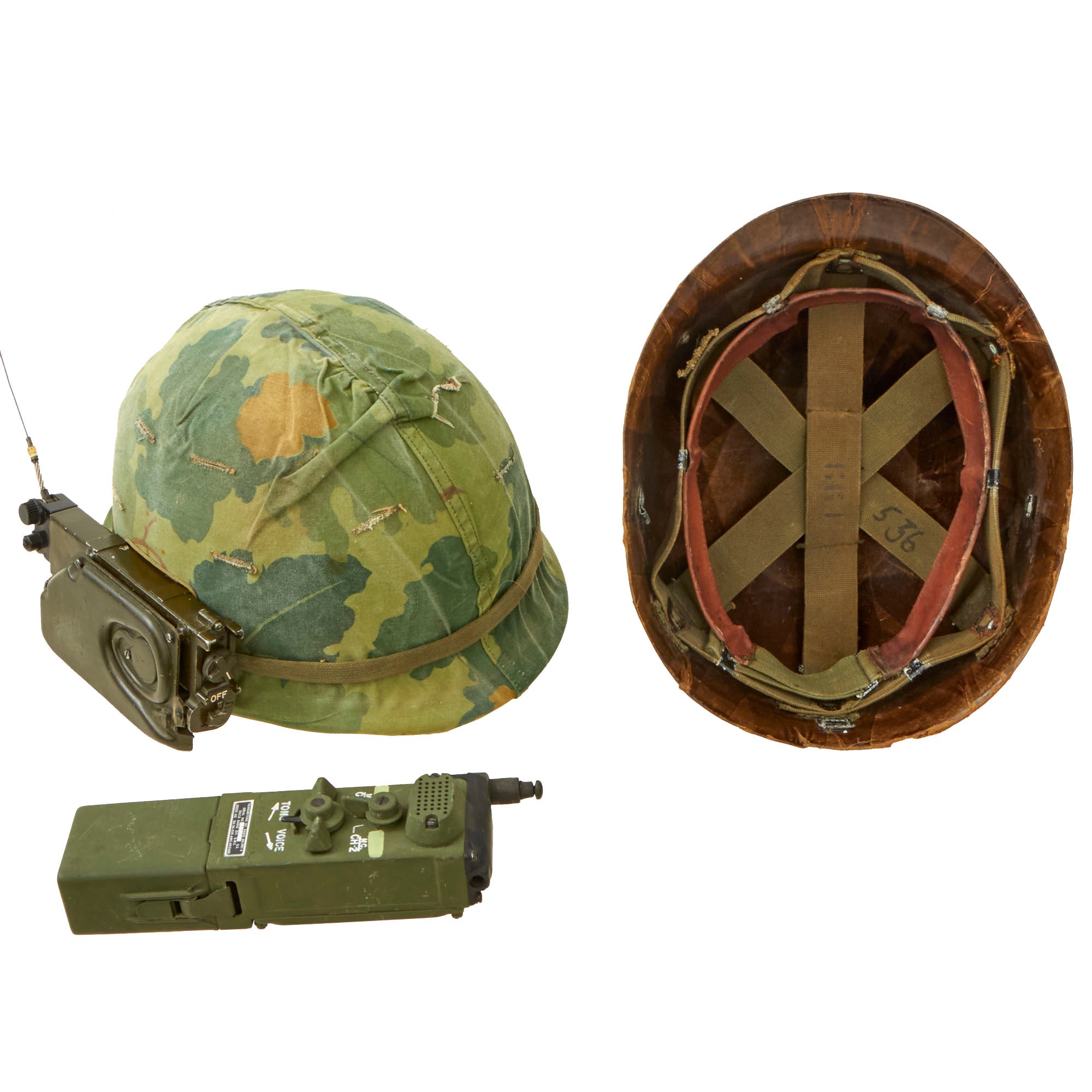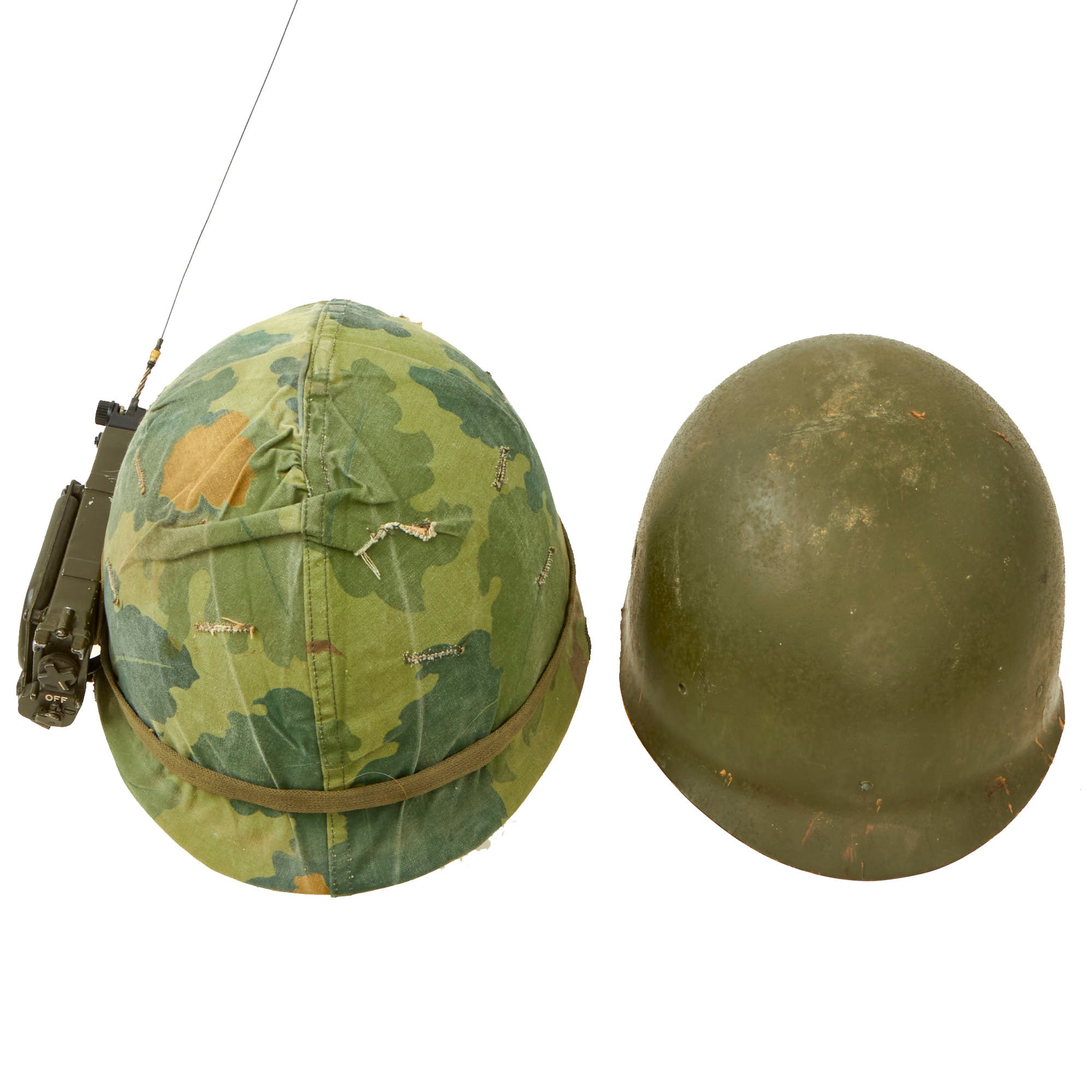 Original Item. Only One Available. This is a genuine Vietnam War M1 Helmet with a camouflage cover and an attached issue AN/PRR-9 radio receiver offered in very good condition. The radio has not been tested for functionality but appears complete and undamaged. These receivers were intended to work with the PRT-4 squad radio transmitter. They were intended to replace the bulky PRC-6, which had been in use since the Korean war. Also included is a transmitter AN/PRT-4A which is carried in the hand or on the belt. It is missing the battery. This is a very difficult set to find together.