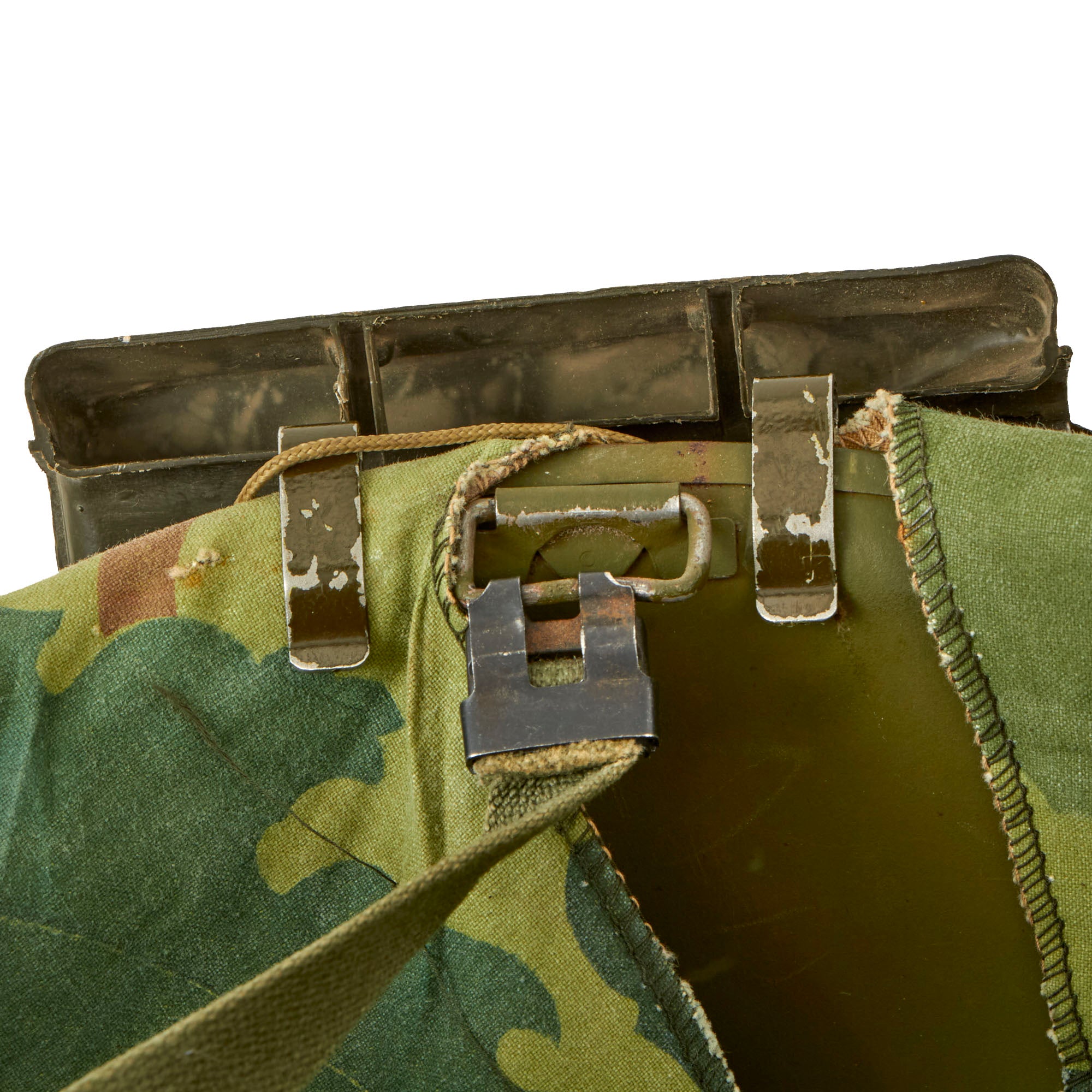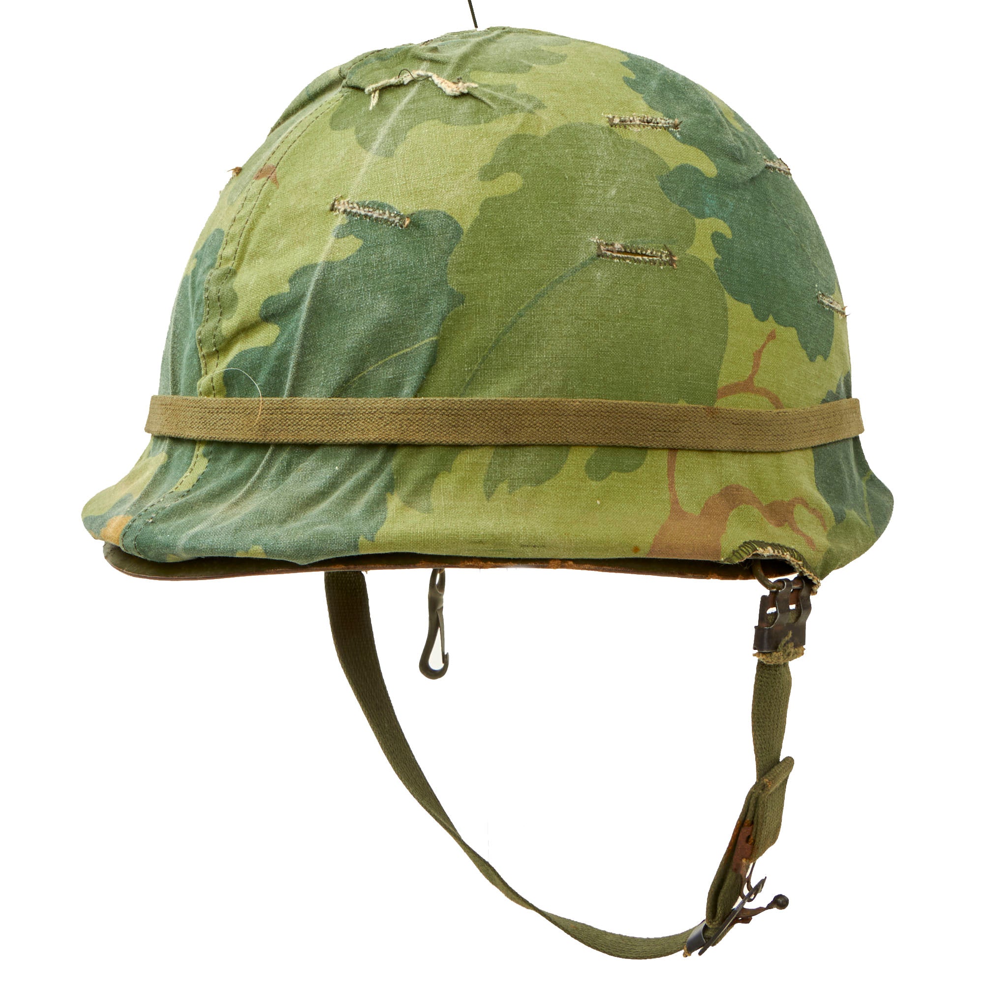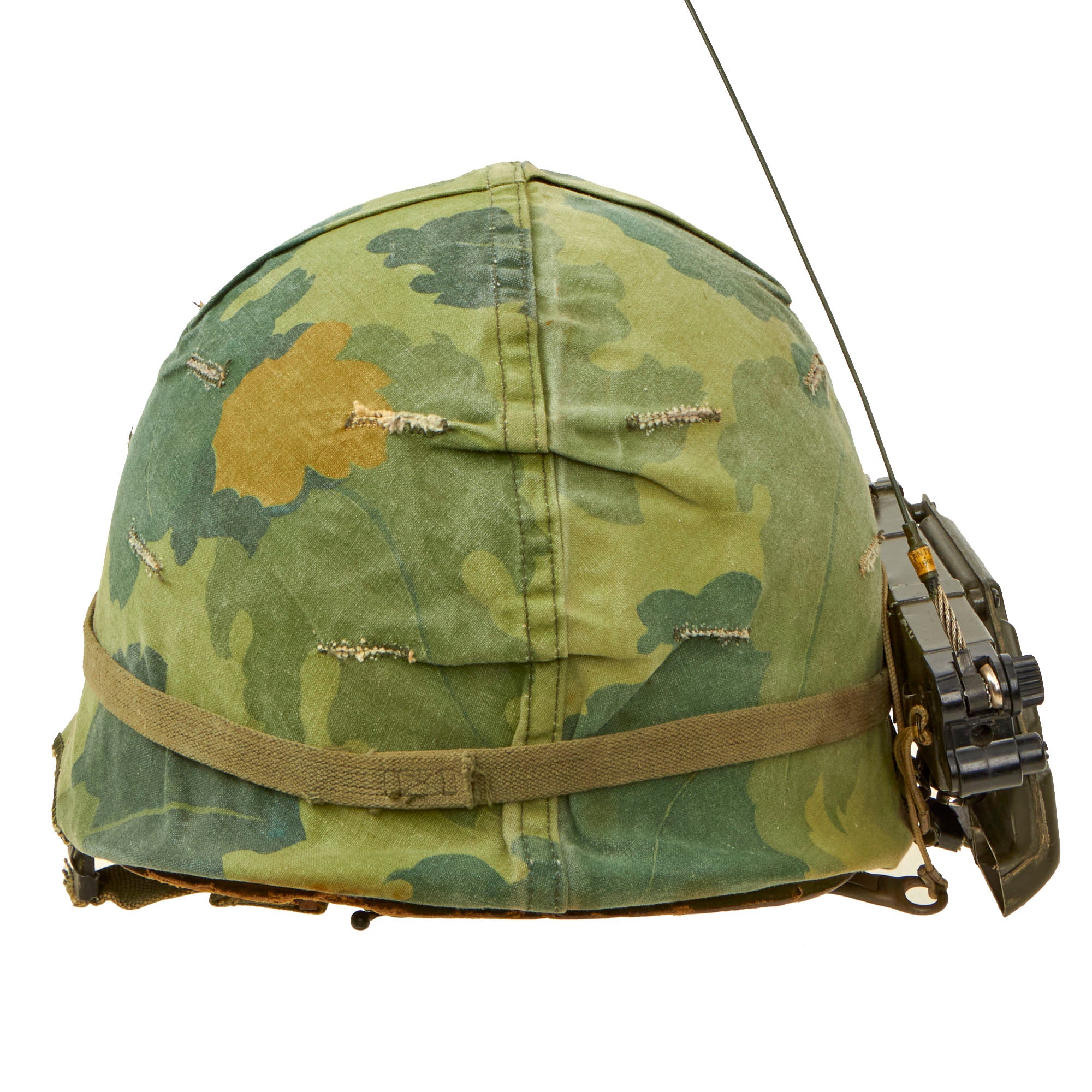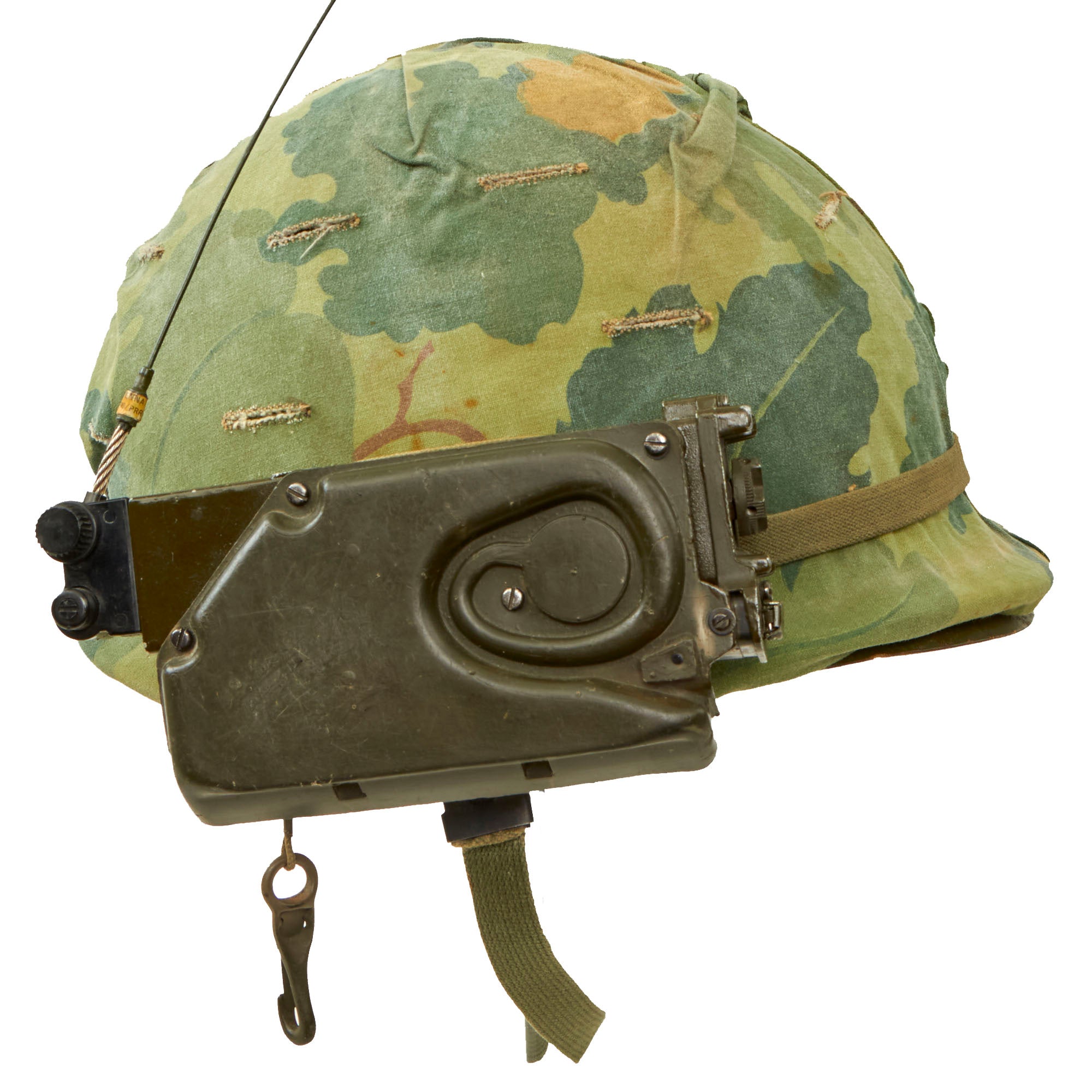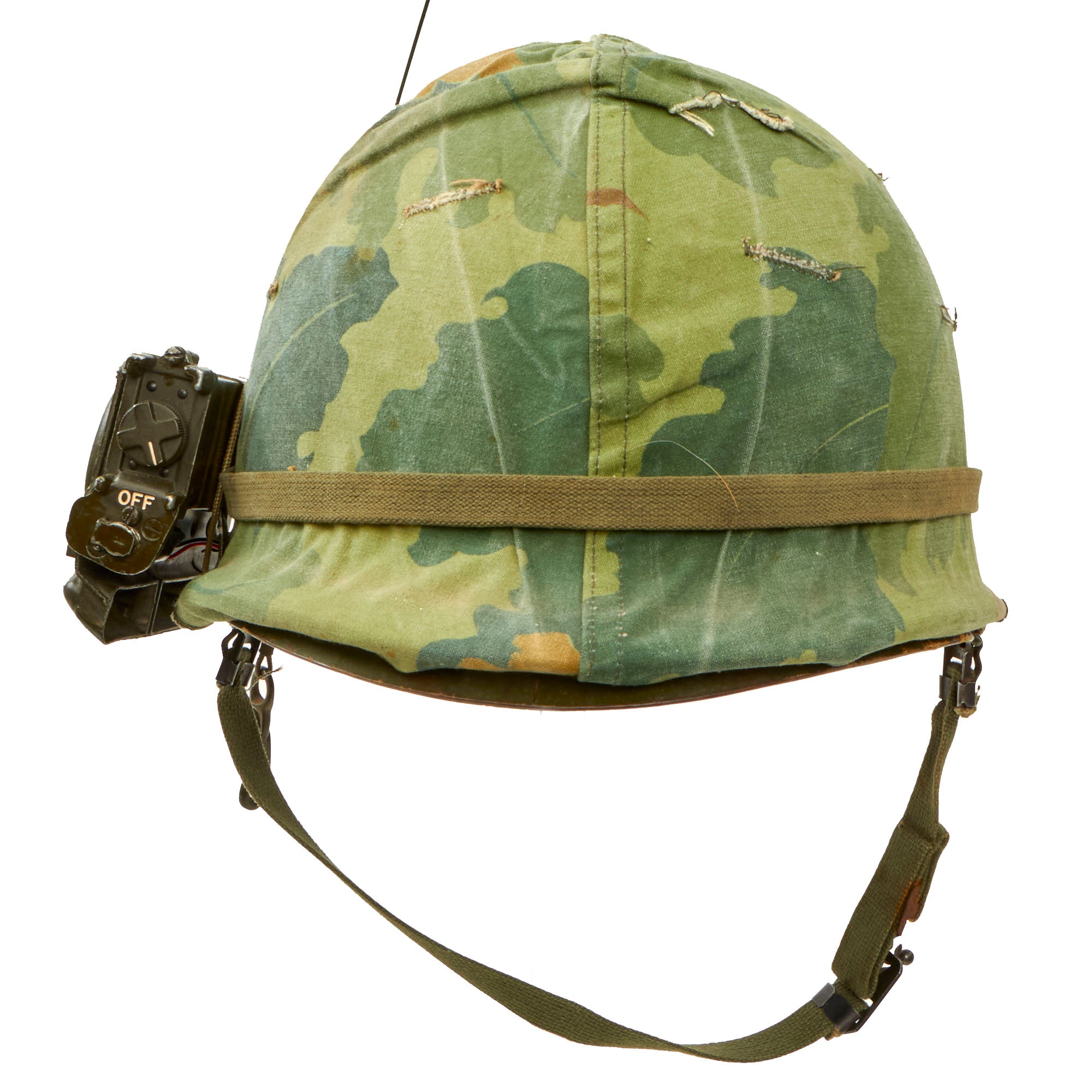 Original Item. Only One Available. This is a genuine Vietnam War M1 Helmet with a camouflage cover and an attached issue AN/PRR-9 radio receiver offered in very good condition. The radio has not been tested for functionality but appears complete and undamaged. These receivers were intended to work with the PRT-4 squad radio transmitter. They were intended to replace the bulky PRC-6, which had been in use since the Korean war. Also included is a transmitter AN/PRT-4A which is carried in the hand or on the belt. It is missing the battery. This is a very difficult set to find together.
