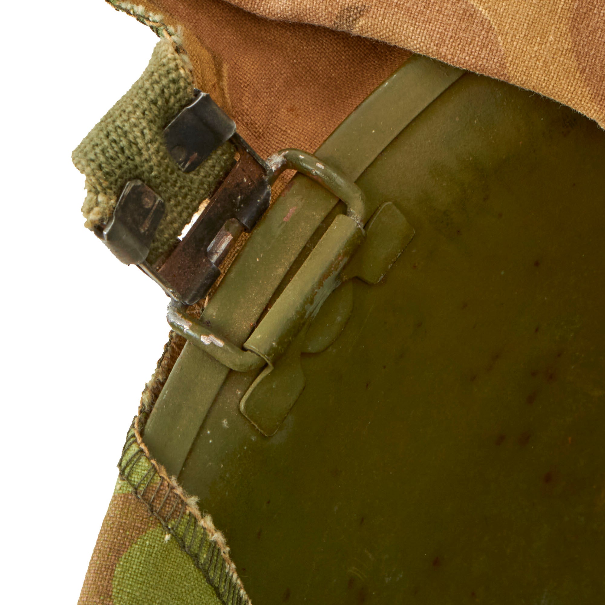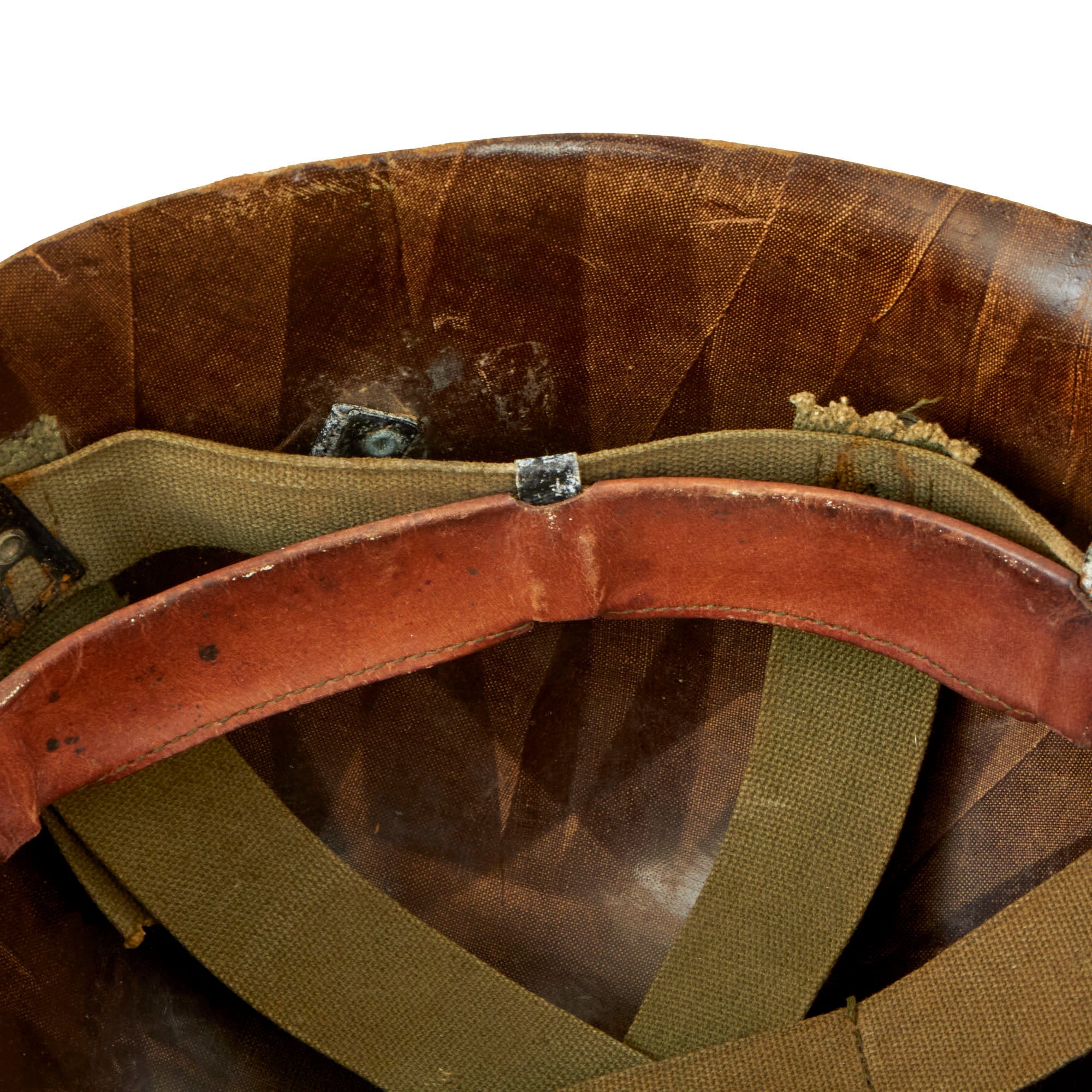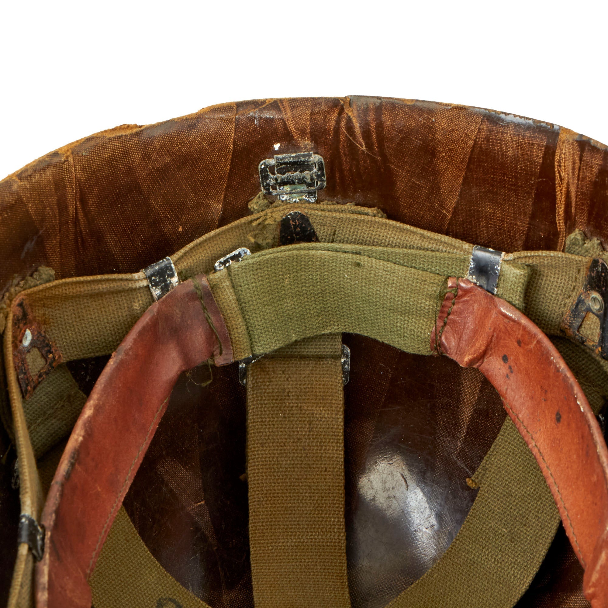 This helmet is a fine example and still retains all of its original Vietnam War parts and the shell has all original corked grain paint.