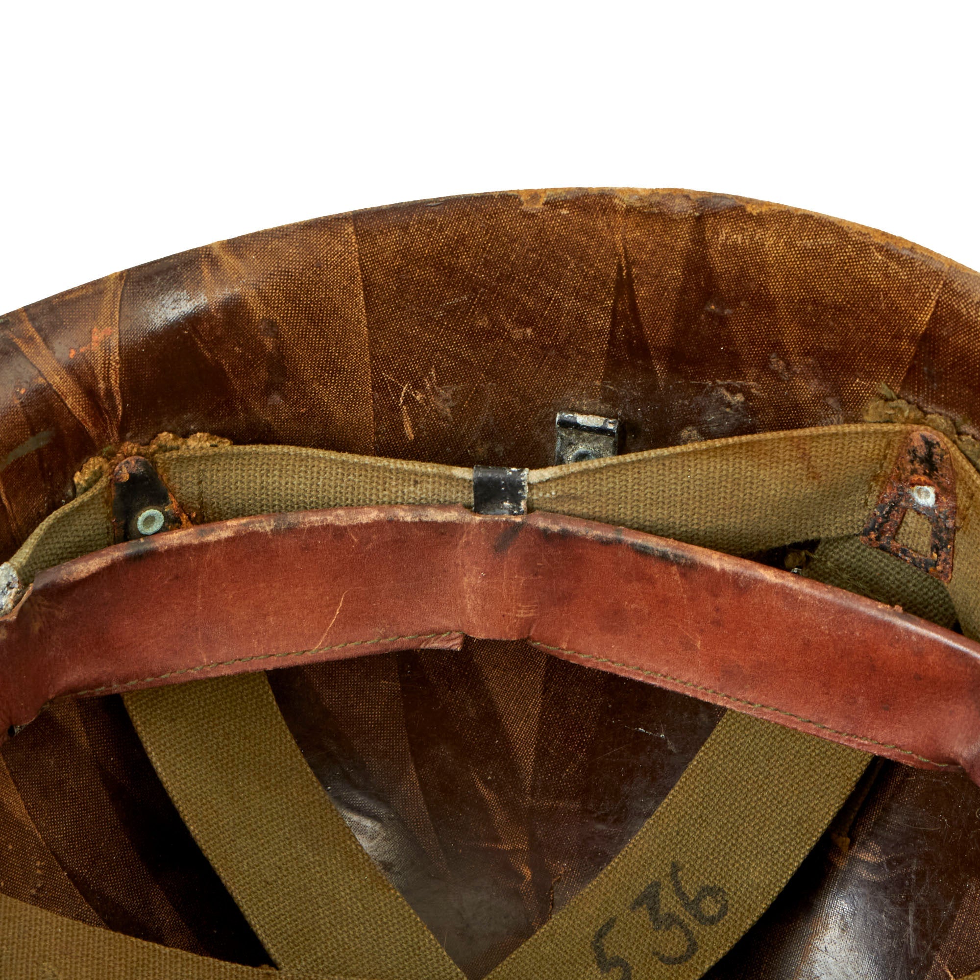 The liner is a correct high pressure 1960s issue liner. The rigging is intact and in great shape, with a nice leather sweatband. The cover is original and in very good condition. It has some stains and small holes around the edge, but is definitely solid. It is dated 1970 and marked on the underside of one of the flaps:
