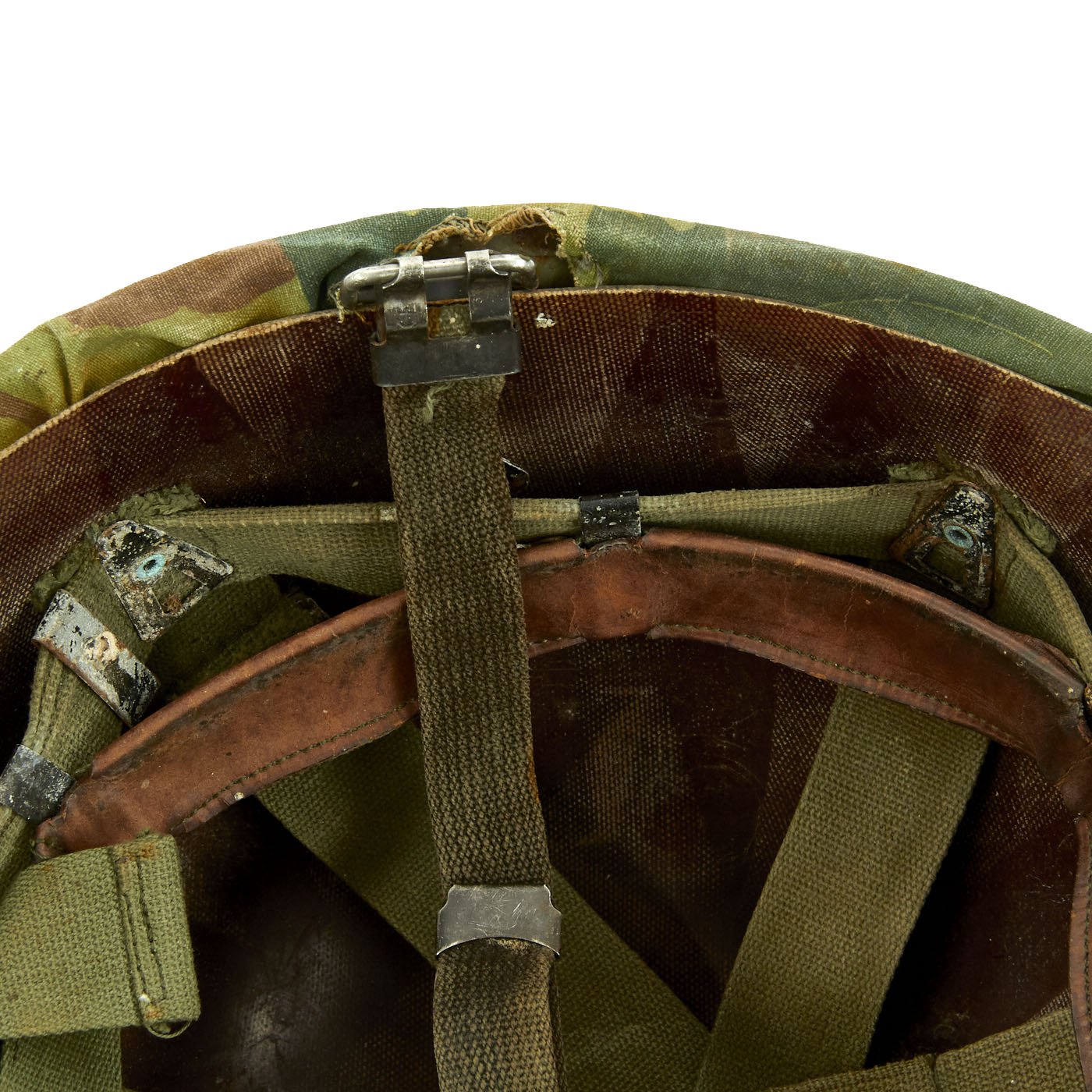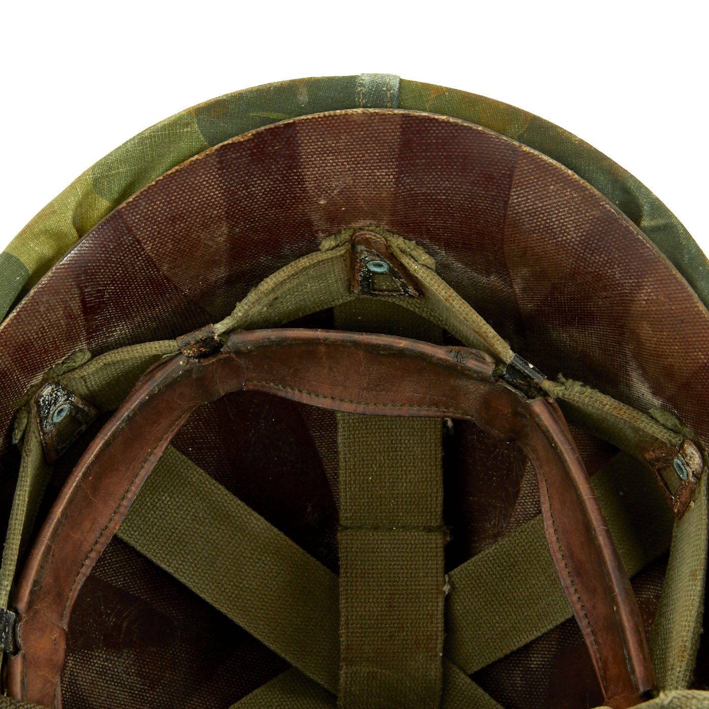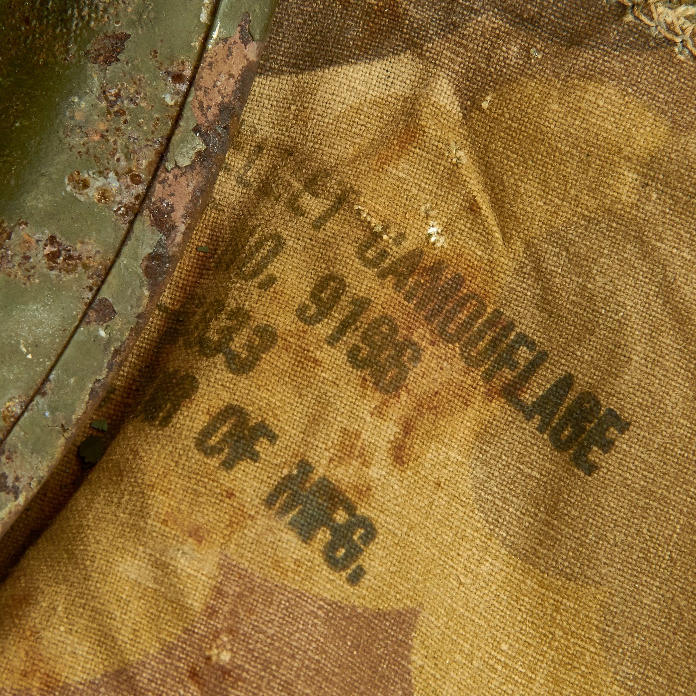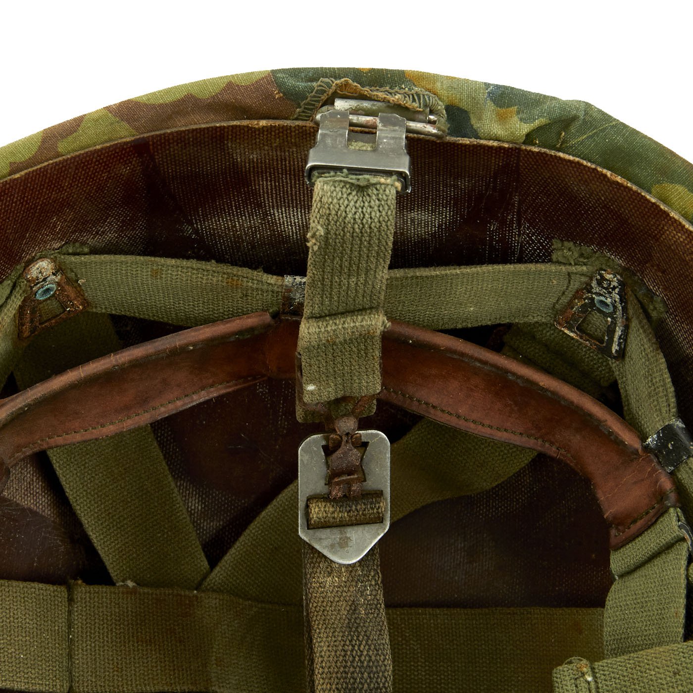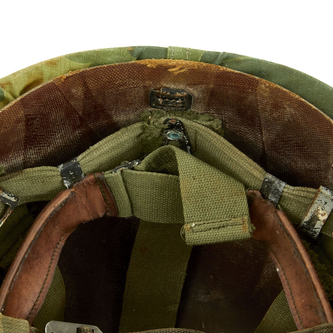 The liner is correct high pressure late 1960s issue liner, which features a simplified rigging without any lacing in the center. This allowed for a much sturdier design, adjustable via buckles at the ends of the three straps. The sweatband is good condition, and the rear is marked with the correct Vietnam Era stock numbers. The liner chin strap is unfortunately missing.