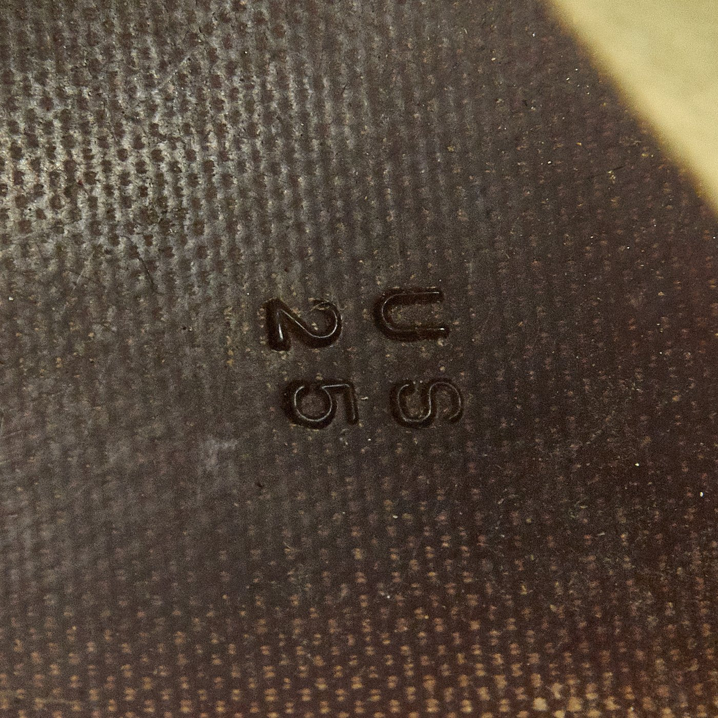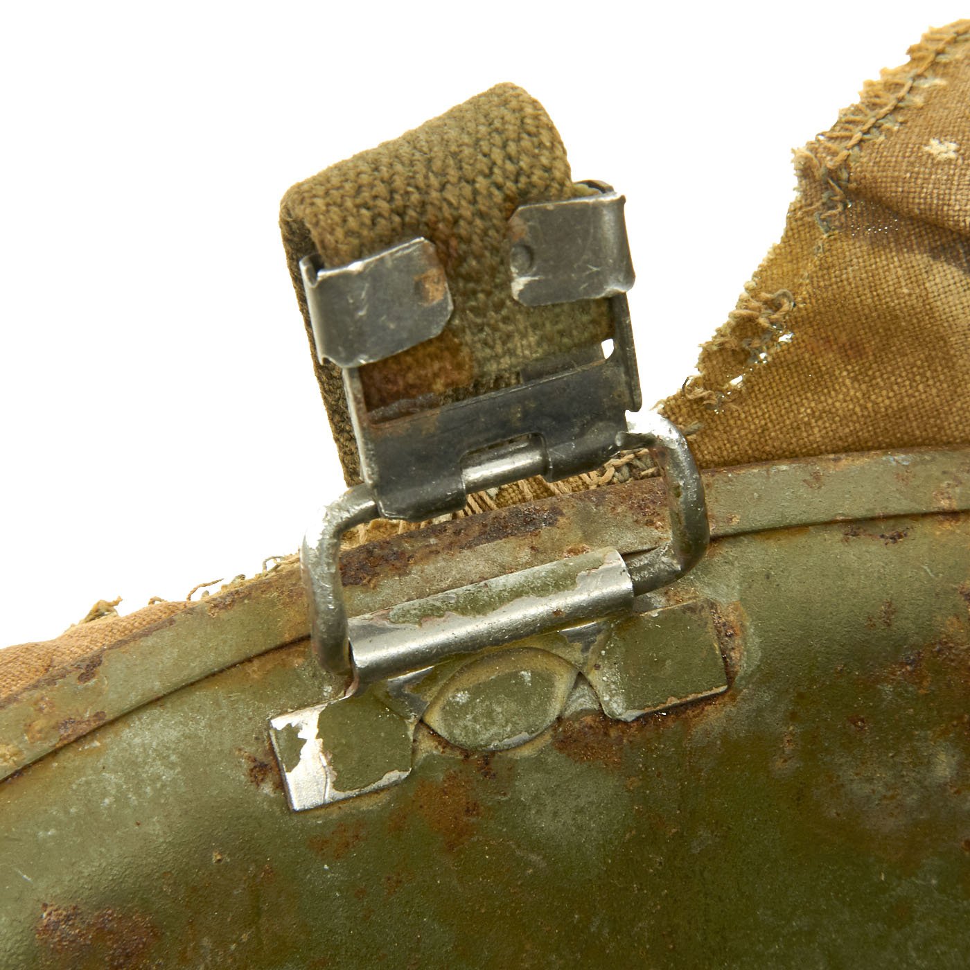 The shell chin strap is original, and the USMC cover is original and in very good condition. It has some stains and dirt, as well as wear around the edge, but is definitely solid. It is marked on the underside of one of the flaps with the contract information: