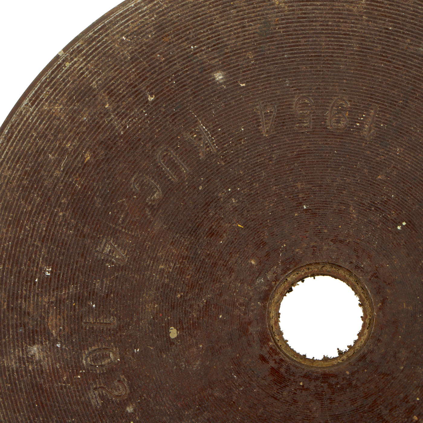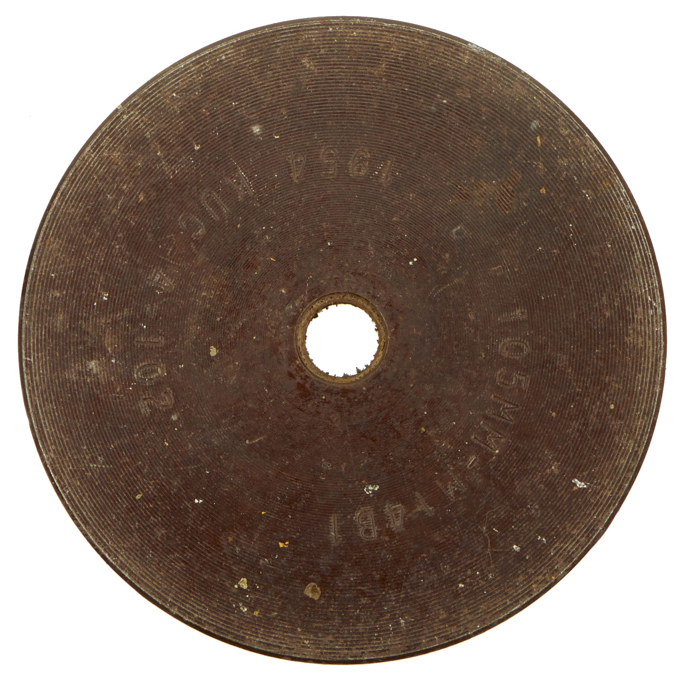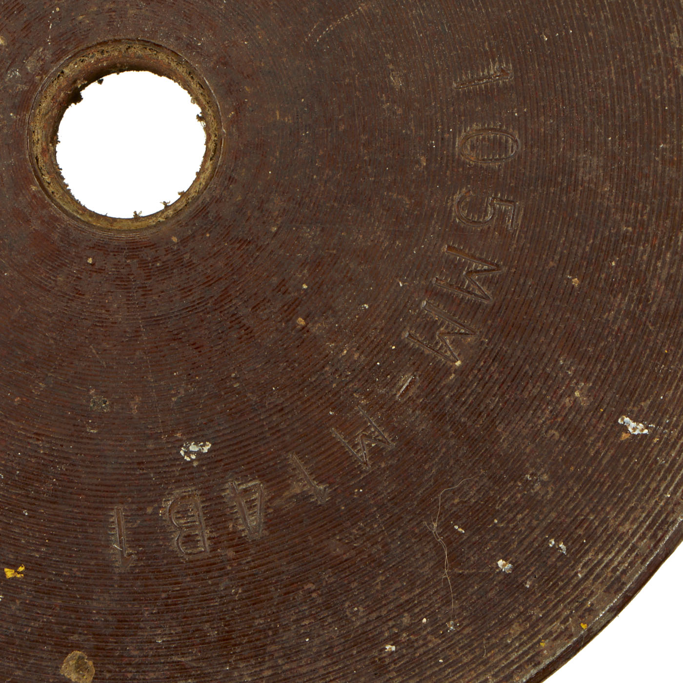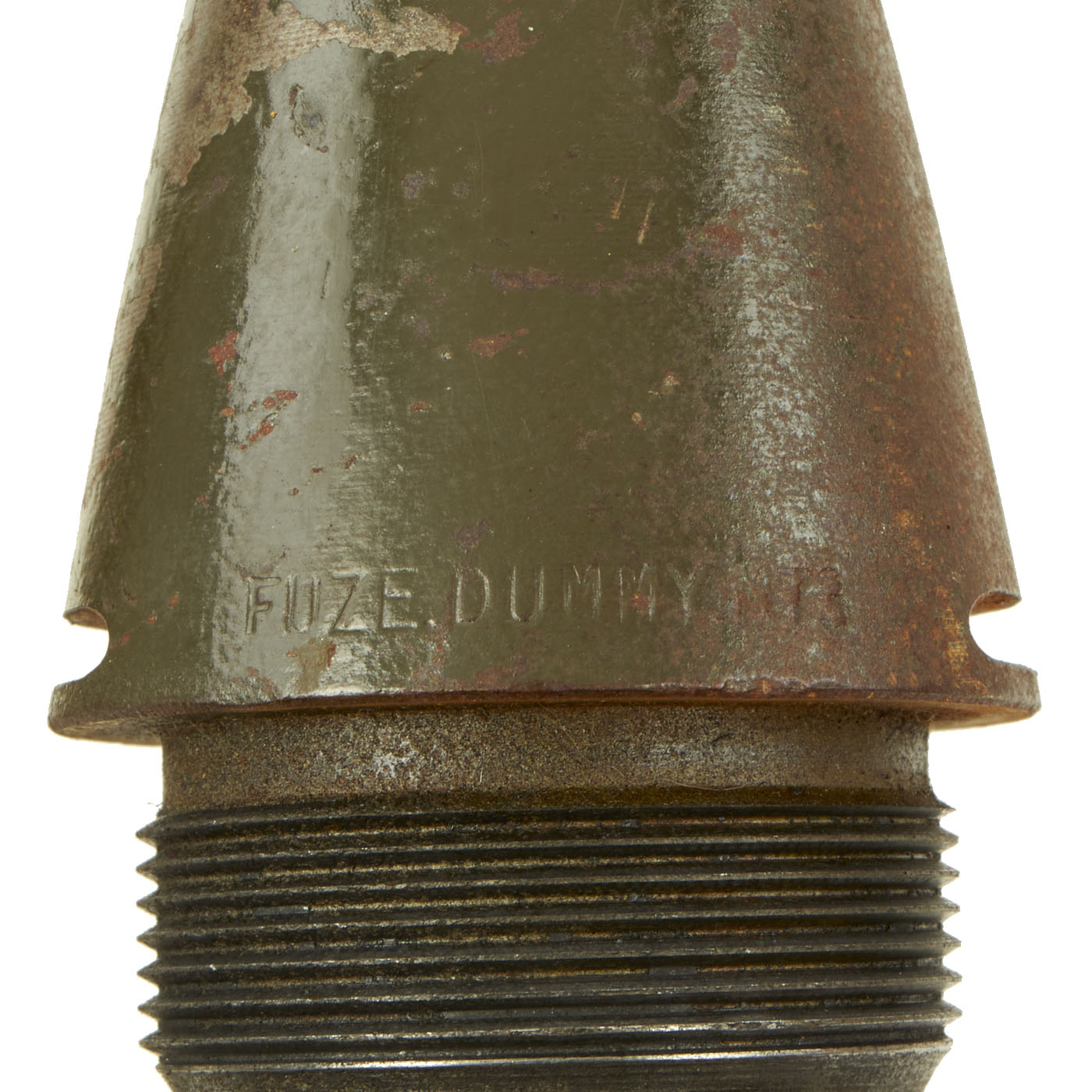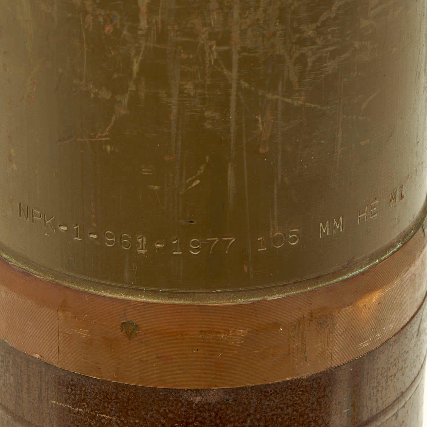 The round comes complete with a M73 Dummy Fuze which is marked as such. The shell still has it’s stampings visible as well: NPK-1-961-1977 105 MM HE M1. The round doesn’t appear to have been repainted and it has retained quite a bit with only a small amount of wear to it. The casing is dated 1954 and the following information can be found on the bottom: 105MM-M14B1 / 1954 KUC-14-102. The casing has not been painted and still retains a lovely bronze colored patina.
