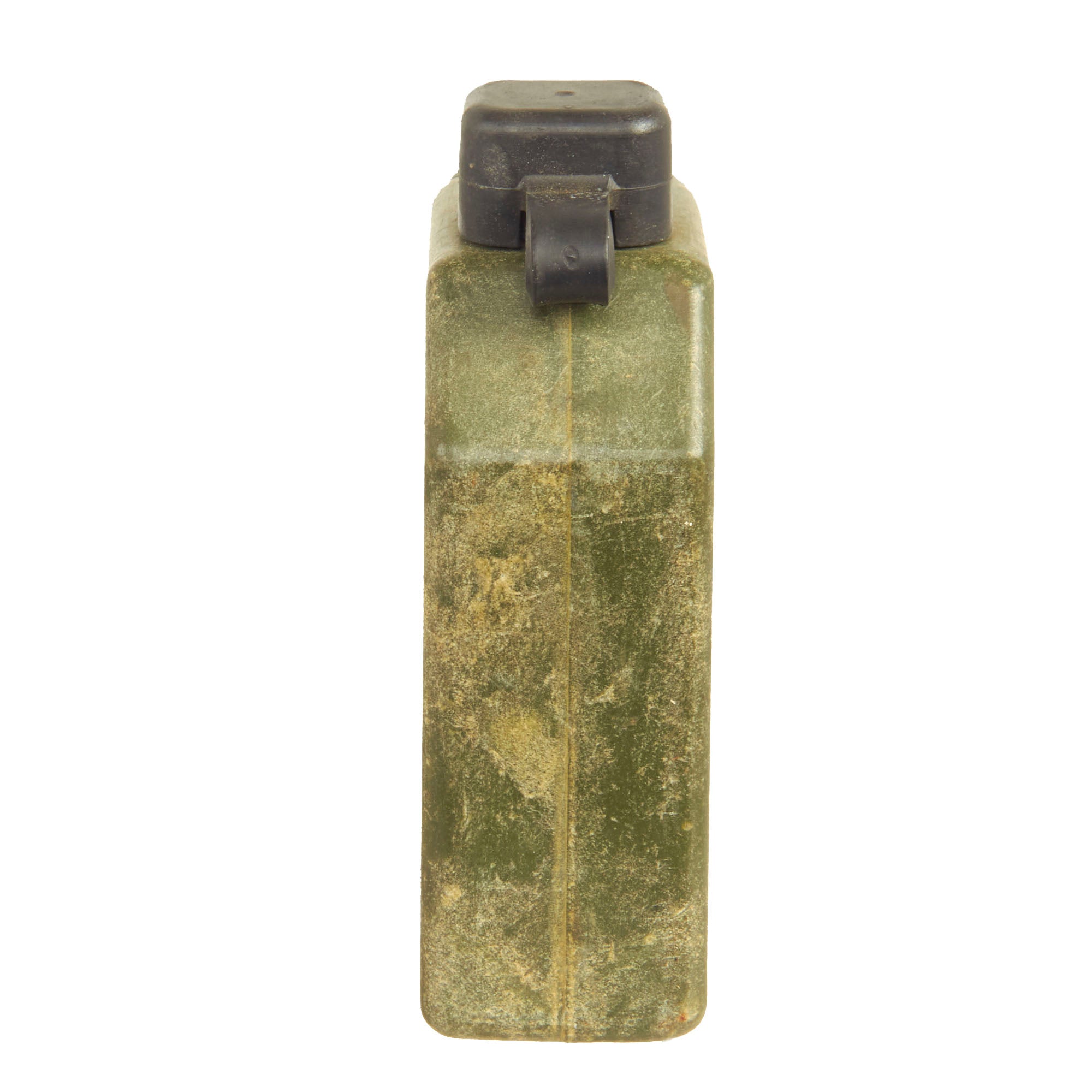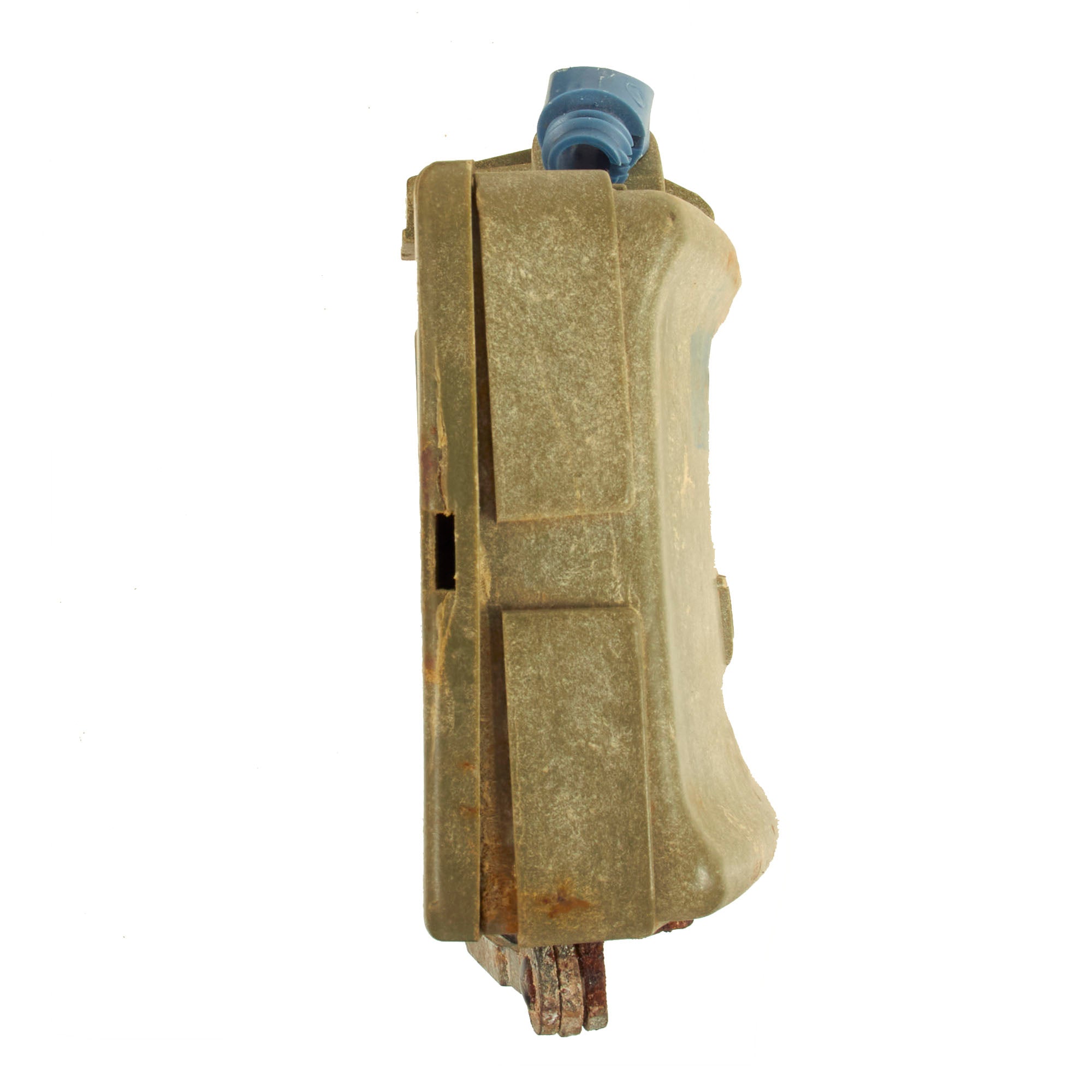 This example is very nice, and has the look of a well-used piece of equipment. The mine itself was once a live, active Claymore which was rendered INERT for training purposes. It still retains the original fold out support legs as well as the wire connectors. The backside of the mine was made to be removed, revealing the interior (along with the deadly shrapnel balls!) There are some cracks and chipping on the body of the inert mine most likely from being dropped.