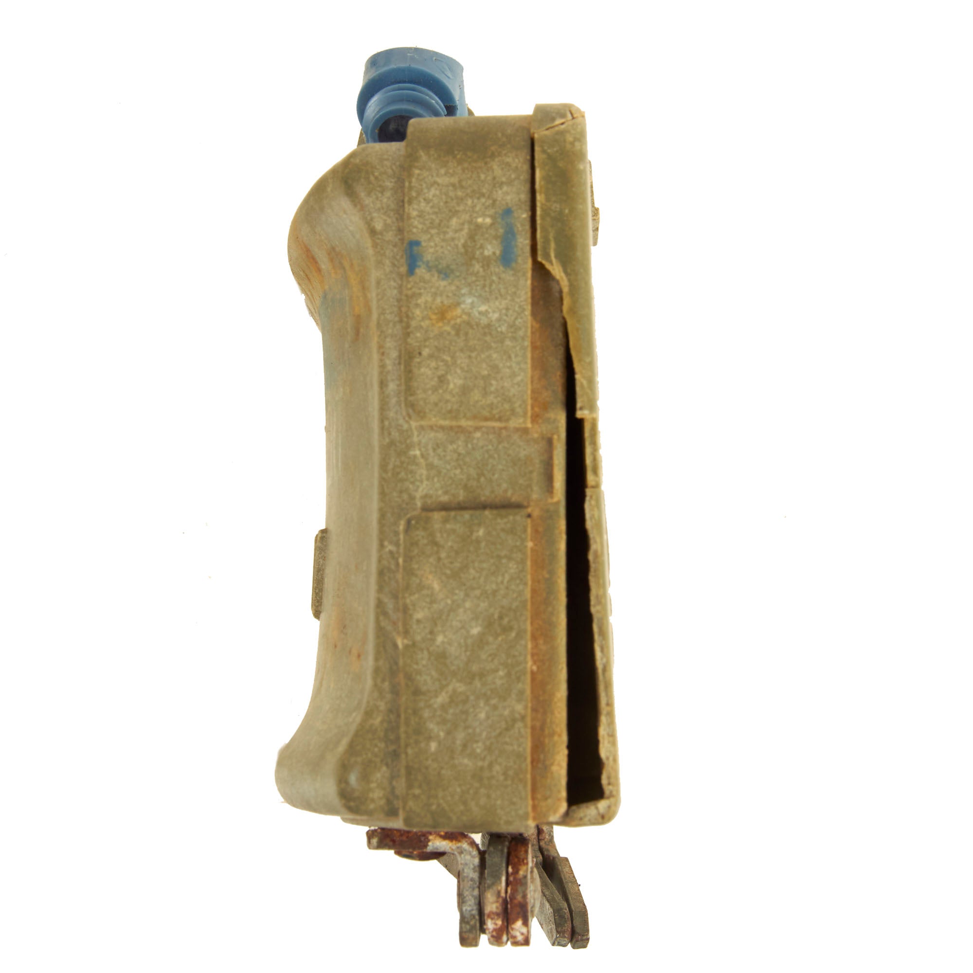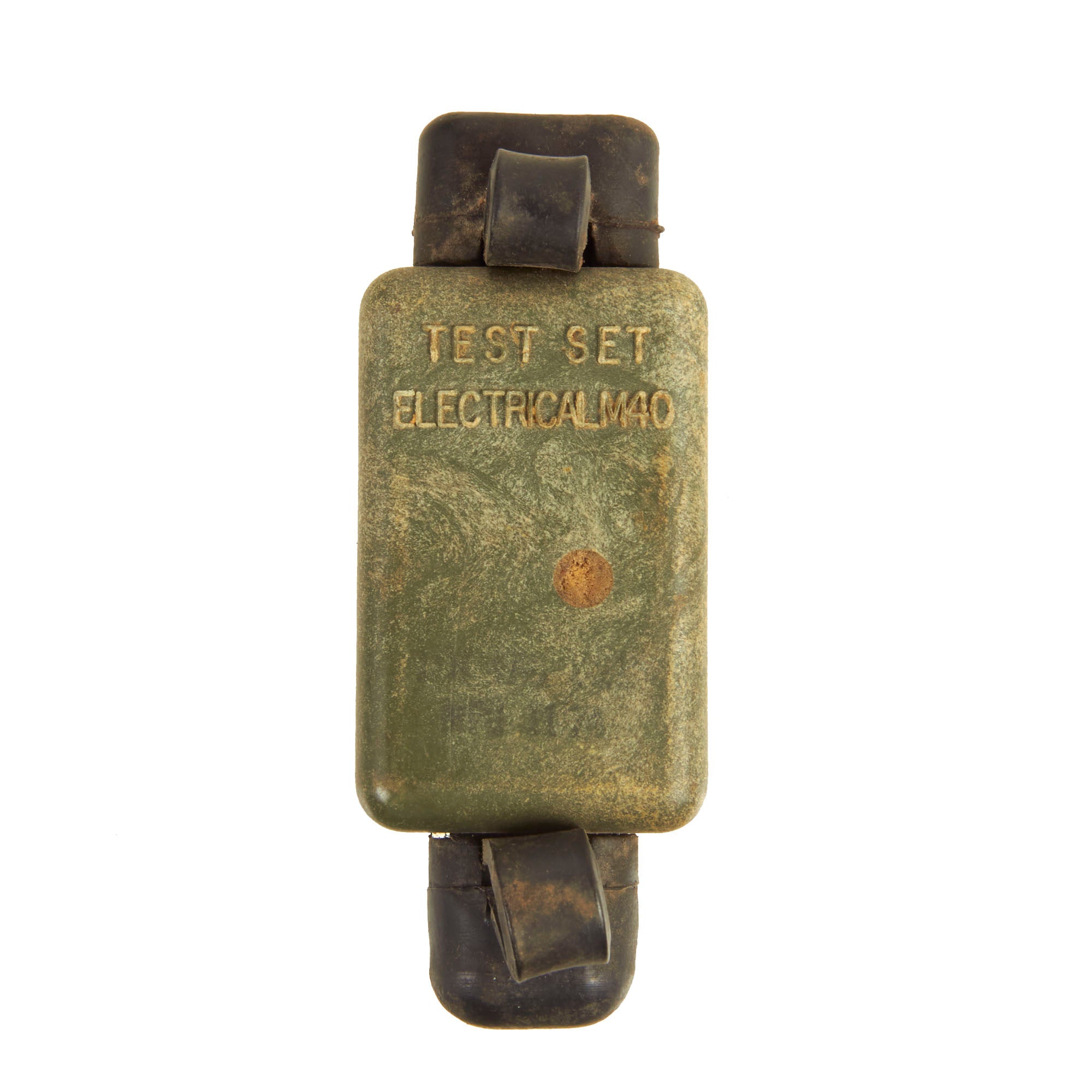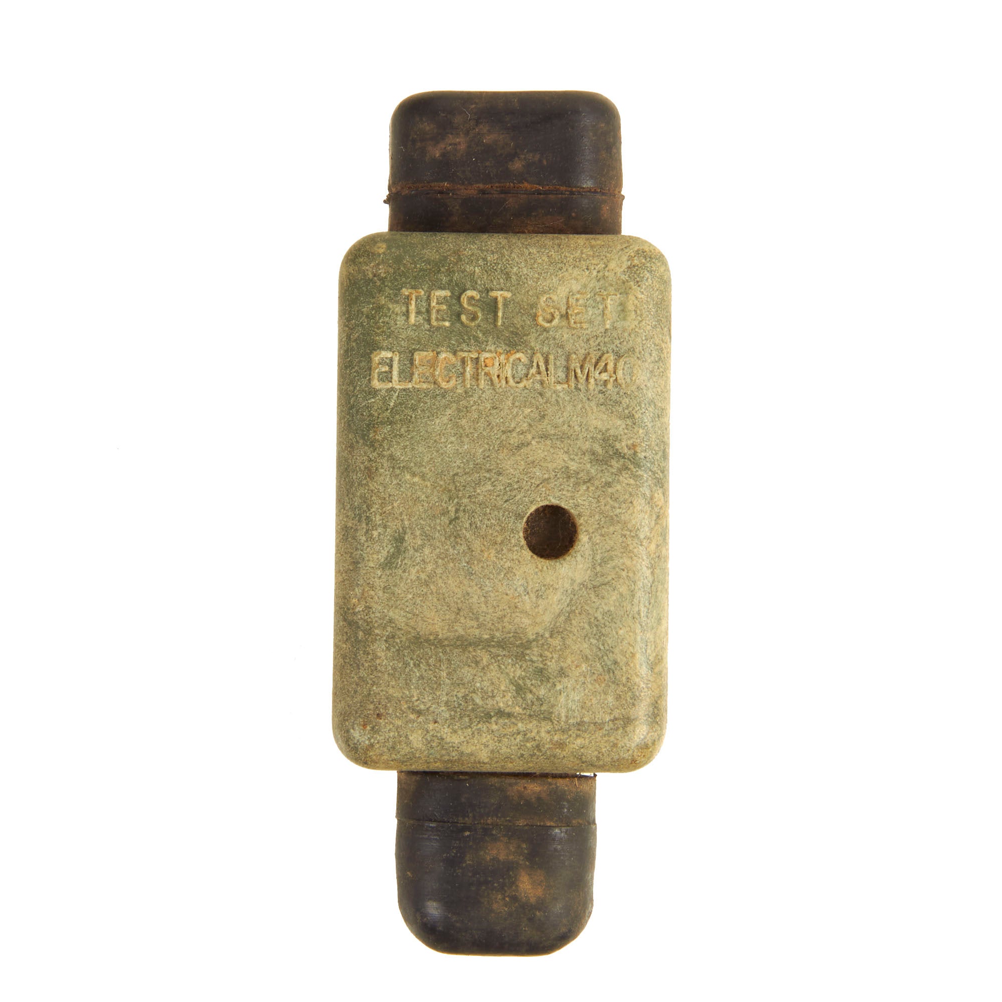 The M57 clacker appears to function as expected, the blasting cap and wire is complete, though the connectors are corroded, and we were not able to get the test kit to light up. The bag is in very good condition but unfortunately the closure snaps are no longer functional.