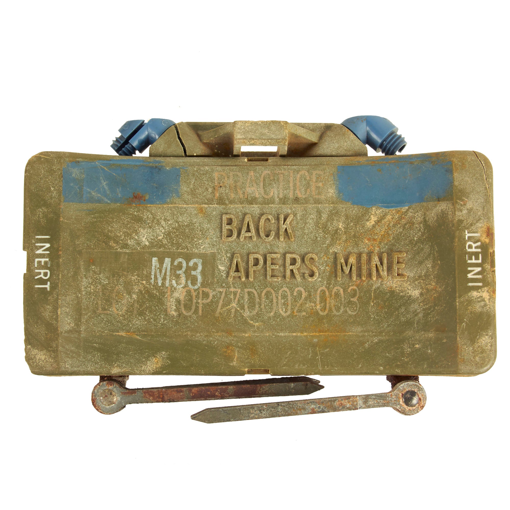The M-18 AP Mine was converted to a M-33 Training version by EOD Personnel, making it an inert training aid. Some inert mines were green with a light blue band, while others were completely blueIt does not contain an explosive or pyrotechnic filler of any kind. It is packed in a Claymore bag with wire spool/ wire with connectors, an M57 "clacker" firing control, and an M40 circuit test kit.