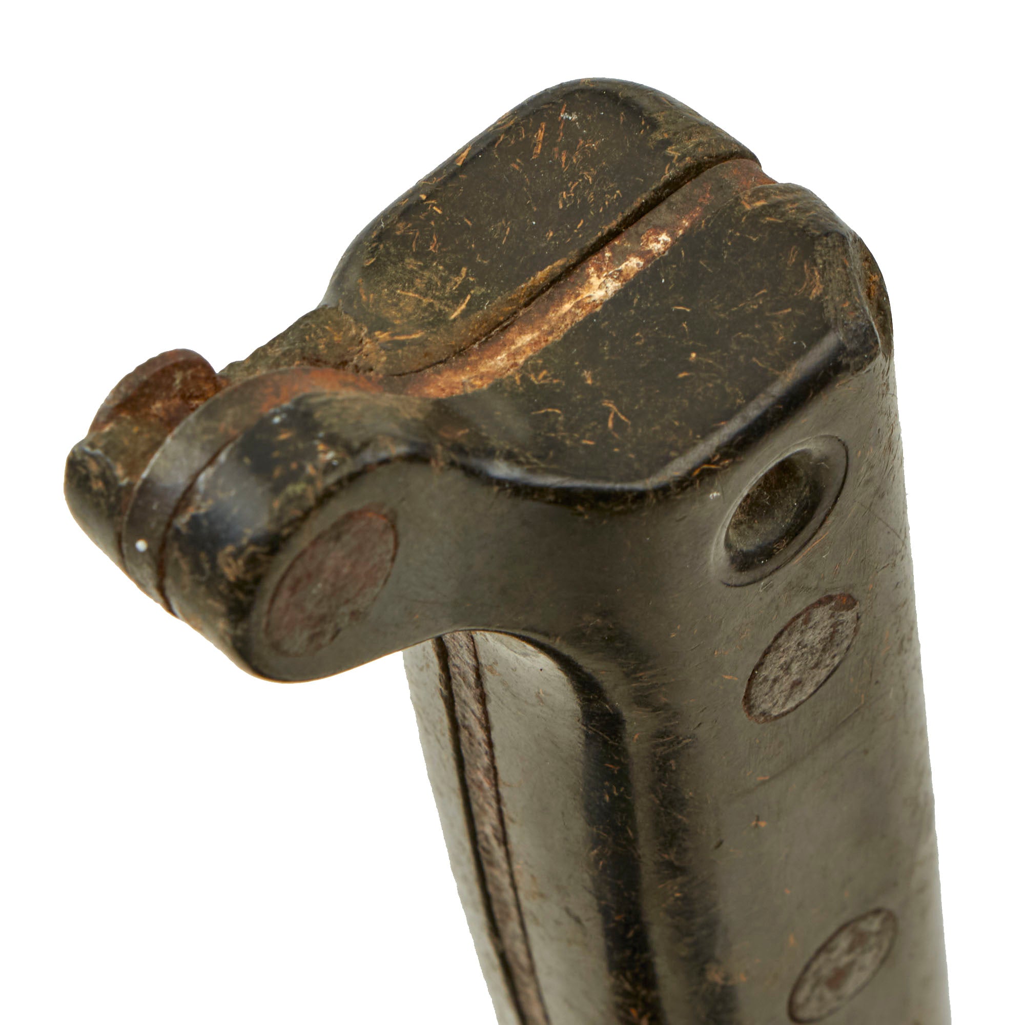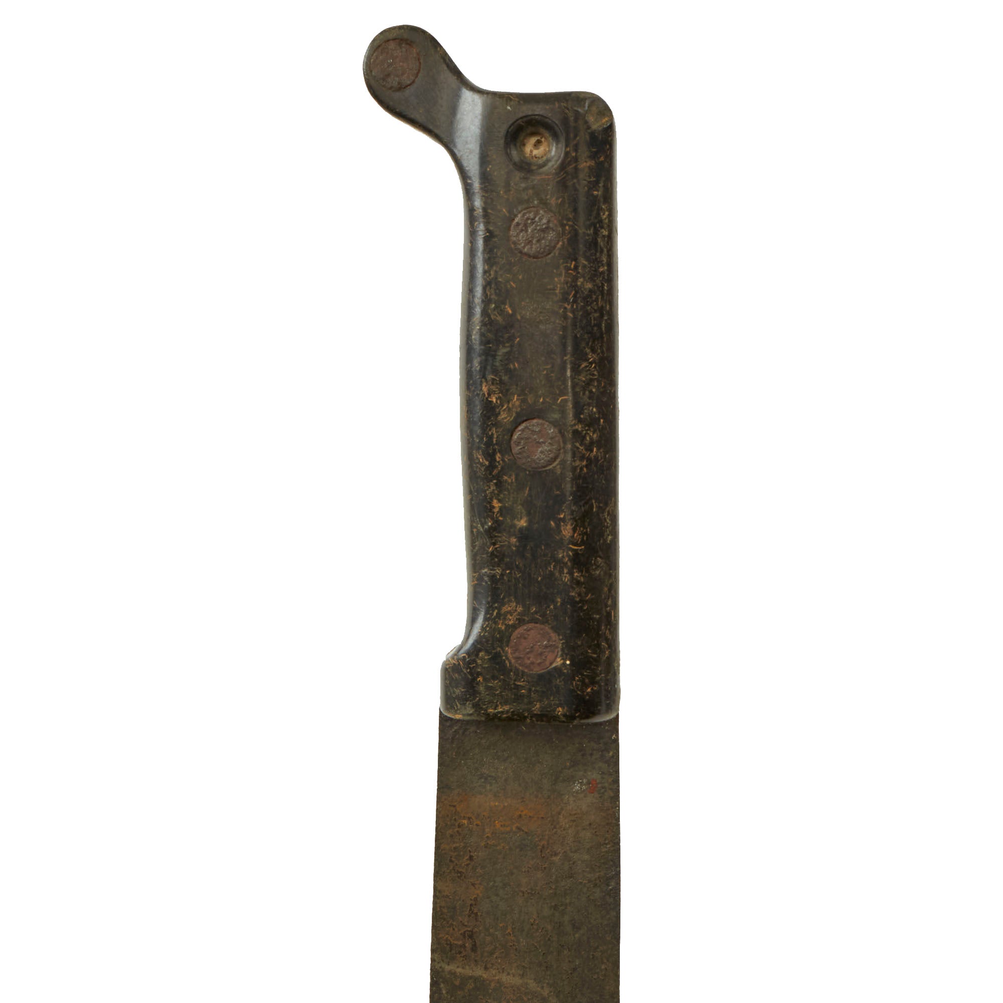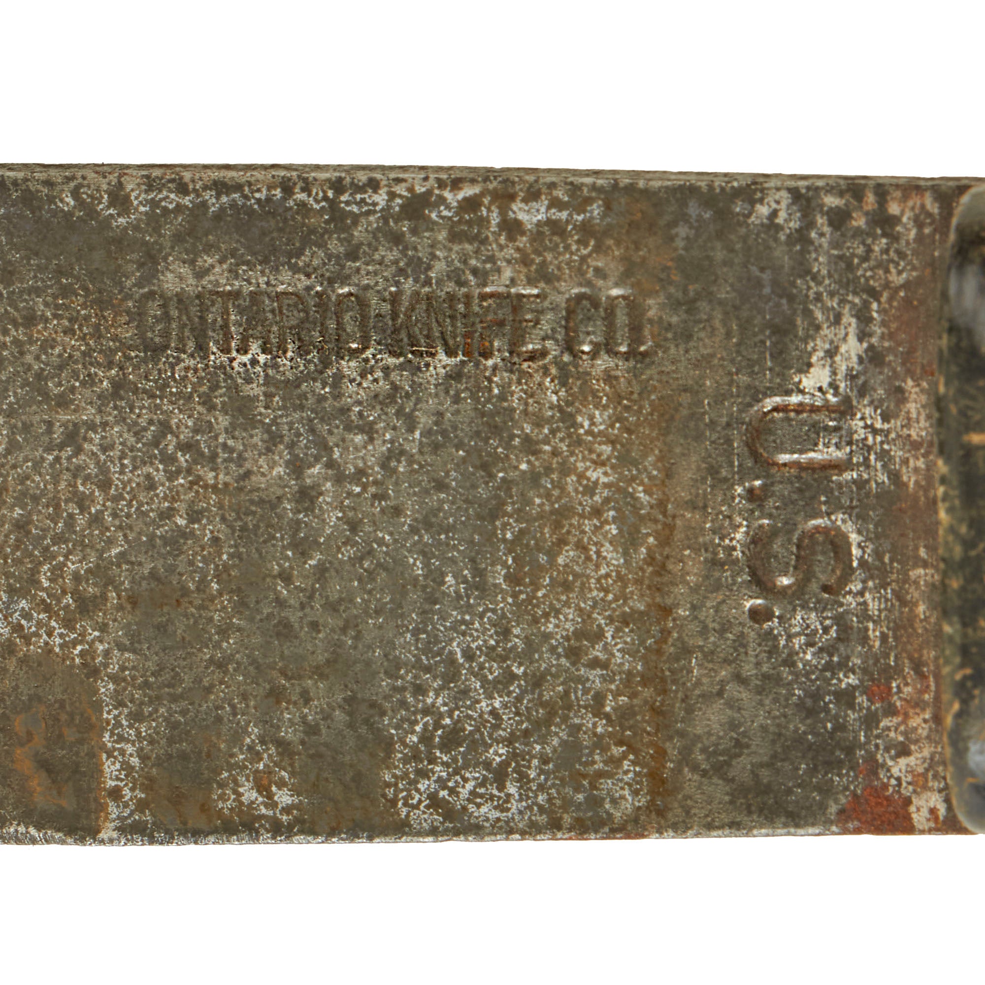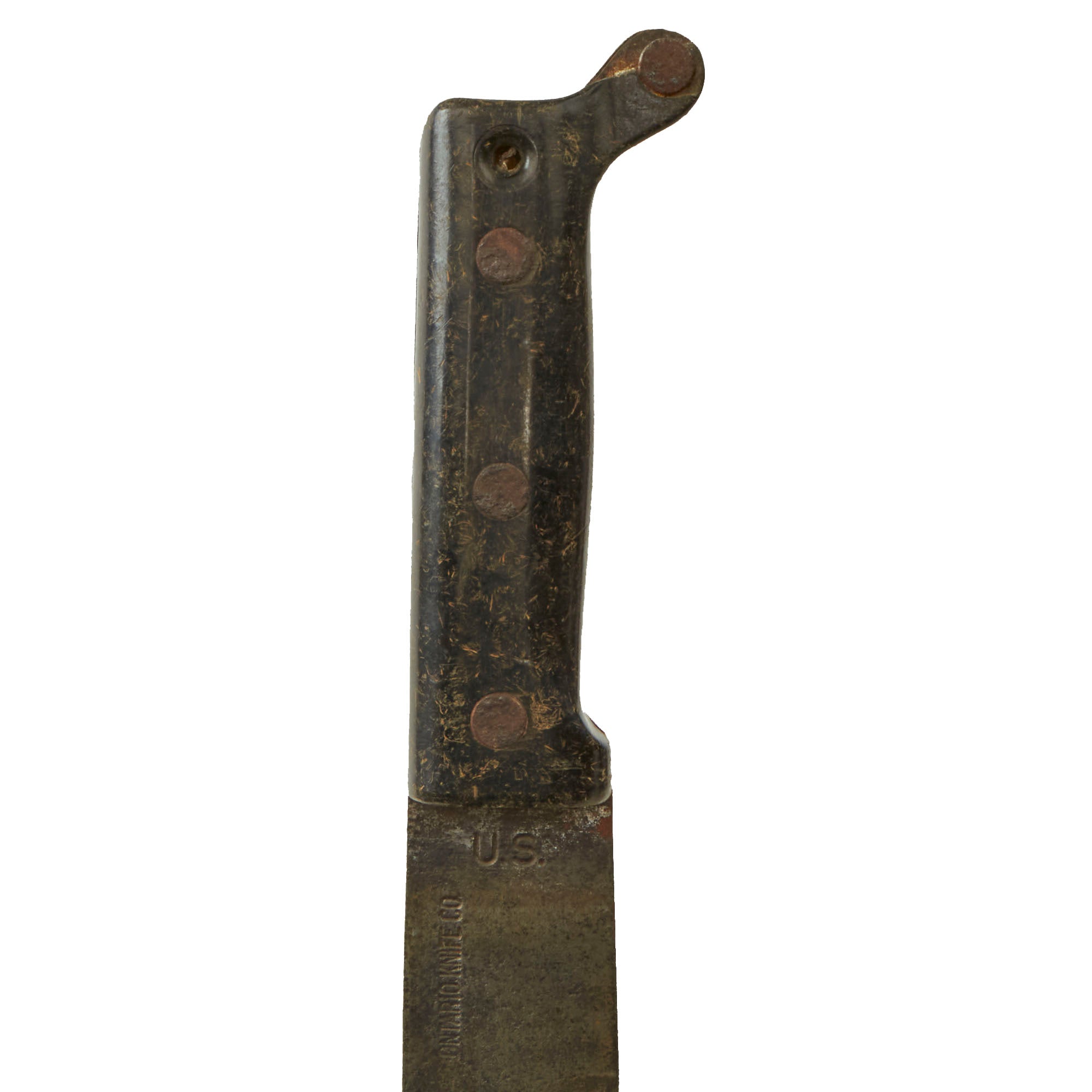 Original Item. Only One Available. This is a lovely M1942 machete manufactured by the Ontario Knife Company. The machete has a rough pitted blade which is marked U.S. / ONTARIO KNIFE CO.. The hard plastic grips are in good service-worn condition with some material loss.
