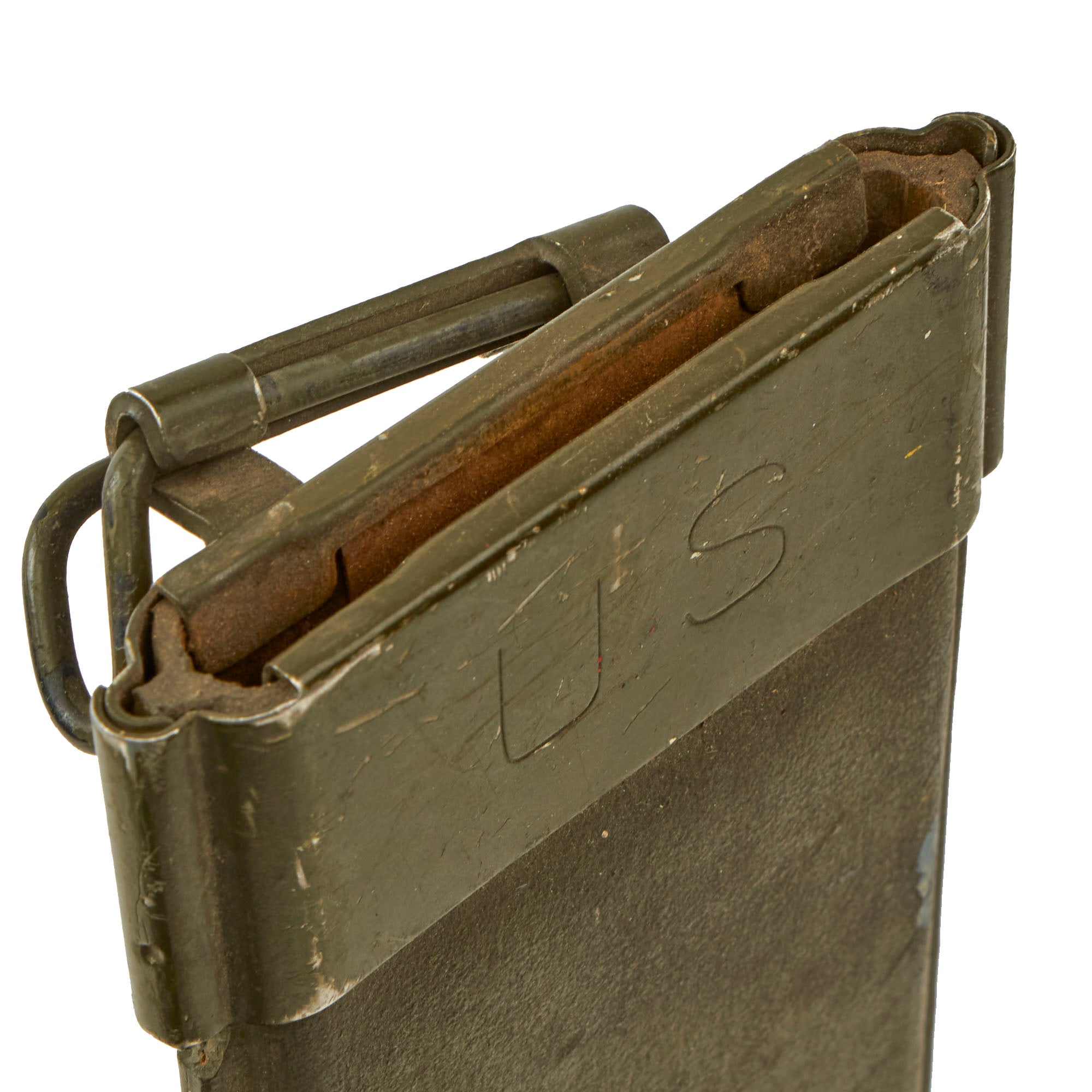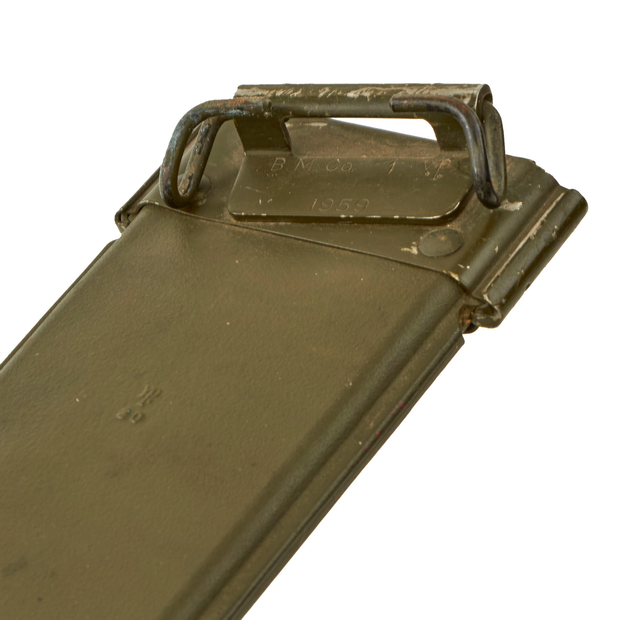 The original scabbard is marked U.S. on the throat, and on the reverse with B.M. CO. / 1959. The machete is in fair overall condition.