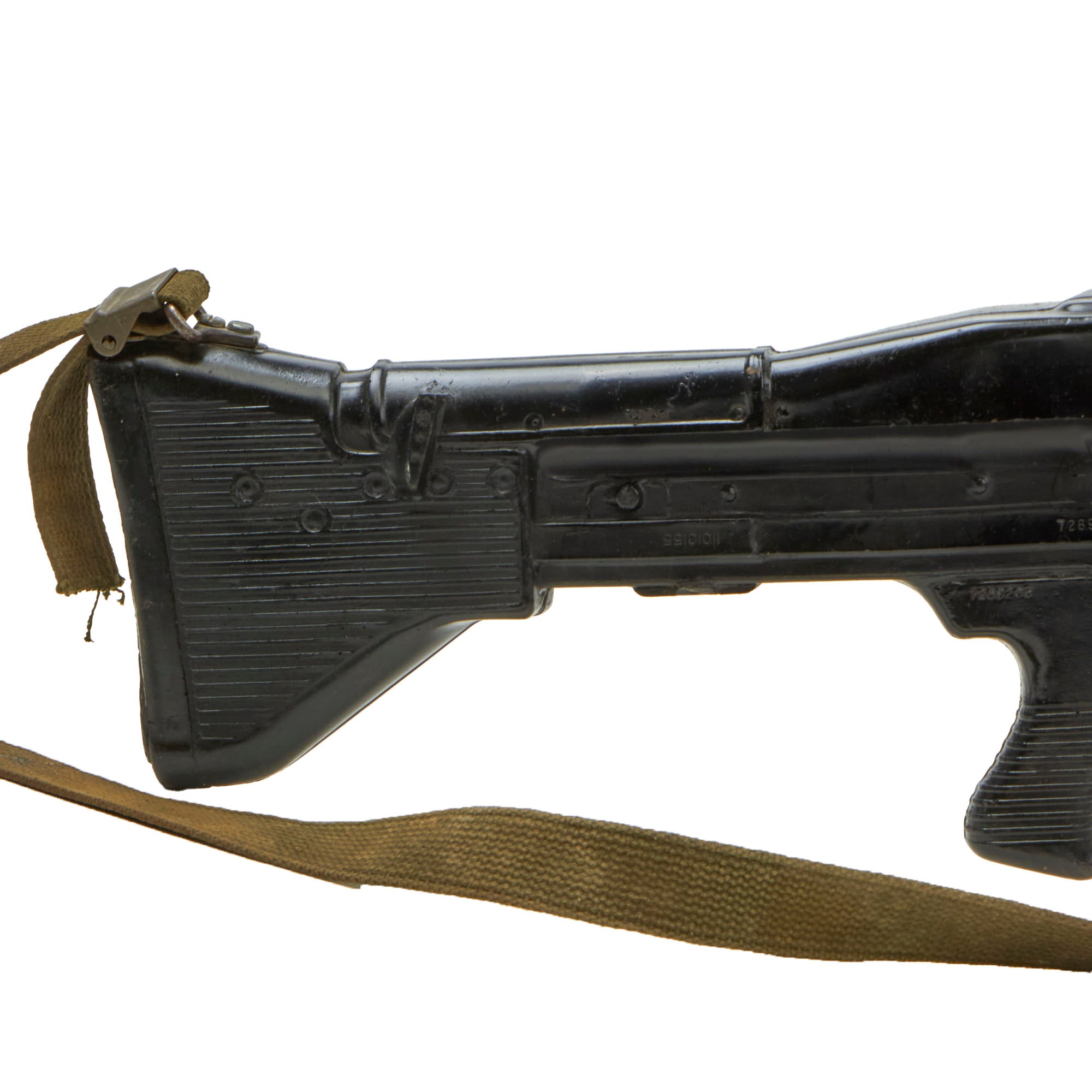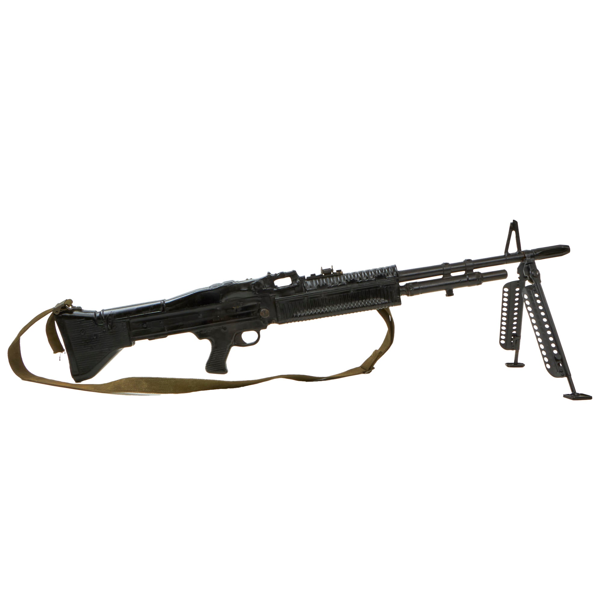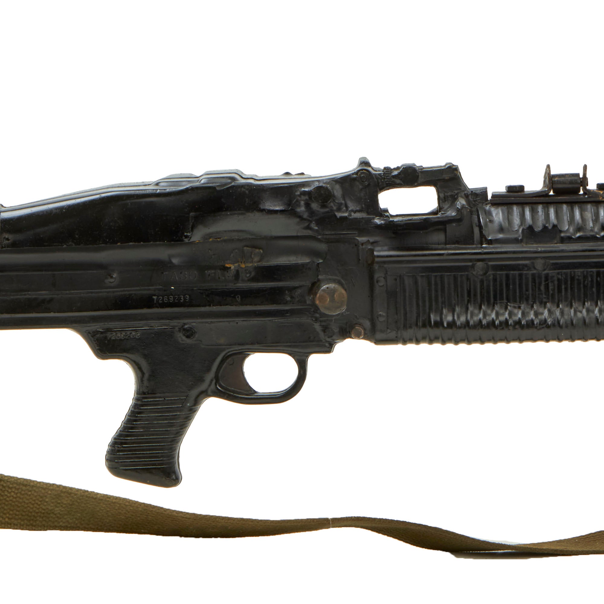 This is an official non-firing U.S. Army Training Aid produced by the Training Aid Support Organization (TASO) at Fort Leonard Wood, located in the Missouri Ozark Mountains.It is comprised mostly of heavy gauge molded rubber, with the bipod, flash hider, and a portion of the barrel and gas tube being original parts. It has had some of the more delicate portions break off during training, however the front sight is still mostly present, and it has an original sling attached as well.