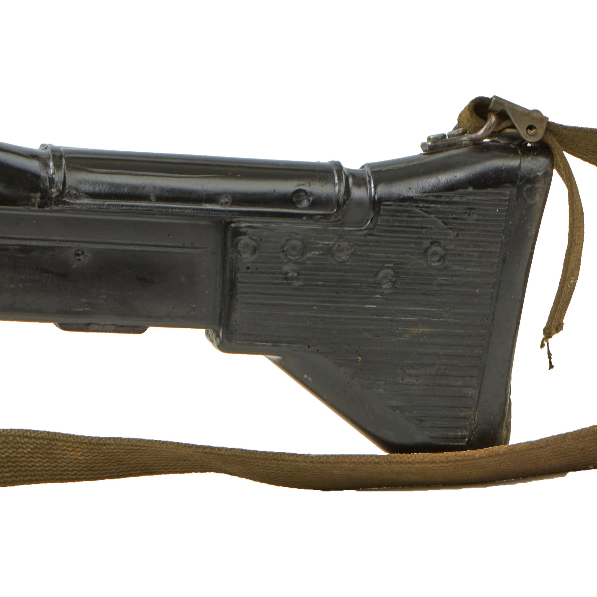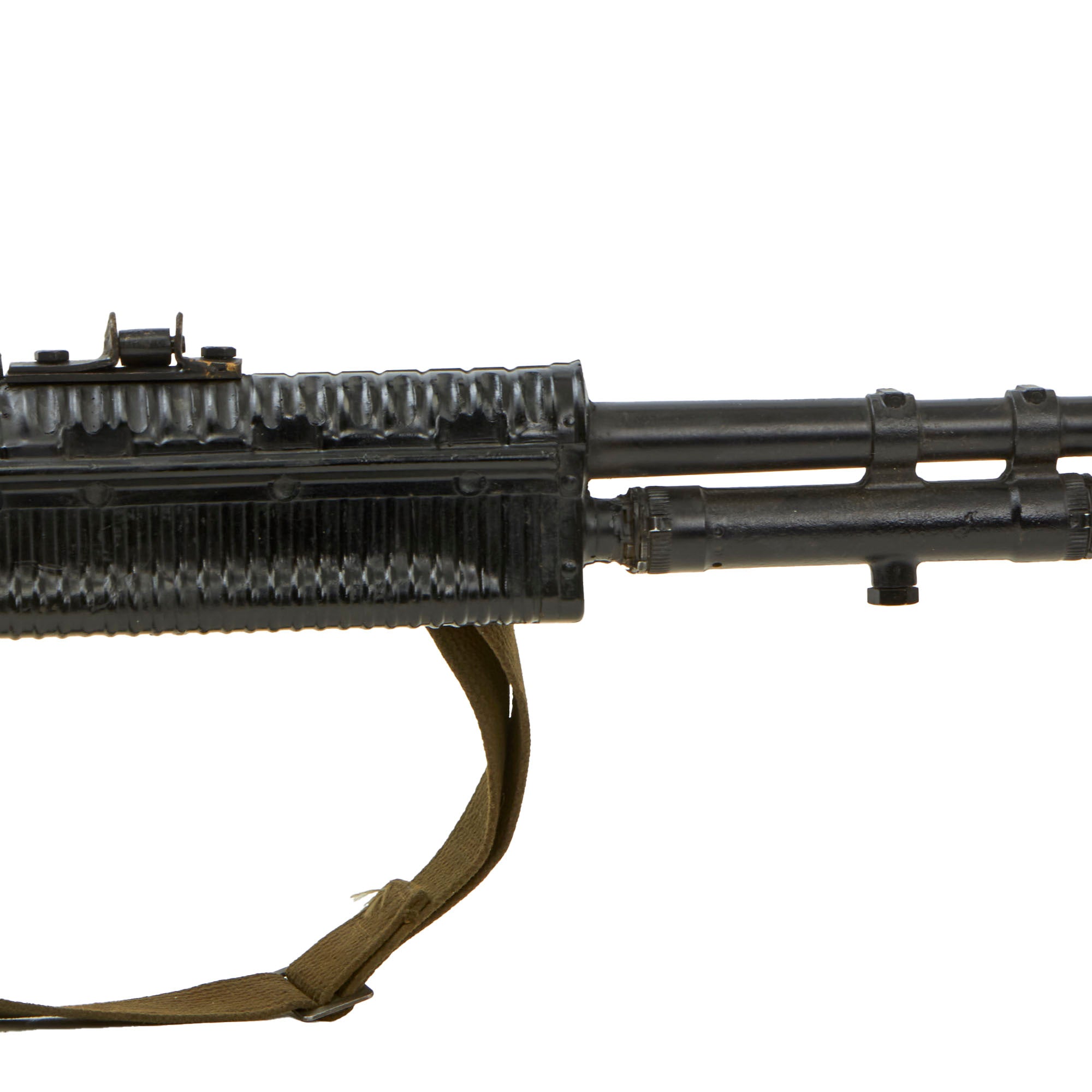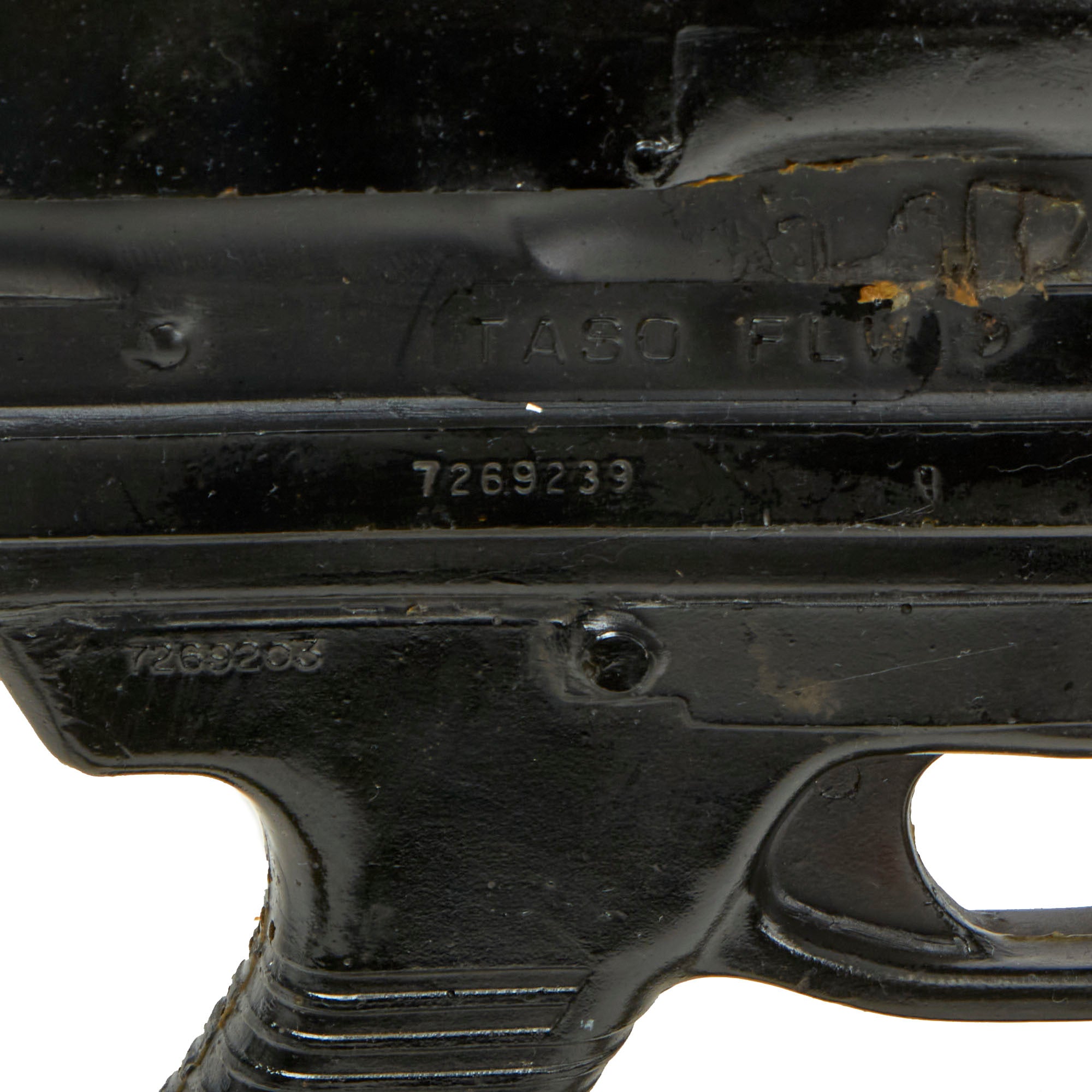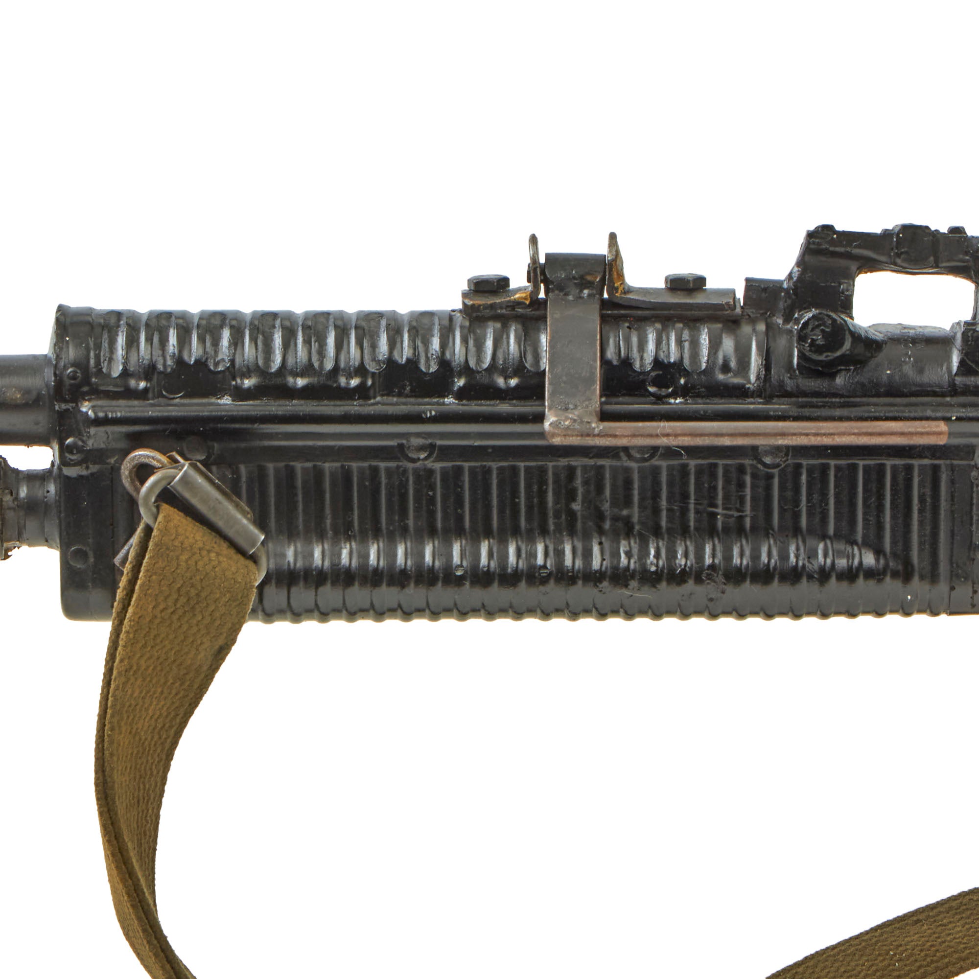 This is an official non-firing U.S. Army Training Aid produced by the Training Aid Support Organization (TASO) at Fort Leonard Wood, located in the Missouri Ozark Mountains.It is comprised mostly of heavy gauge molded rubber, with the bipod, flash hider, and a portion of the barrel and gas tube being original parts. It has had some of the more delicate portions break off during training, however the front sight is still mostly present, and it has an original sling attached as well.