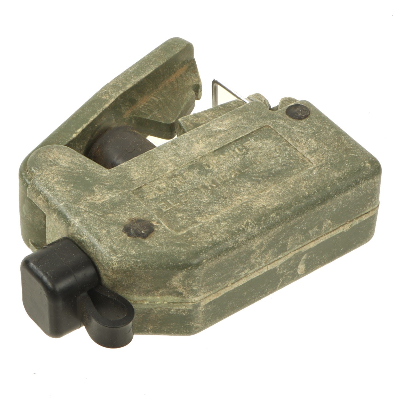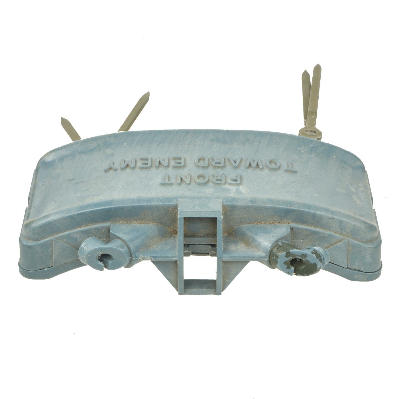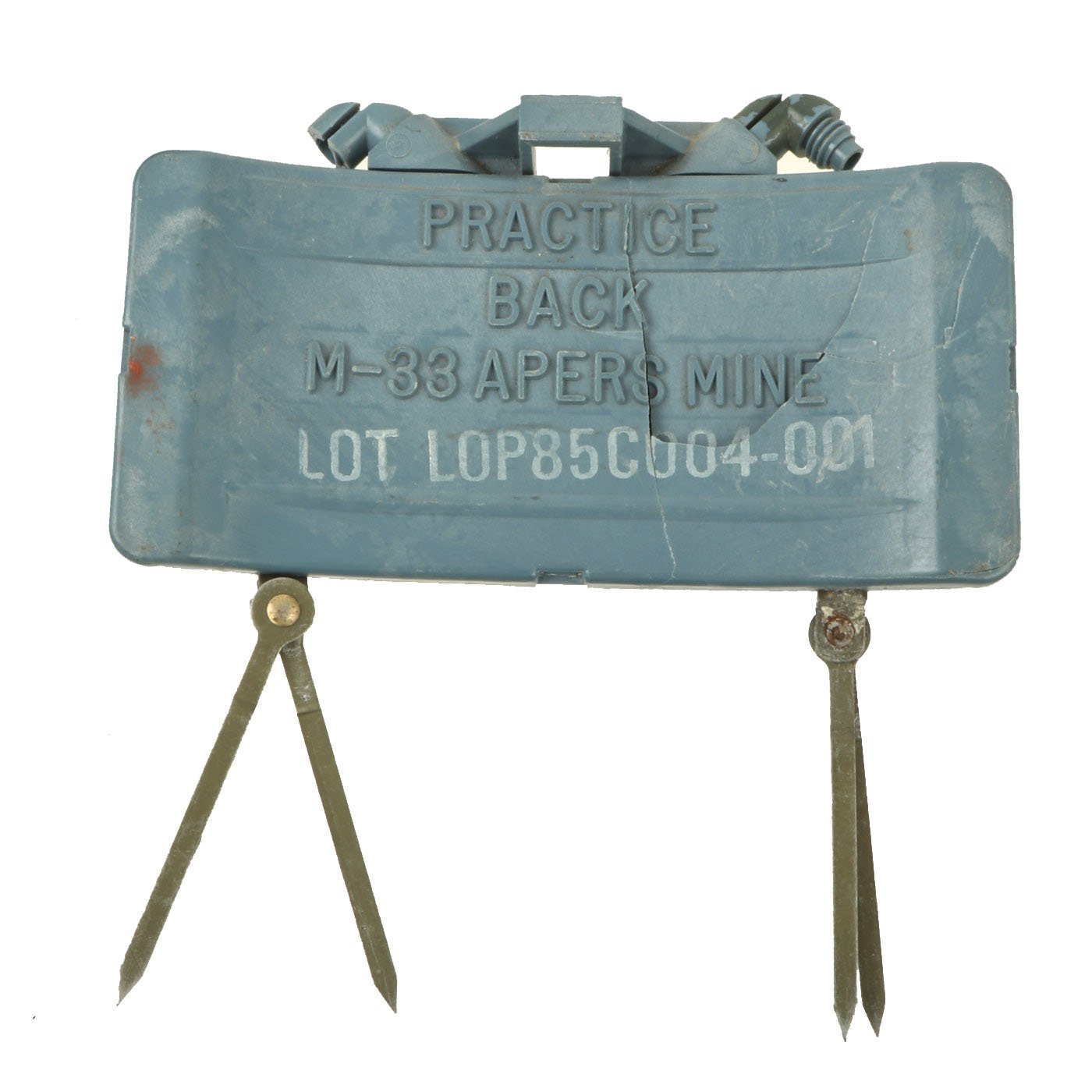 This example is very nice, and has the look of a well-used piece of training equipment. The mine itself is cast blue plastic and reverse of the mine reads PRACTICE BACK M-33 APERS MINE. It still retains the original fold out support legs as well as the wire connectors. There are some cracks in the rear of the inert mine most likely from being dropped. This does however allow some of the interior to be seen.