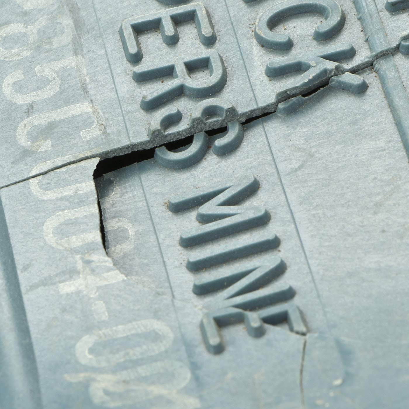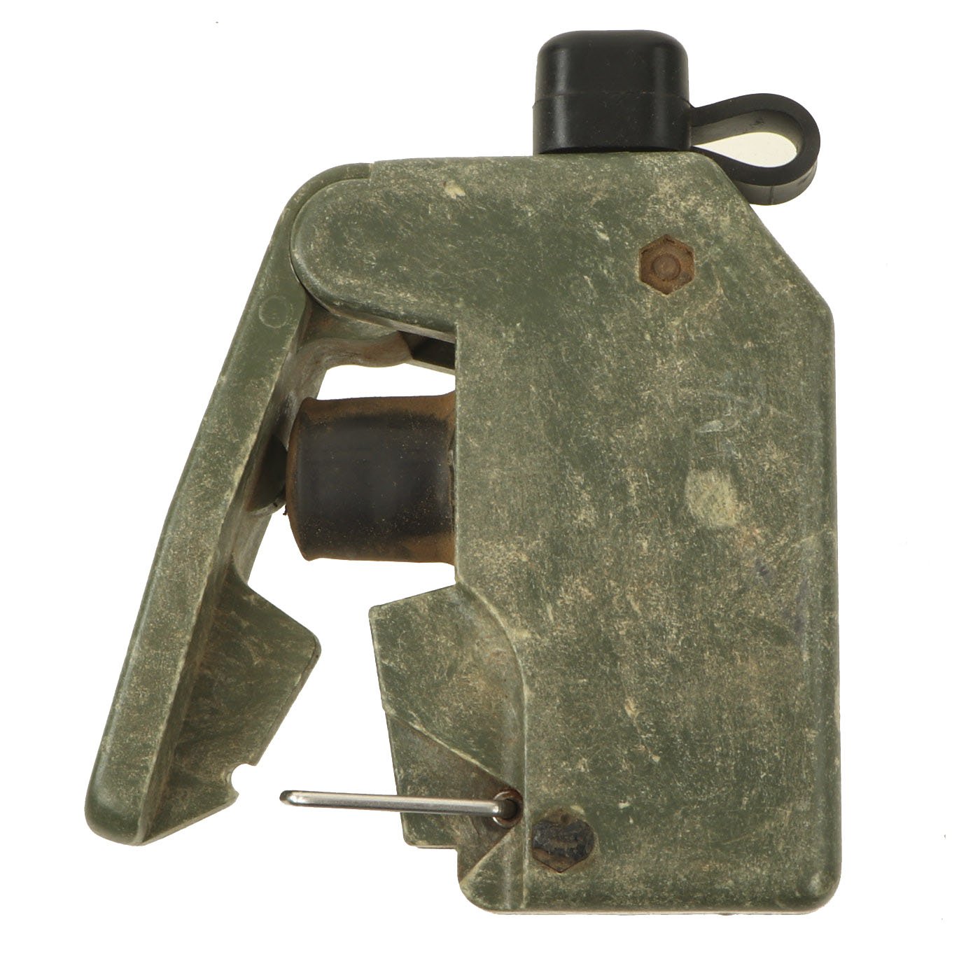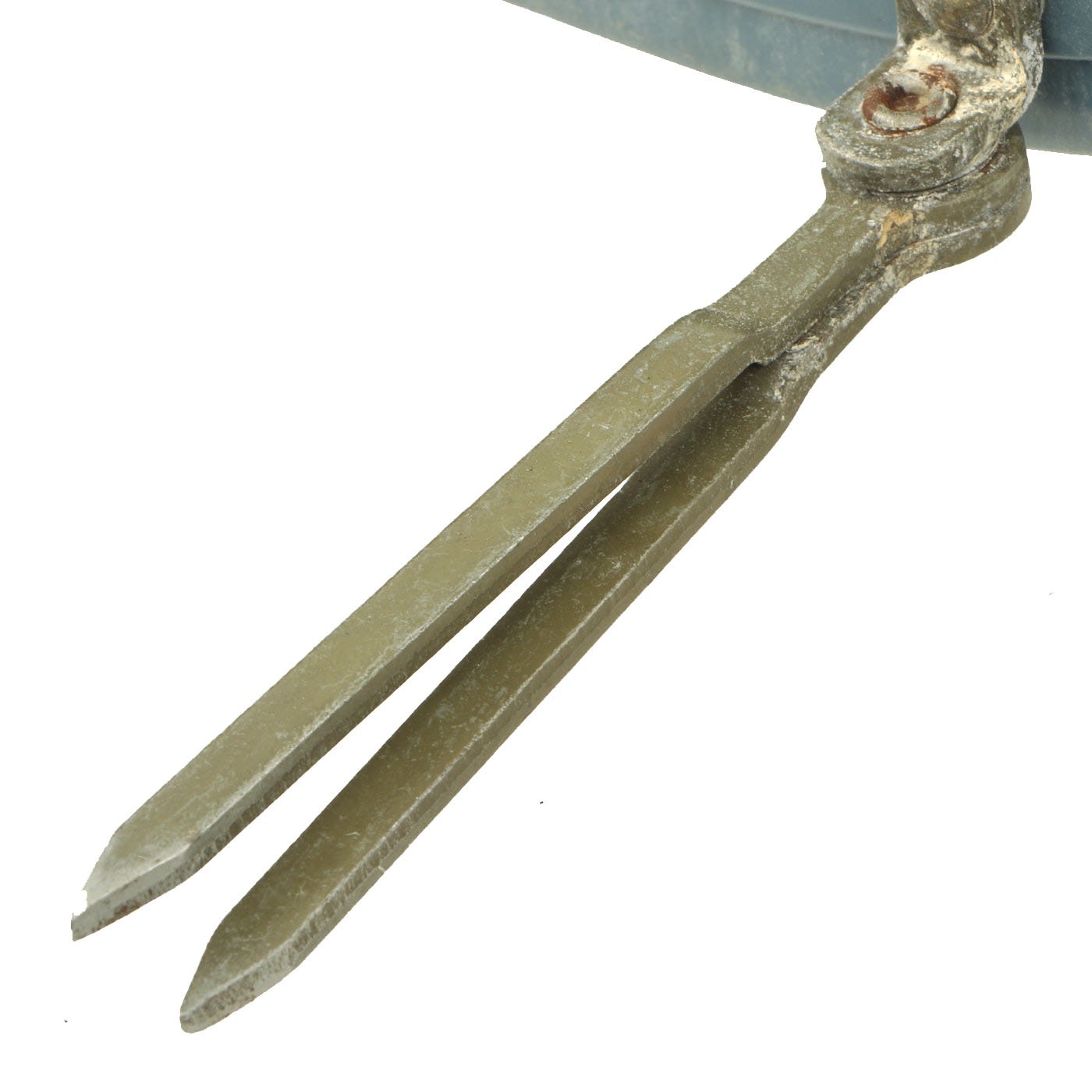 This example is very nice, and has the look of a well-used piece of training equipment. The mine itself is cast blue plastic and reverse of the mine reads PRACTICE BACK M-33 APERS MINE. It still retains the original fold out support legs as well as the wire connectors. There are some cracks in the rear of the inert mine most likely from being dropped. This does however allow some of the interior to be seen.