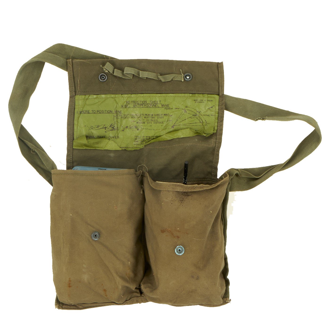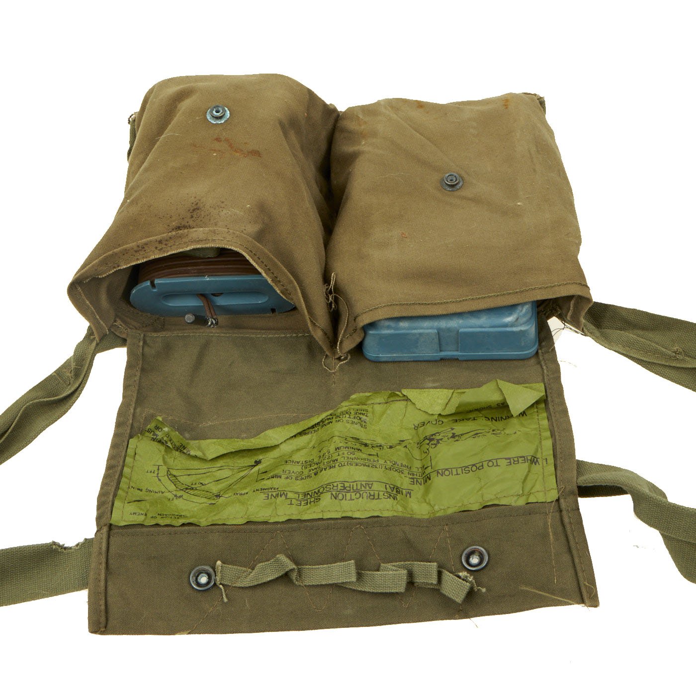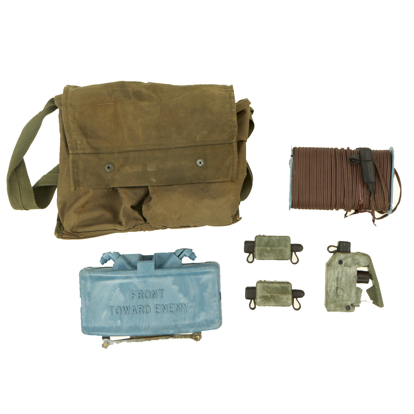 Original Items: One Set Only. The M68 kit was designed to familiarize personnel with the placement and arming of a real M18 Claymore directional mine. It comes with all the components of a real Claymore kit packed in an M7 bandoleer. The plastic M33 Inert AP Mine is the inert training and practice version of the M18 Claymore. Some inert mines were green with a light blue band, while others were completely blue, such as this example. It does not contain an explosive or pyrotechnic filler of any kind. It is packed in a Claymore bag with inert M10 simulated detonator cap wire with connectors, an M57 "clacker" firing control, and two M40 circuit test kits.