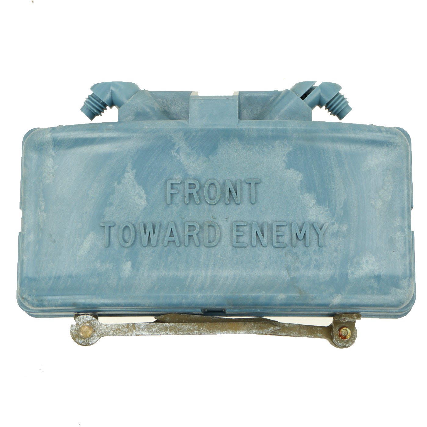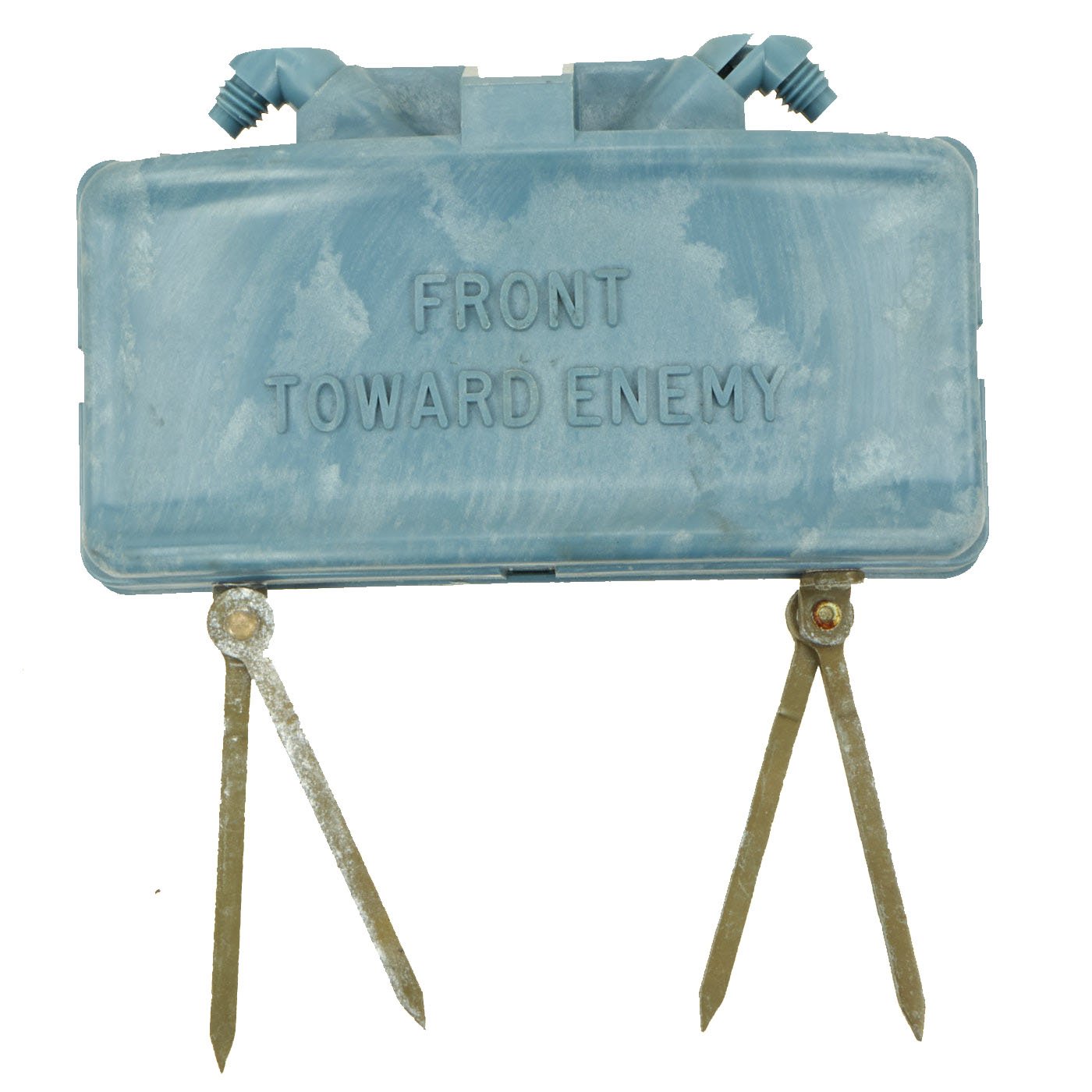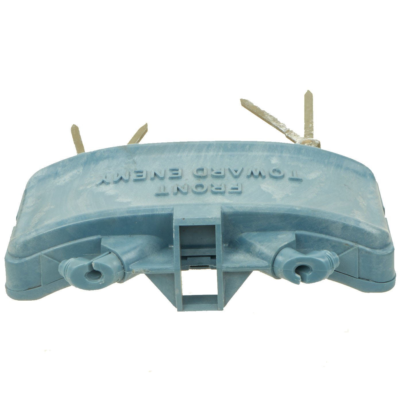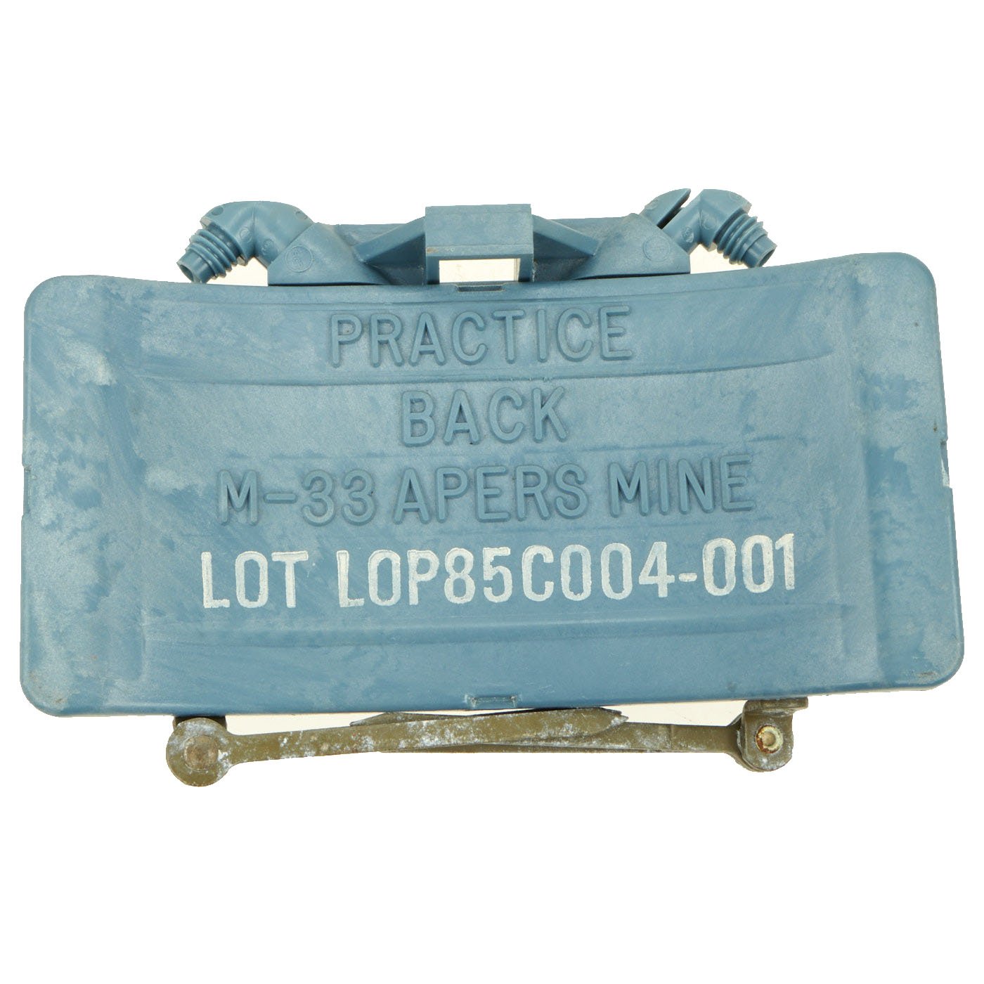This example is in excellent condition, and shows little sign of use, just some oxidation on the metal components from decades of storage. The mine itself is cast blue plastic and reverse of the mine reads PRACTICE BACK M-33 APERS MINE. It still retains the original fold out support legs as well as the wire connectors. There are no cracks or other damage to the plastic, just some light scuffing.