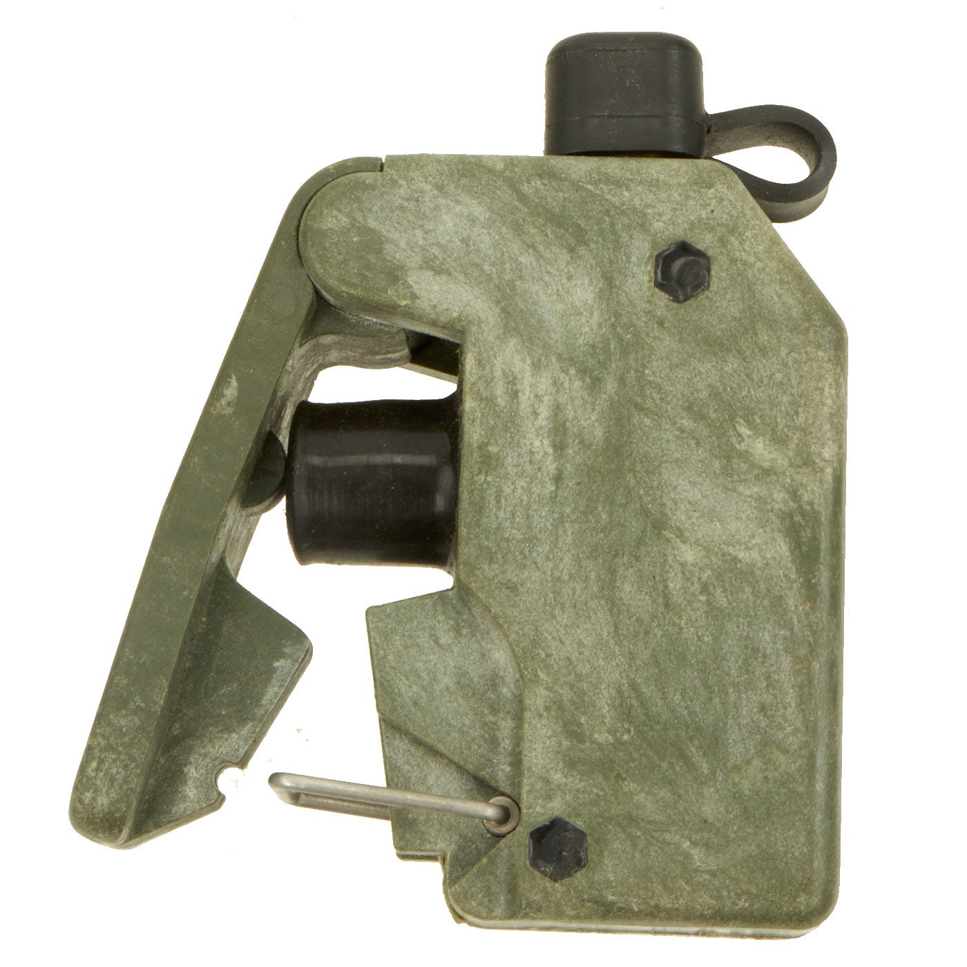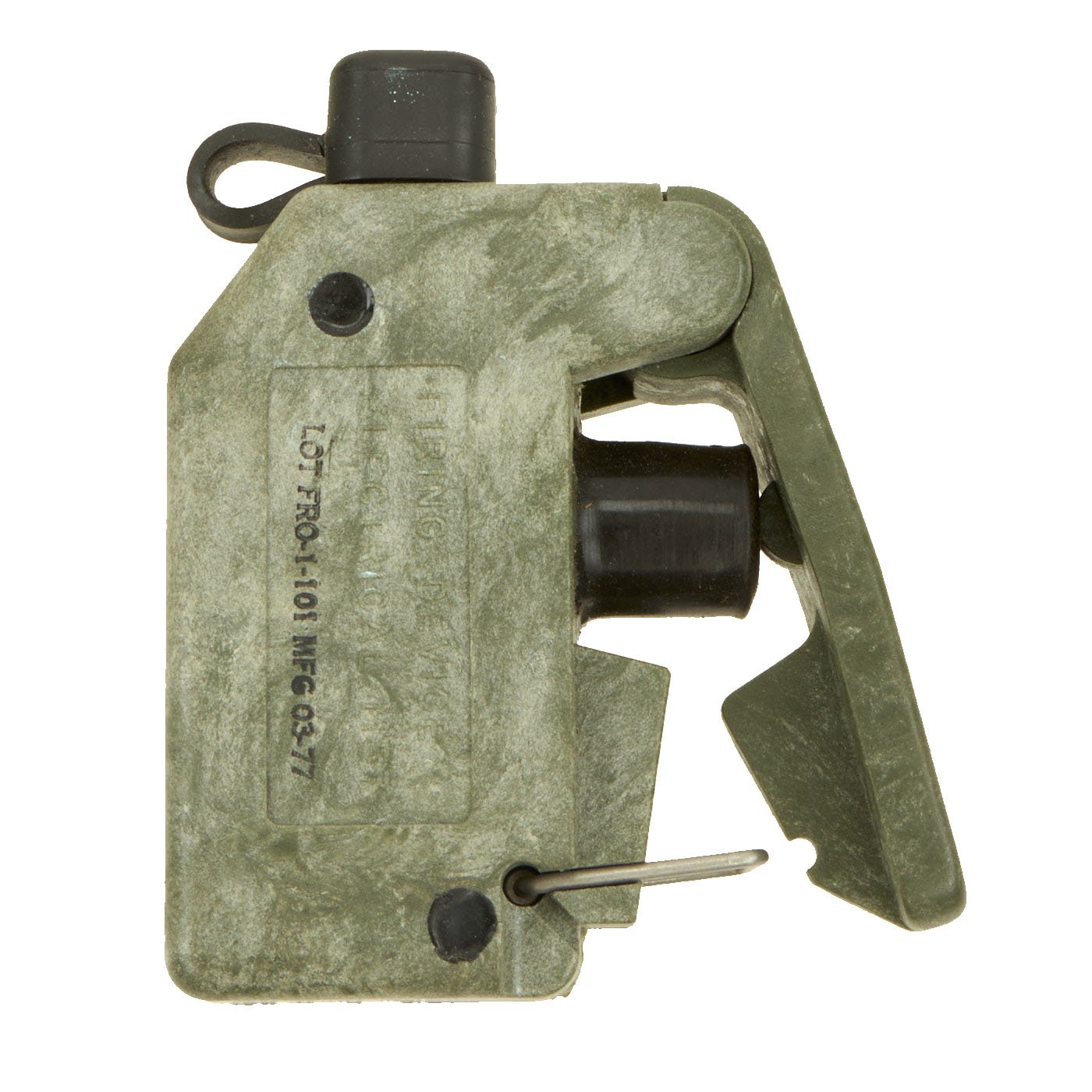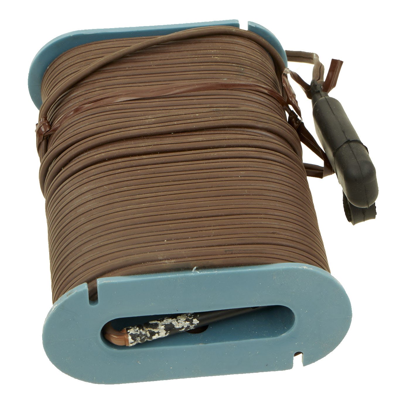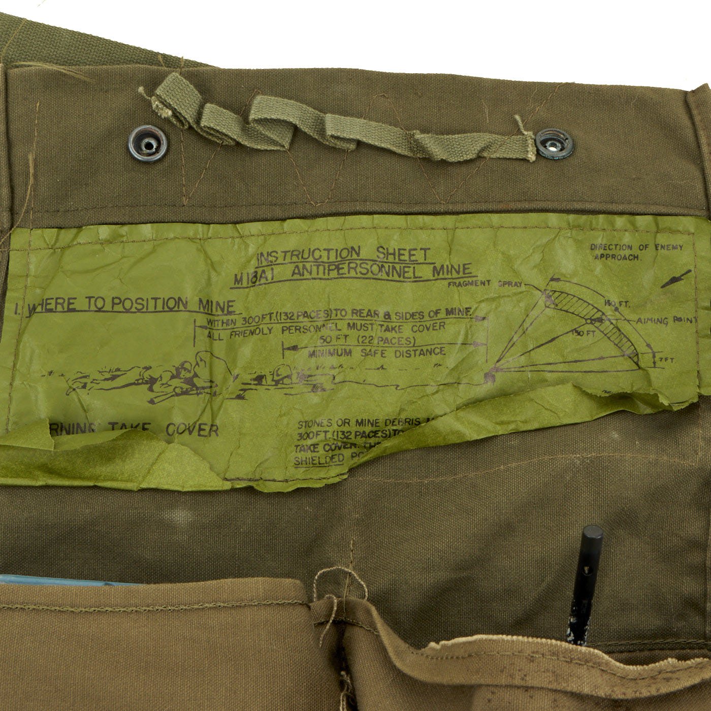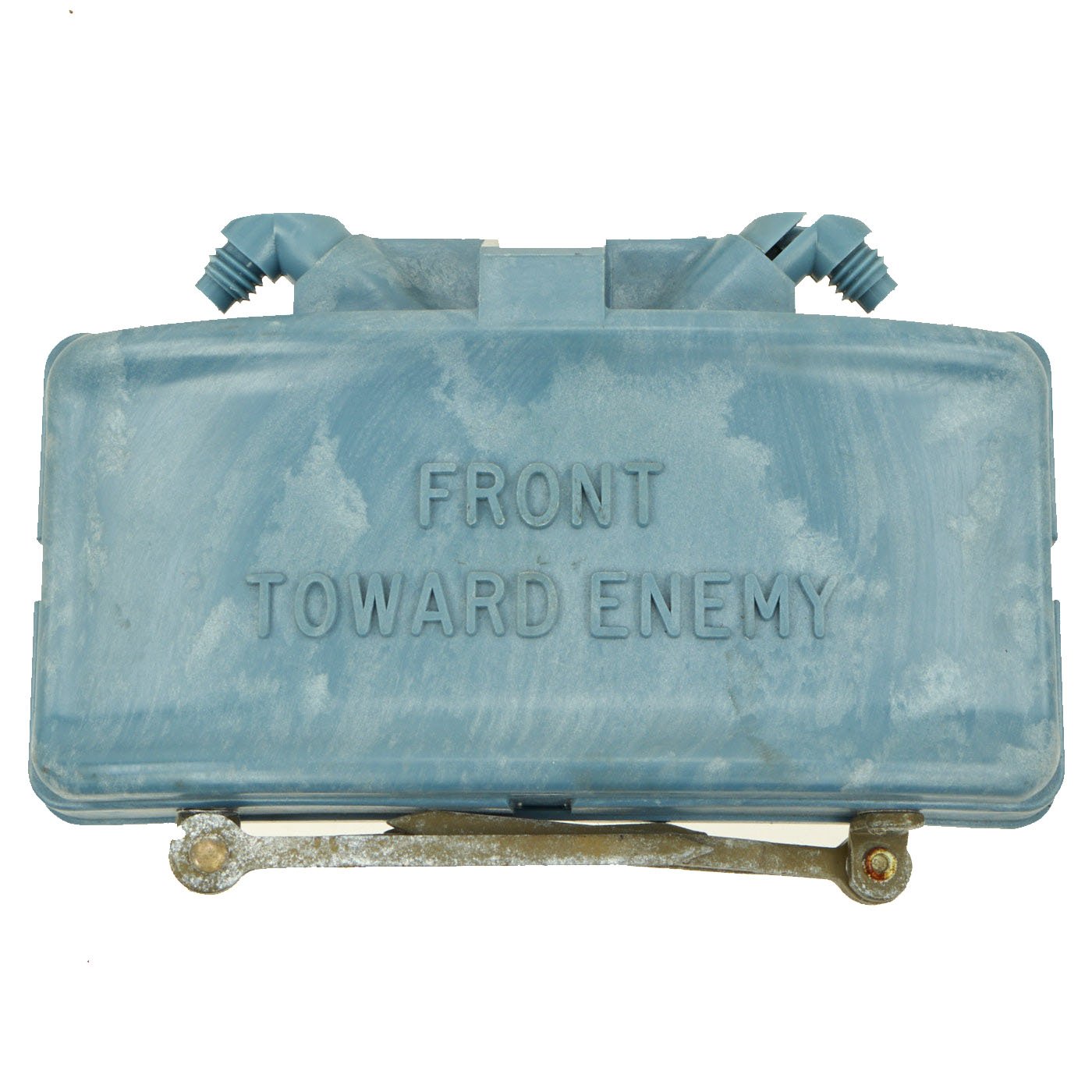 This example is in excellent condition, and shows little sign of use, just some oxidation on the metal components from decades of storage. The mine itself is cast blue plastic and reverse of the mine reads PRACTICE BACK M-33 APERS MINE. It still retains the original fold out support legs as well as the wire connectors. There are no cracks or other damage to the plastic, just some light scuffing.