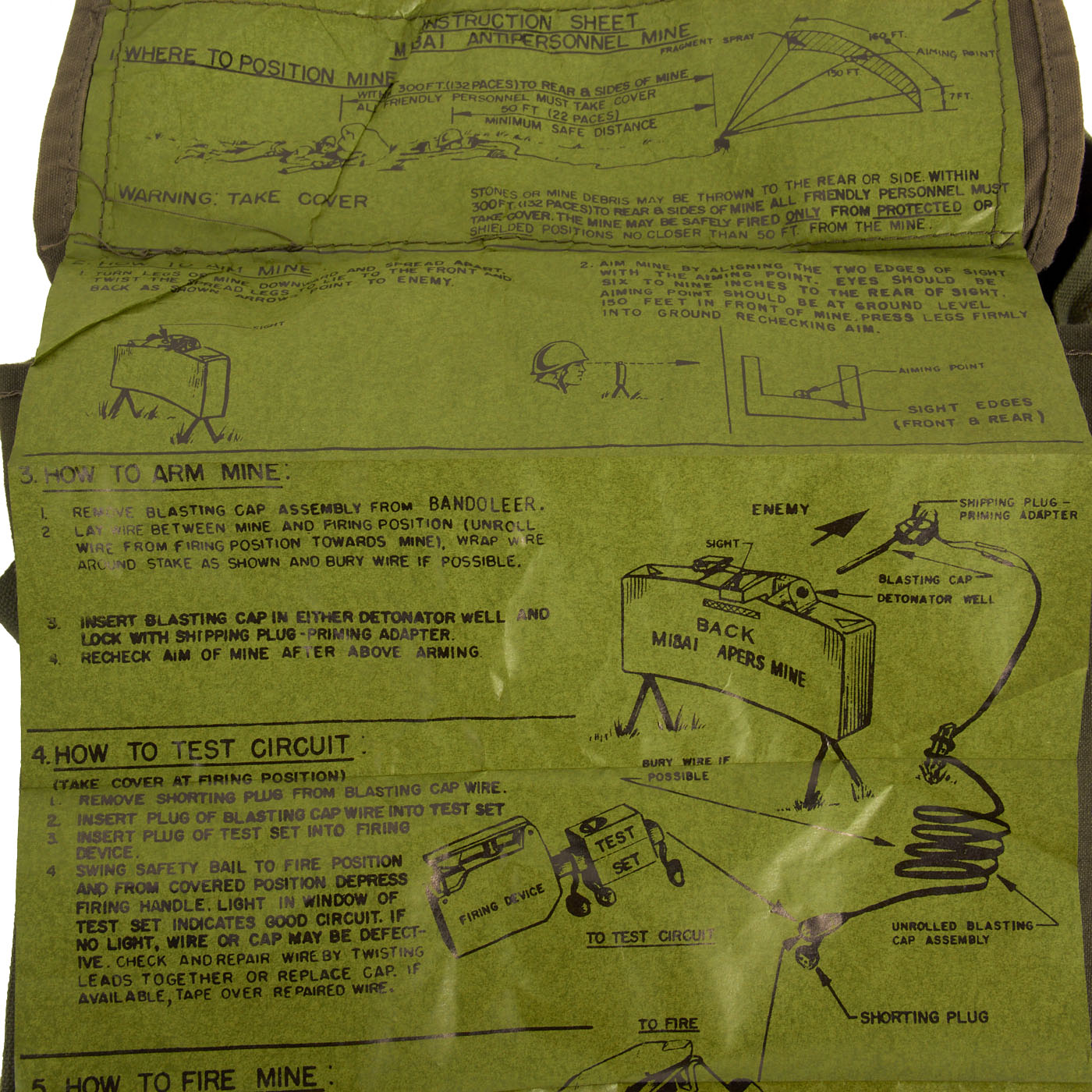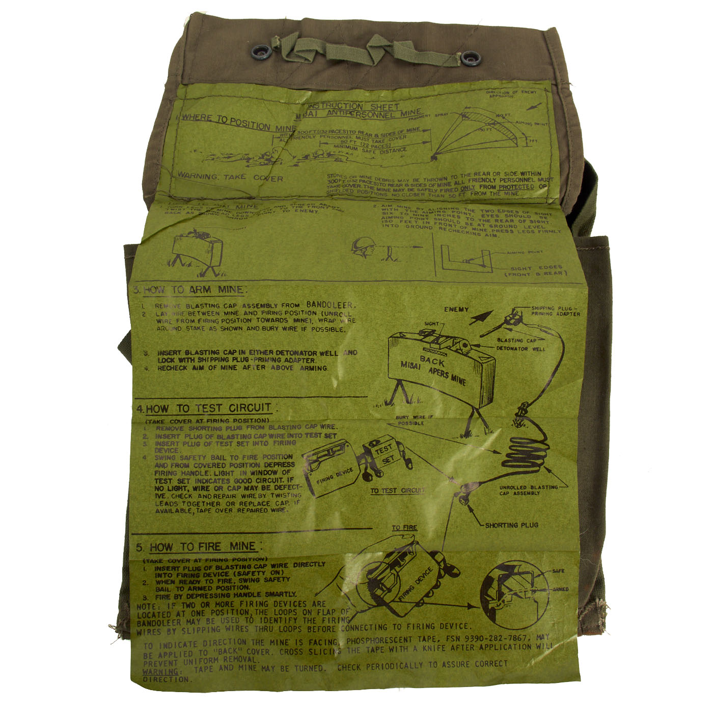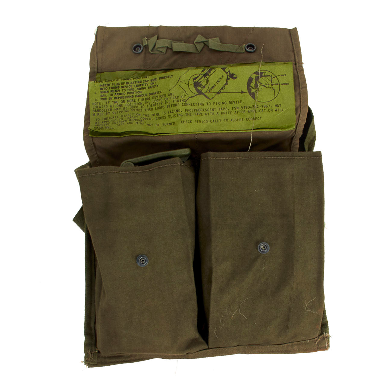 The M57 clacker appears to function and lights up as expected, the blasting cap and wire is complete. The bag is in very good condition with an intact fold out label. Overall a very nice complete condition set of a rare and essential Vietnam Era training set.